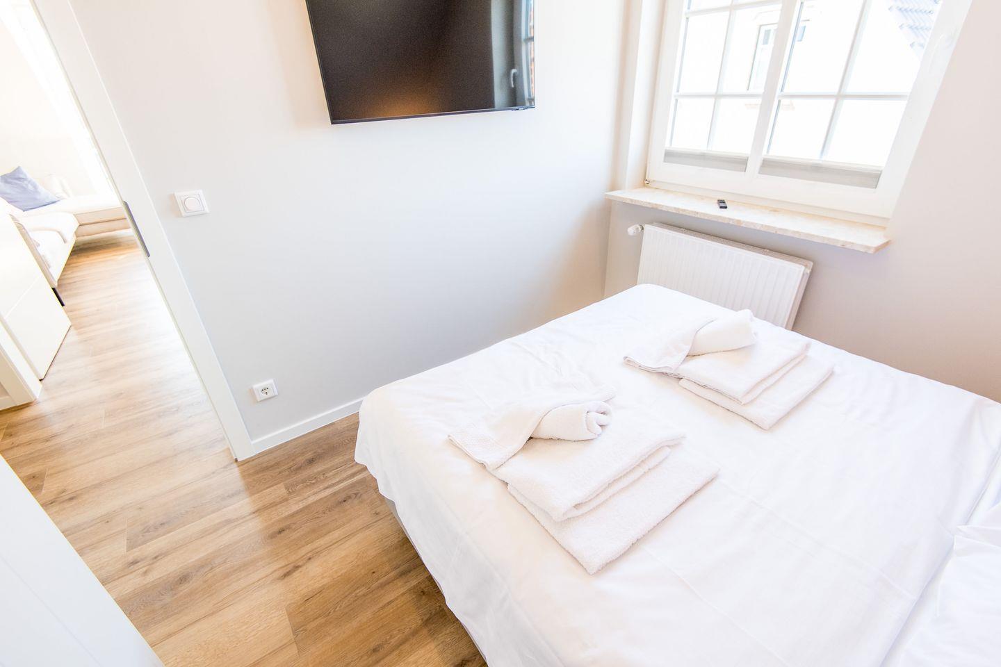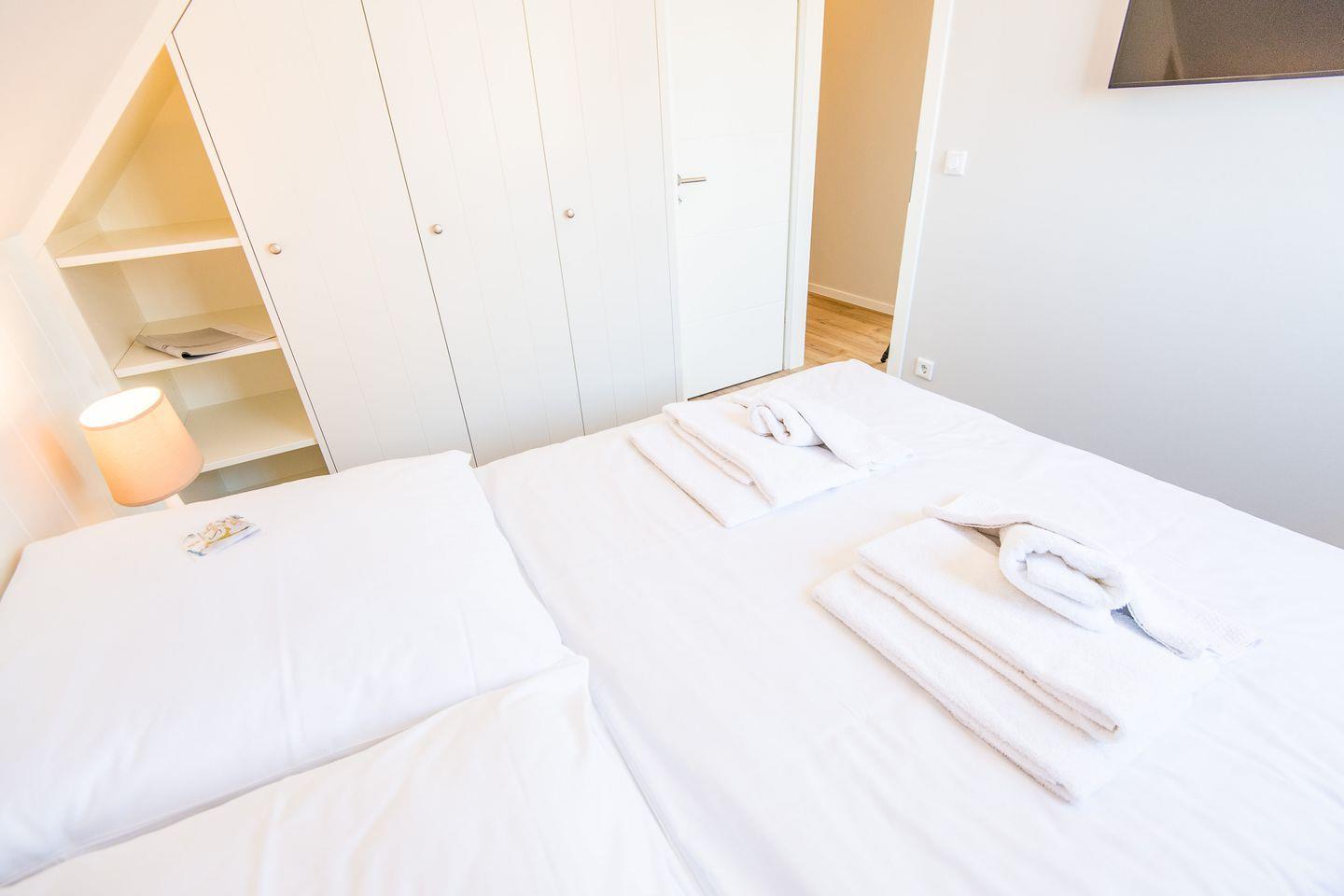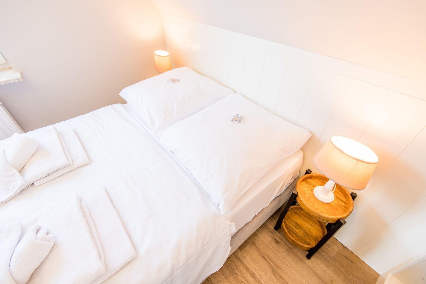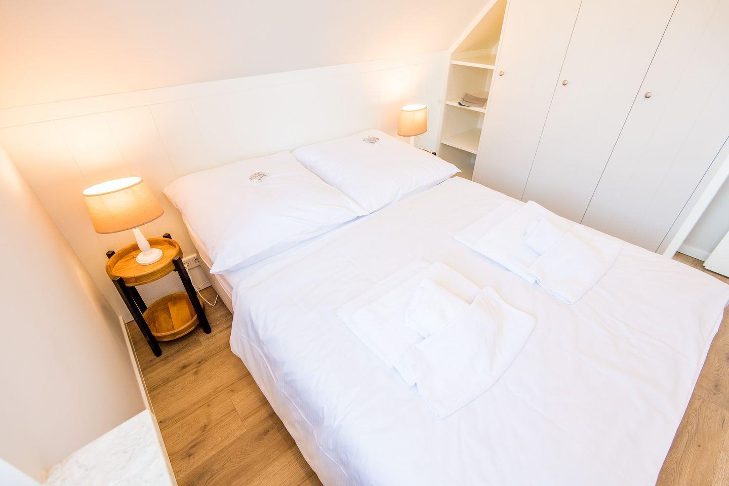 Das erste Schlafzimmer im Obergeschoss bietet ein Doppelbett (140x200 cm), einen Kleiderschrank und einen TV. Das zweite, halboffene Schlafzimmer im Dachgeschoss ist mit einem Doppelbett (160x200 cm) und einem Kleiderschrank ausgestattet und verspricht ebenfalls einen ruhigen Rückzugsort.