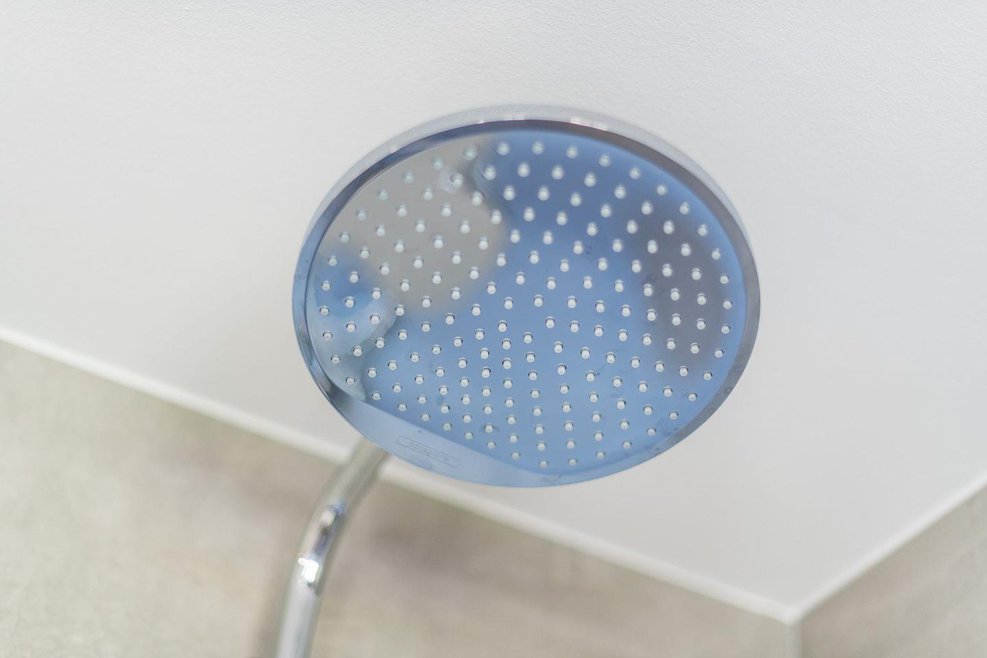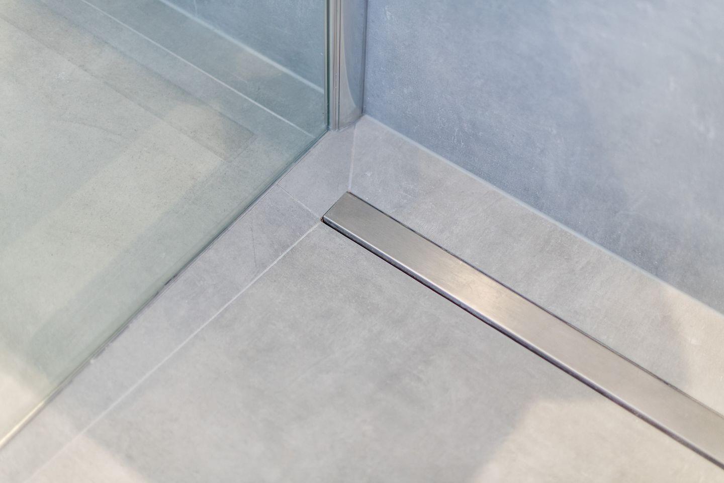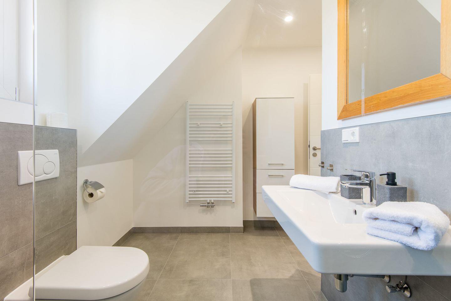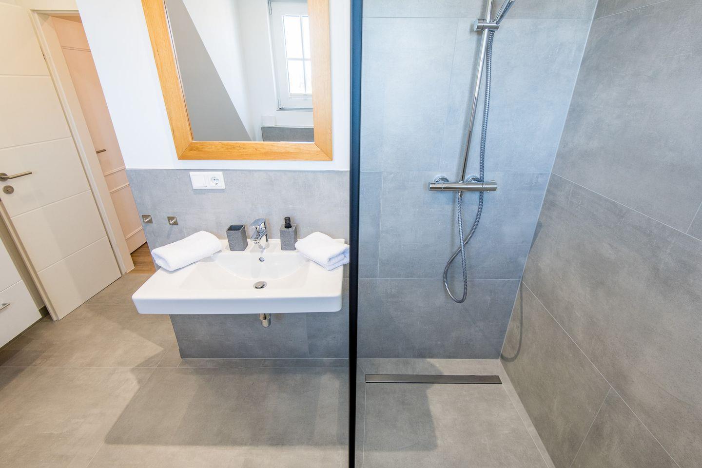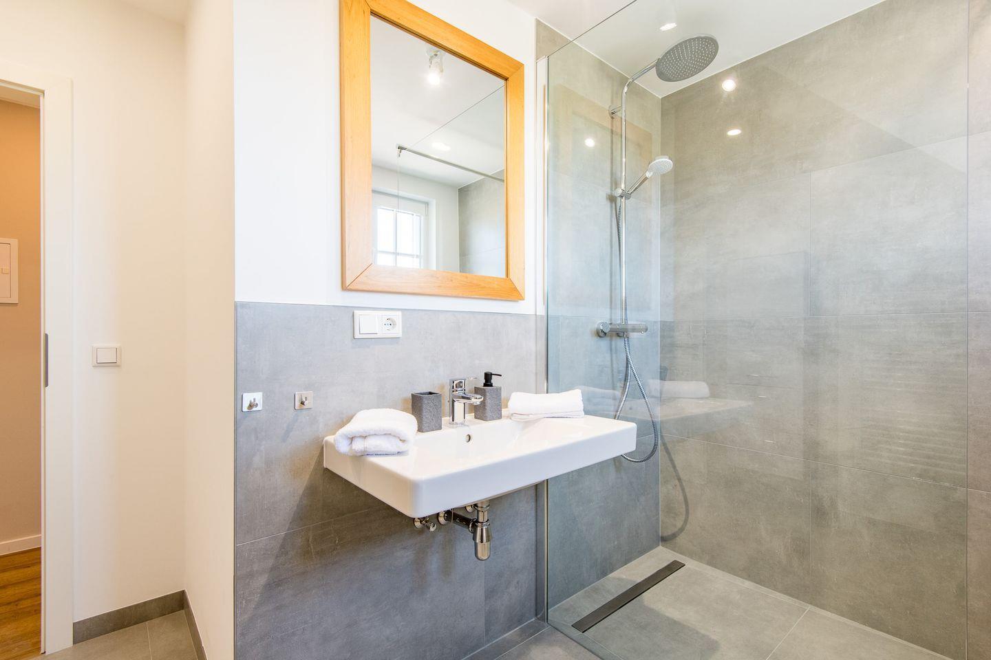 Das Badezimmer verfügt über eine bodengleiche Dusche, ein WC und Tageslicht.