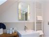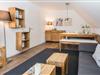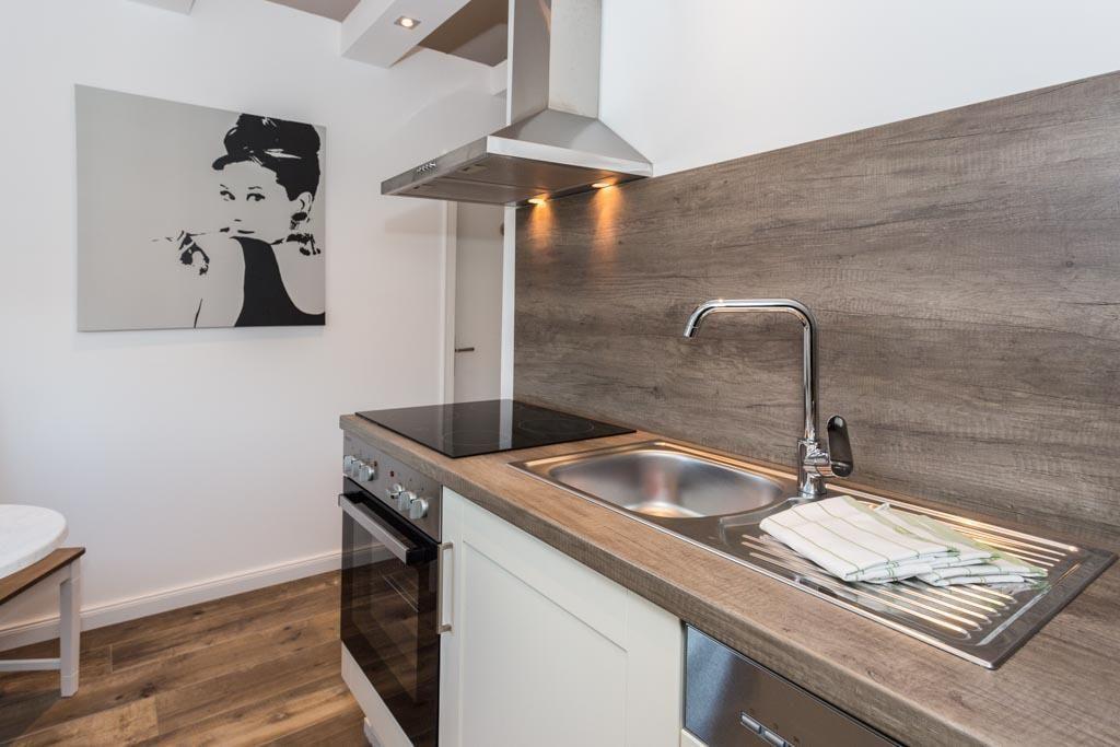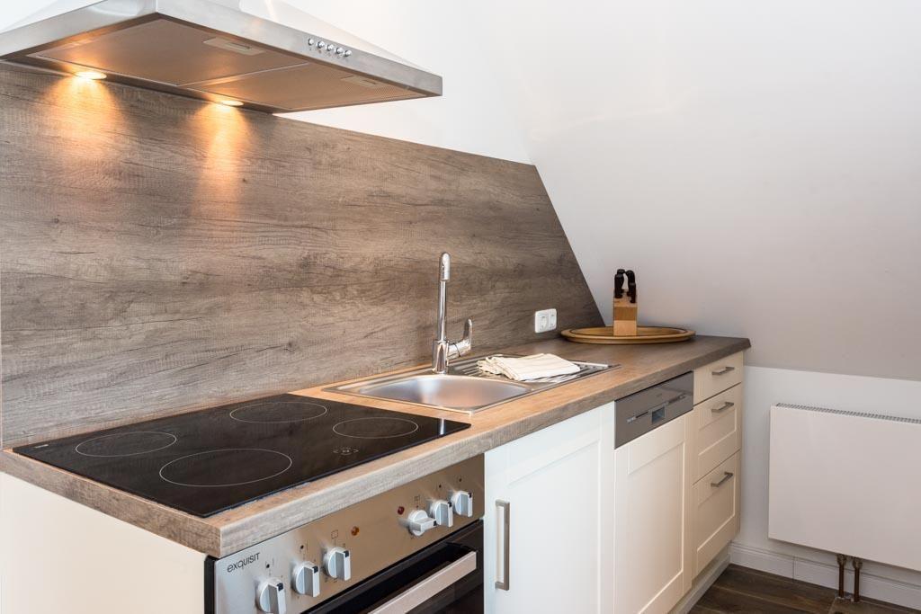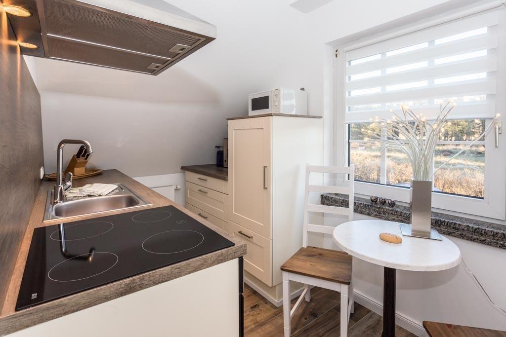 Die separate, moderne Küche ist bestens ausgestattet und bietet ein Cerankochfeld, Geschirrspüler, Mikrowelle und eine Filterkaffeemaschine, sodass Sie in aller Ruhe Ihre Mahlzeiten zubereiten können. Eine kleine Essecke für zwei Personen rundet den gemütlichen Raum ab.