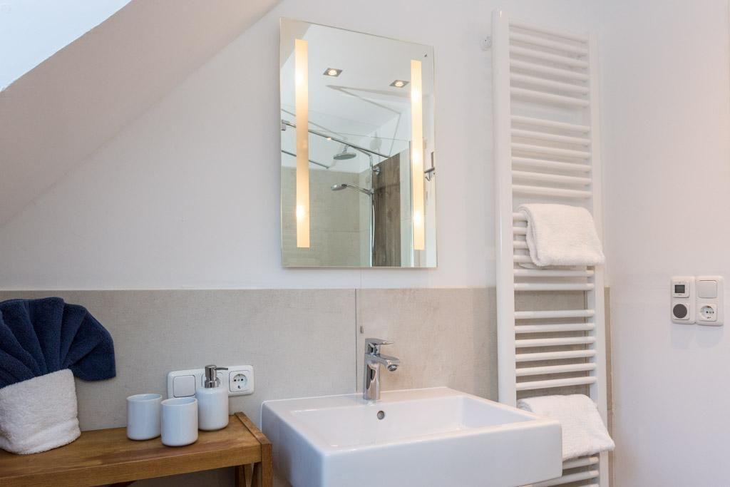 Das Badezimmer ist mit einer Dusche, WC, Föhn und einem Handtuchwärmer ausgestattet. Ein Fenster bringt Tageslicht ins Bad und schafft eine helle, freundliche Atmosphäre.