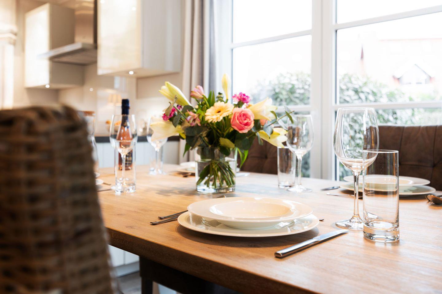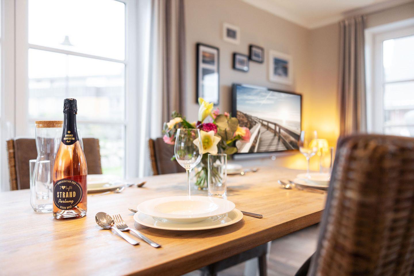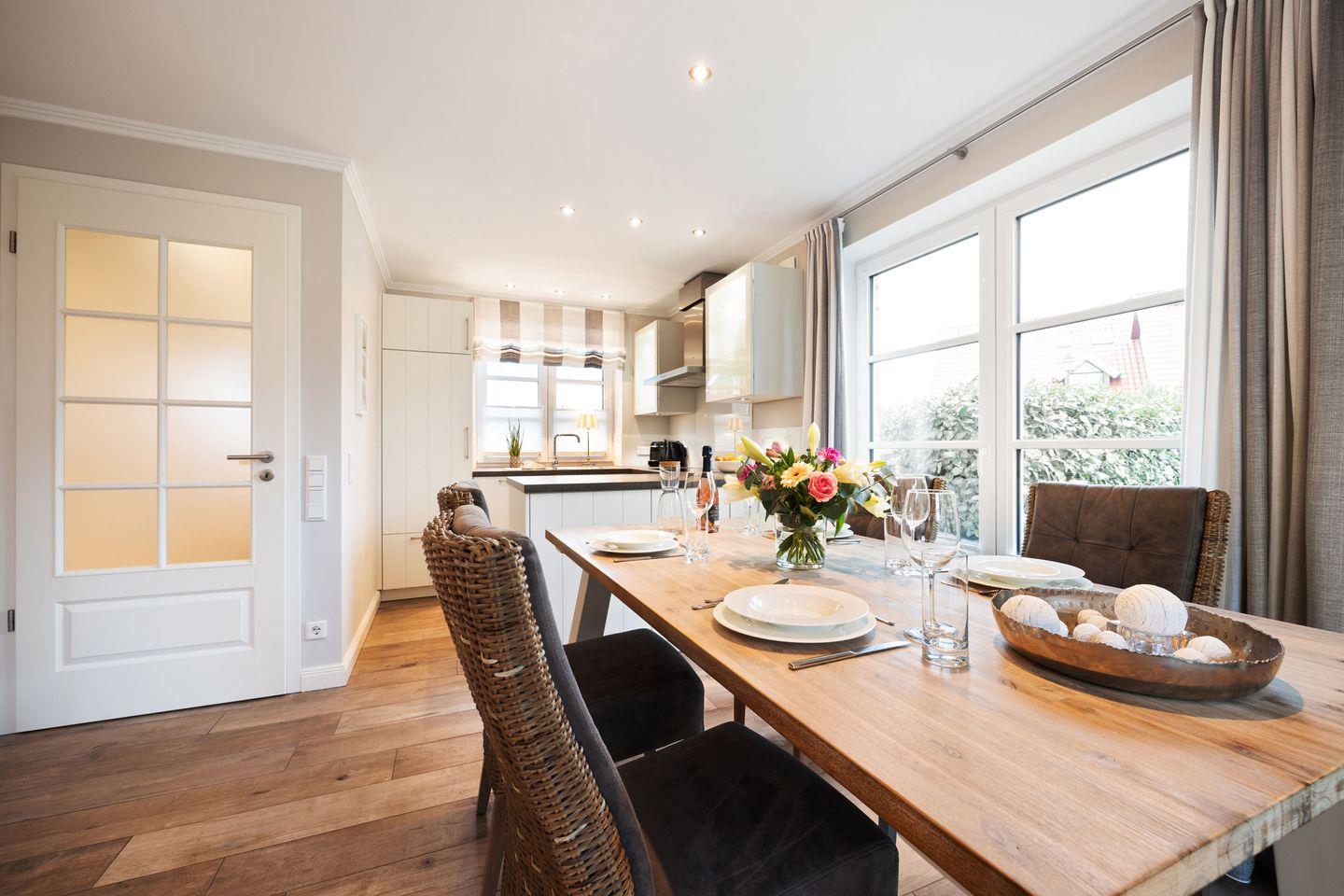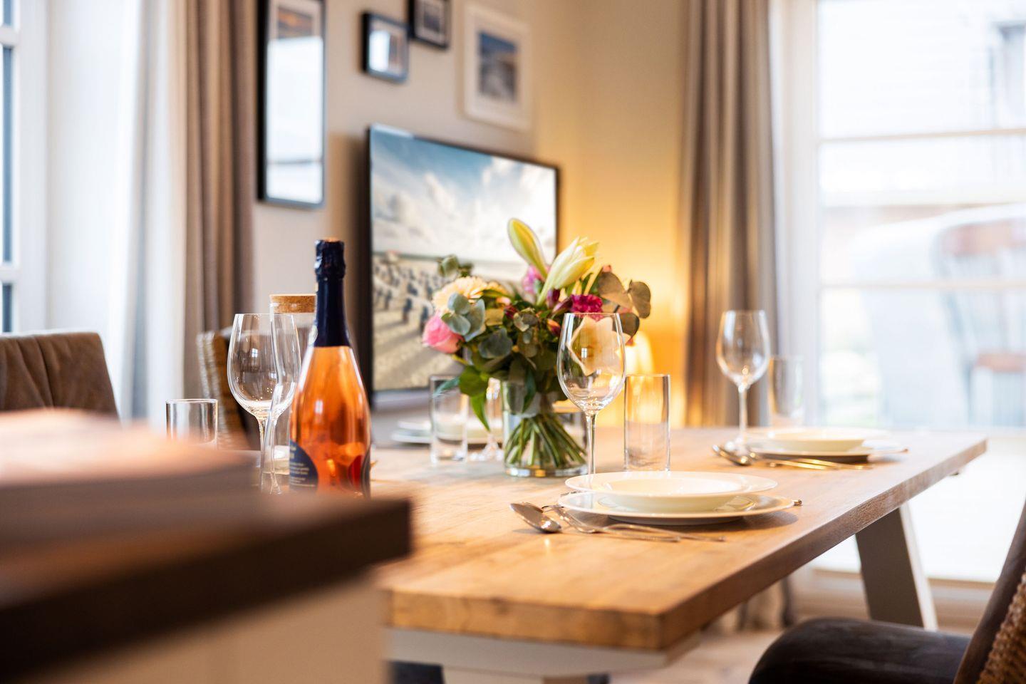 Im Erdgeschoss erwartet Sie ein stilvoll gestalteter Wohn- und Essbereich mit einem großen Esstisch für 4 Personen sowie einer gemütlichen Sofaecke mit TV. Durch den direkten Zugang zur möblierten Gartenterrasse nach Süden können Sie sonnige Tage und laue Abende im Freien verbringen.