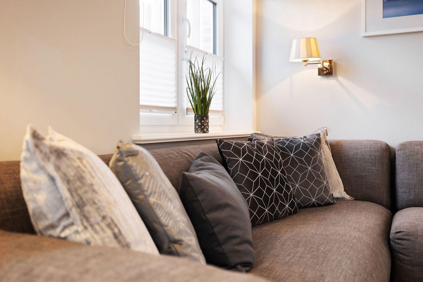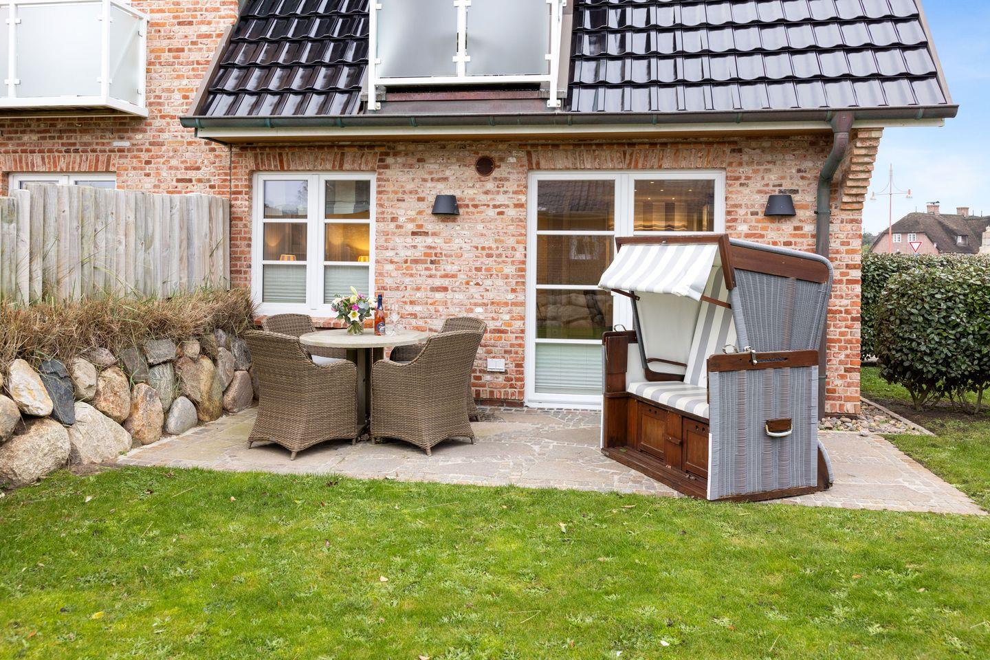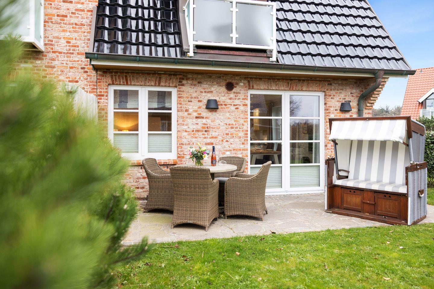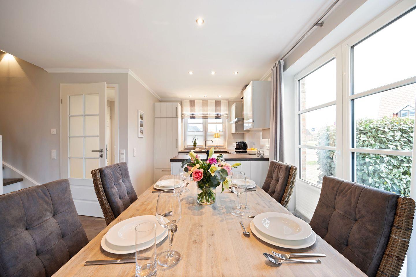 Im Erdgeschoss erwartet Sie ein stilvoll gestalteter Wohn- und Essbereich mit einem großen Esstisch für 4 Personen sowie einer gemütlichen Sofaecke mit TV. Durch den direkten Zugang zur möblierten Gartenterrasse nach Süden können Sie sonnige Tage und laue Abende im Freien verbringen.