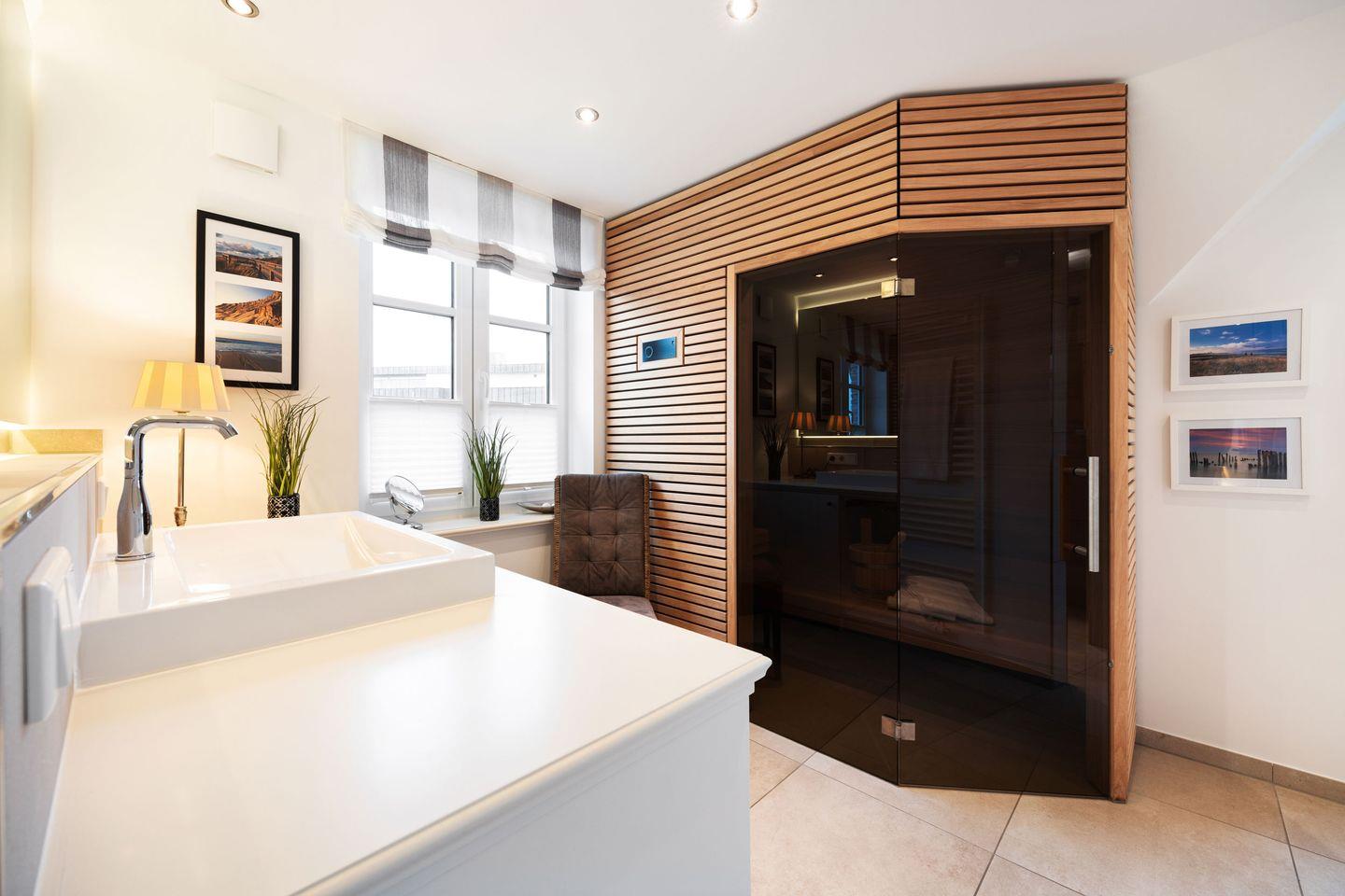 Das Badezimmer ist mit einer ebenerdigen Dusche, einem WC, einer Sauna und einem Waschtrockner ausgestattet. Ein Handtuchwärmer, Föhn und Tageslicht sorgen für zusätzlichen Komfort, und ein direkter Zugang zum Südbalkon ermöglicht entspannende Momente an der frischen Luft. Ein zusätzliches Duschbad mit ebenerdiger Dusche, WC und Tageslicht im Dachgeschoss ergänzt das Wohlfühlangebot.