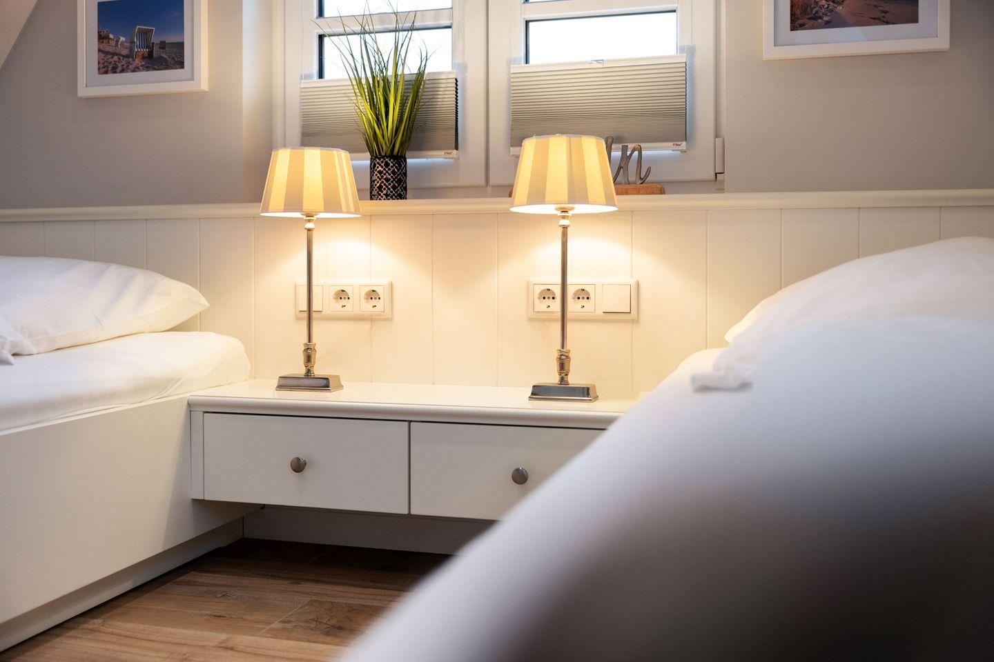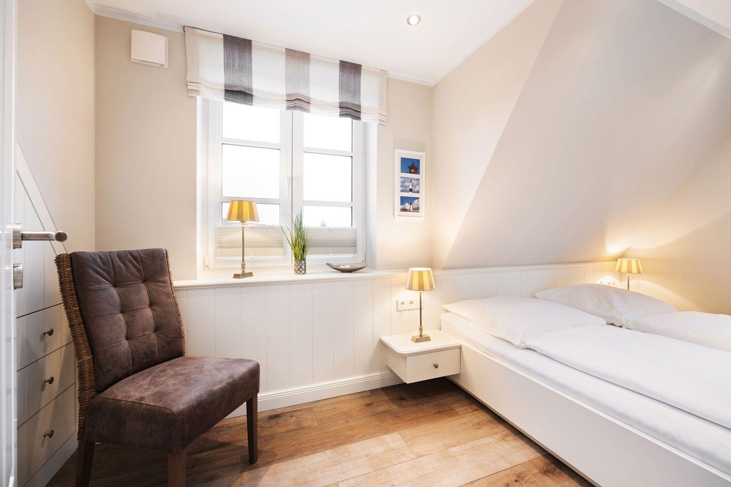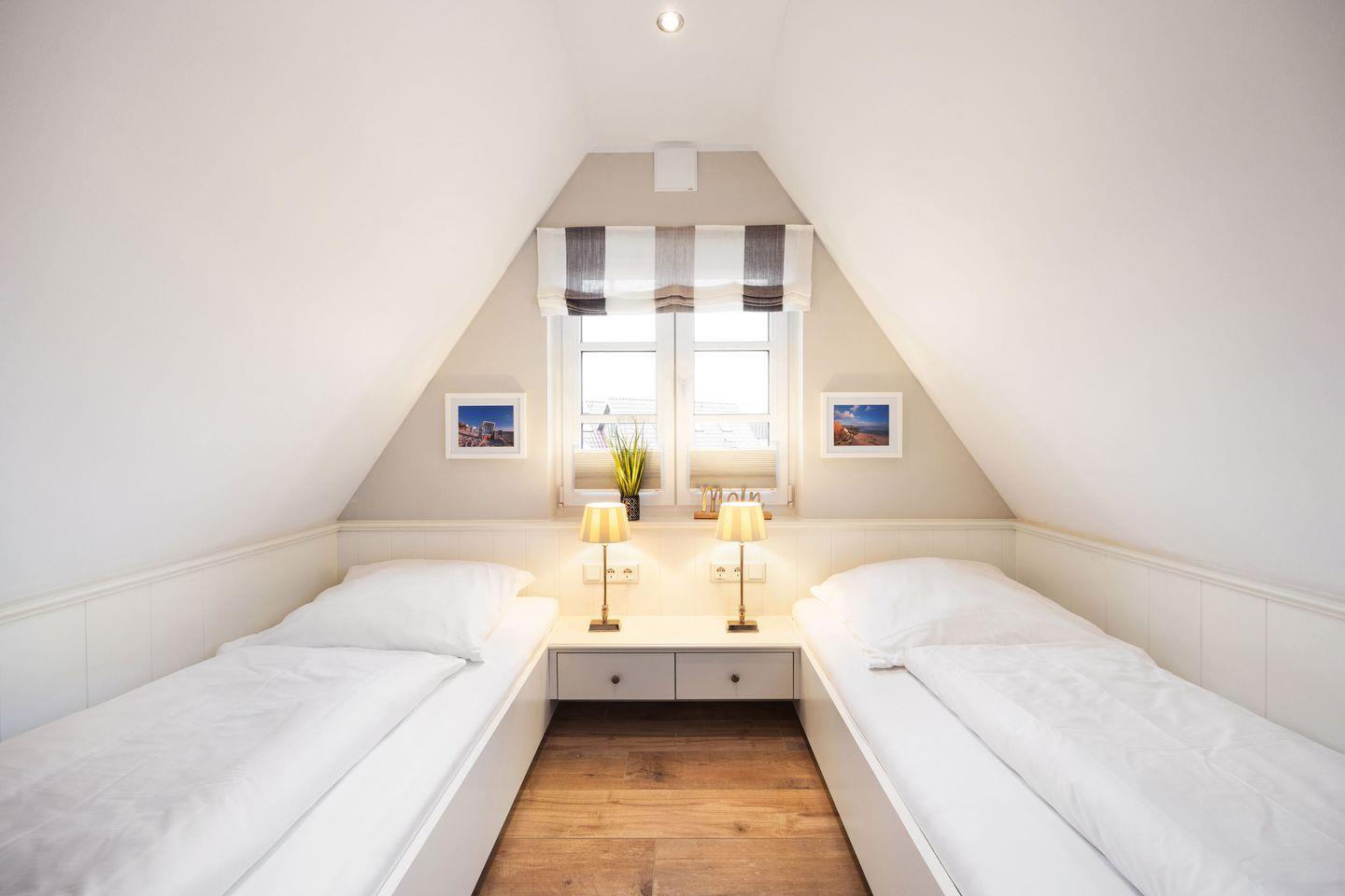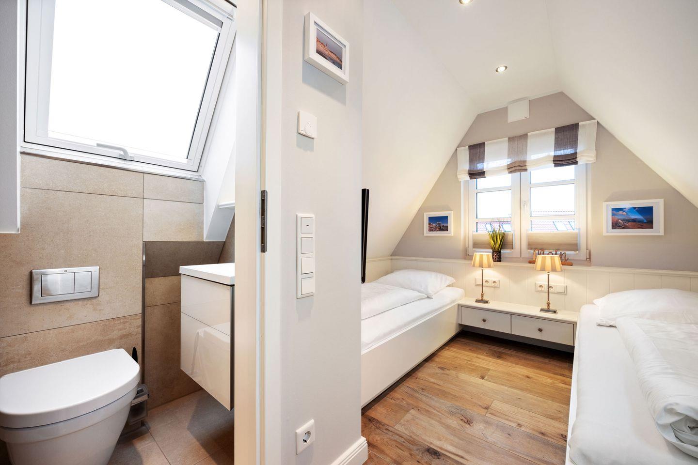 Im Obergeschoss befinden sich zwei komfortabel eingerichtete Schlafzimmer. Das Hauptschlafzimmer ist mit einem Doppelbett (2x 90x200 cm), einem Einbauschrank und einem TV ausgestattet und bietet zudem direkten Zugang zum Badezimmer. Das zweite Schlafzimmer verfügt über zwei Einzelbetten (je 90x200 cm), ebenfalls mit Kleiderschränken und einem TV.