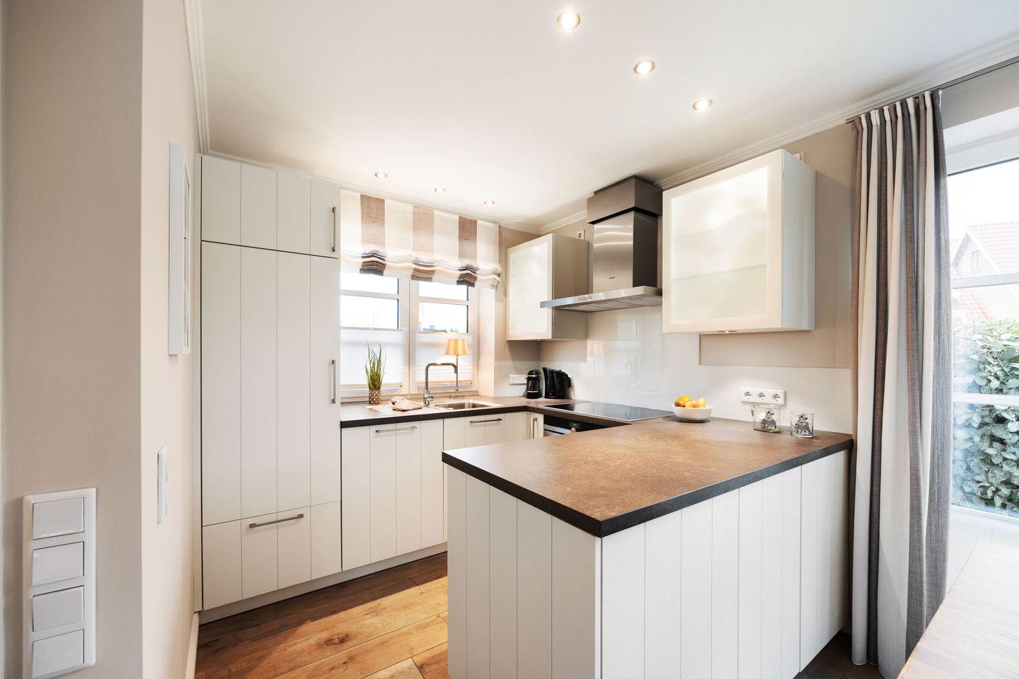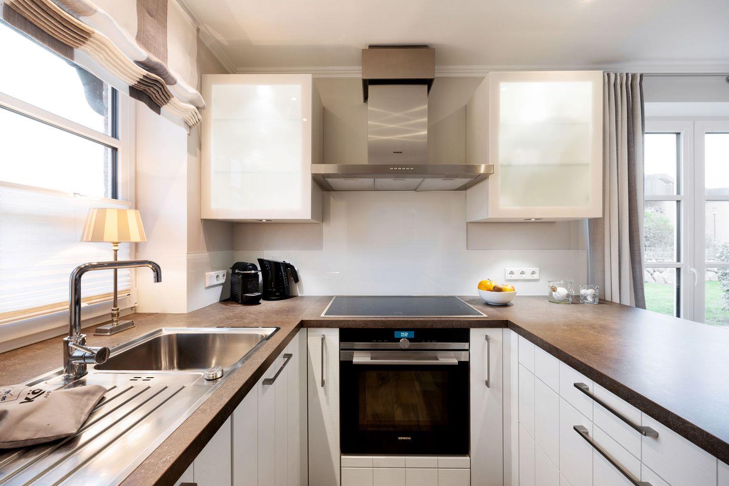 Die offene, modern ausgestattete Küche bietet alles, was das Herz begehrt: Geschirrspüler, Filterkaffeemaschine, Nespresso-Maschine, modernen Herd und weitere Annehmlichkeiten, die das Kochen und Genießen einfach machen.