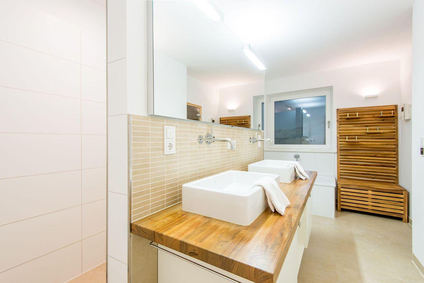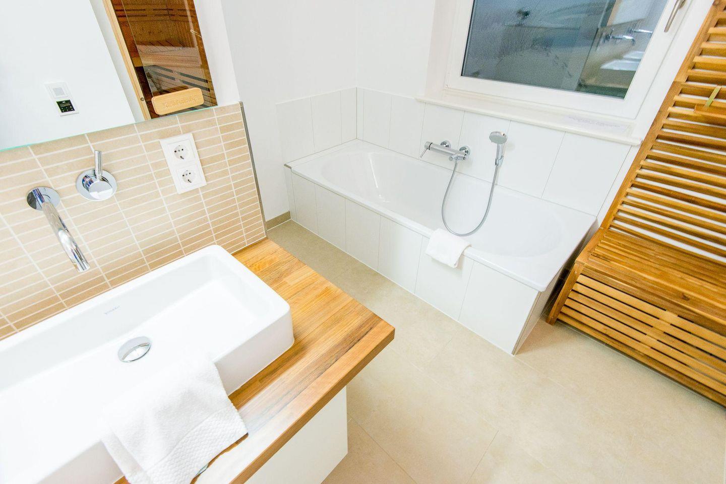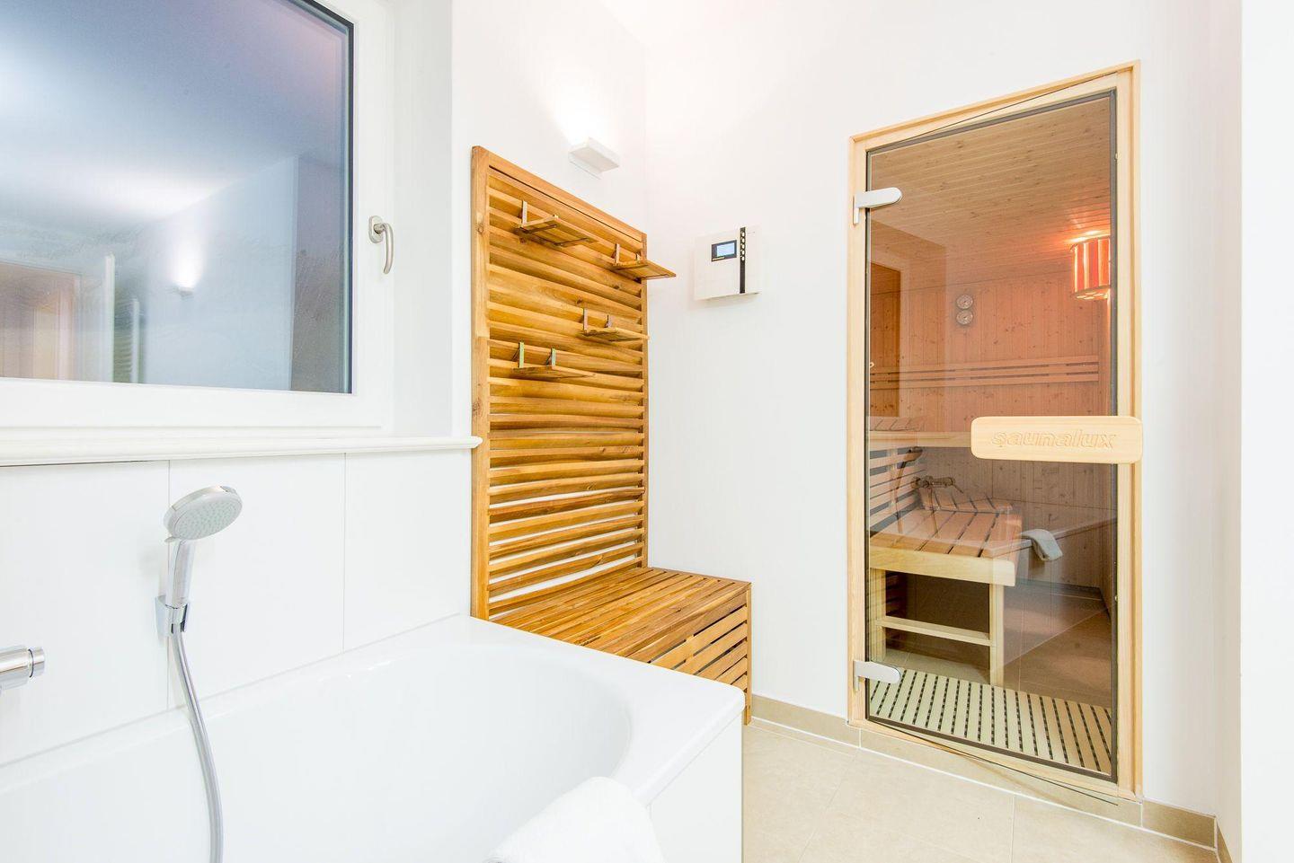 Das luxuriöse Badezimmer bietet eine Badewanne, eine ebenerdige Regendusche und eine Sauna für erholsame Stunden. Das Tageslicht sorgt für eine angenehme Atmosphäre, und ein separates Gäste-WC im Eingangsbereich rundet den Komfort ab. Eine Waschkammer mit Waschtrockner ist ebenfalls vorhanden.