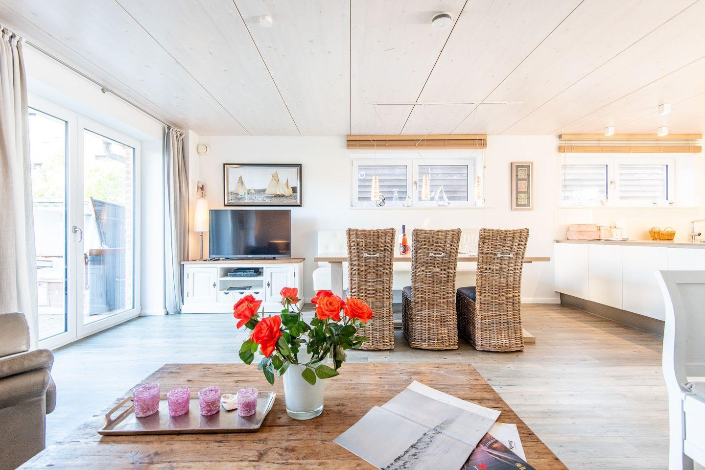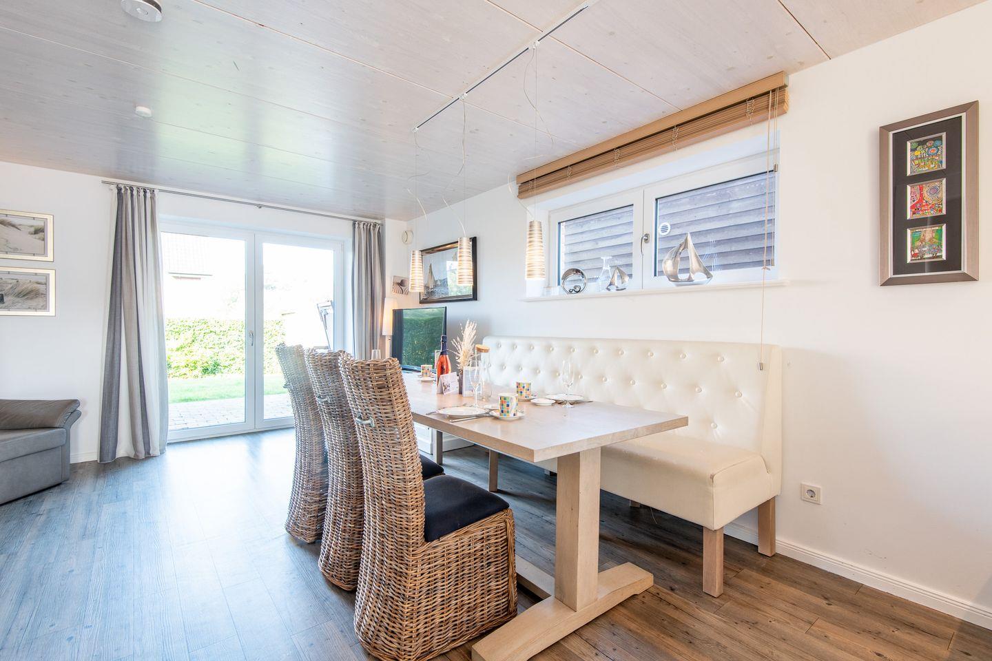 Das geräumige Wohnzimmer mit einem bequemen Ledersofa und großem TV bietet direkten Zugang zur sonnigen Westterrasse und dem gepflegten Garten mit Strandkorb. Der Essbereich mit einem stilvollen Tisch und einer Ledersitzbank für vier Personen lädt zu gemütlichen Mahlzeiten ein.