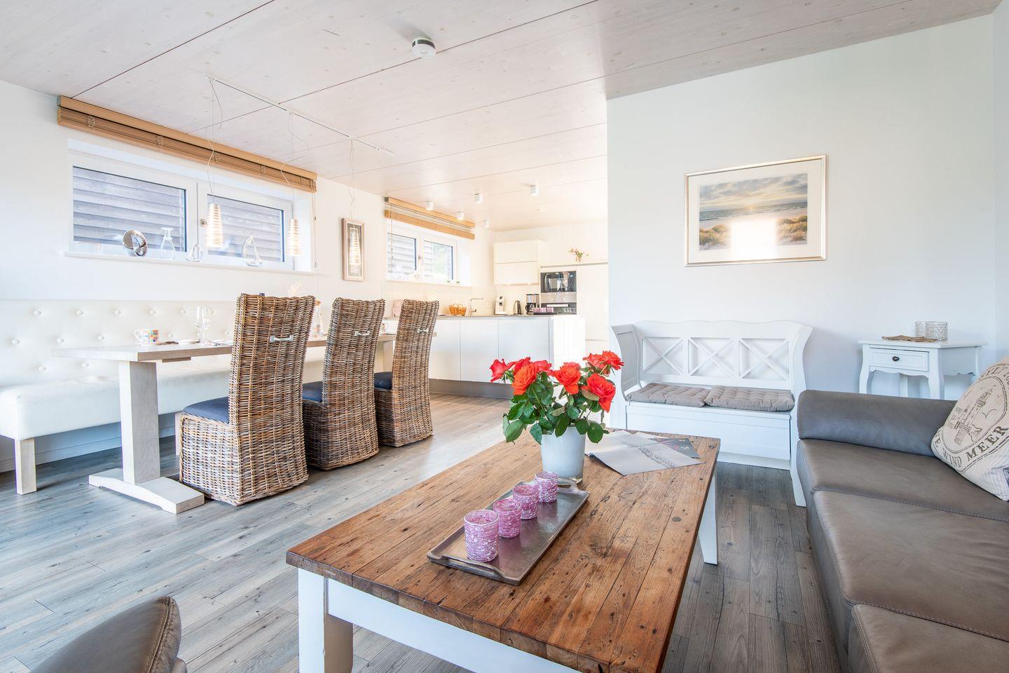 2 Schlafzimmer, 1 Badezimmer mit Dusche, Badewanne und Sauna, Gäste-WC, offene Küche zum Wohn-/Essbereich und Zugang zur West-Terrasse mit Garten und Strandkorb, PKW-Stellplatz, WLAN (ohne Gewähr) vorhanden, Hunde willkommen.