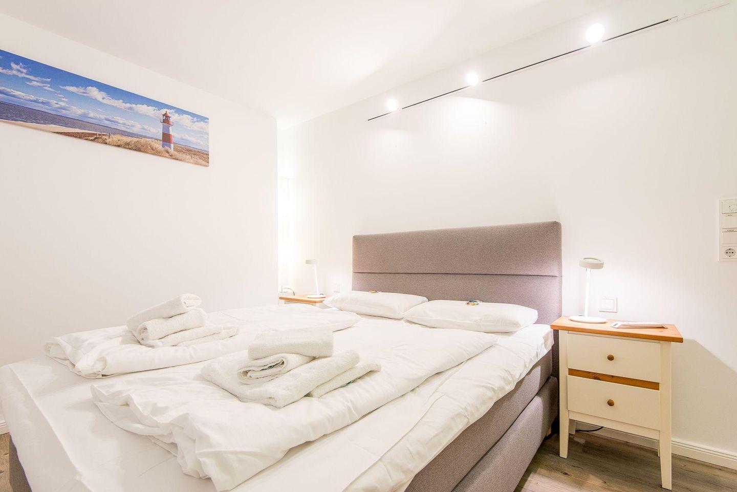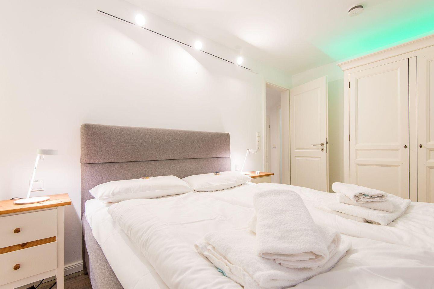 Das erste Schlafzimmer ist mit einem komfortablen Doppelbett (180x200 cm), einem geräumigen Kleiderschrank, einer Kommode und einem TV eingerichtet. Das zweite Schlafzimmer verfügt über ein Doppelbett (160x200 cm), einen Kleiderschrank, ein stimmungsvolles Entspannungslicht und ebenfalls einen TV – der ideale Rückzugsort nach einem ereignisreichen Urlaubstag.