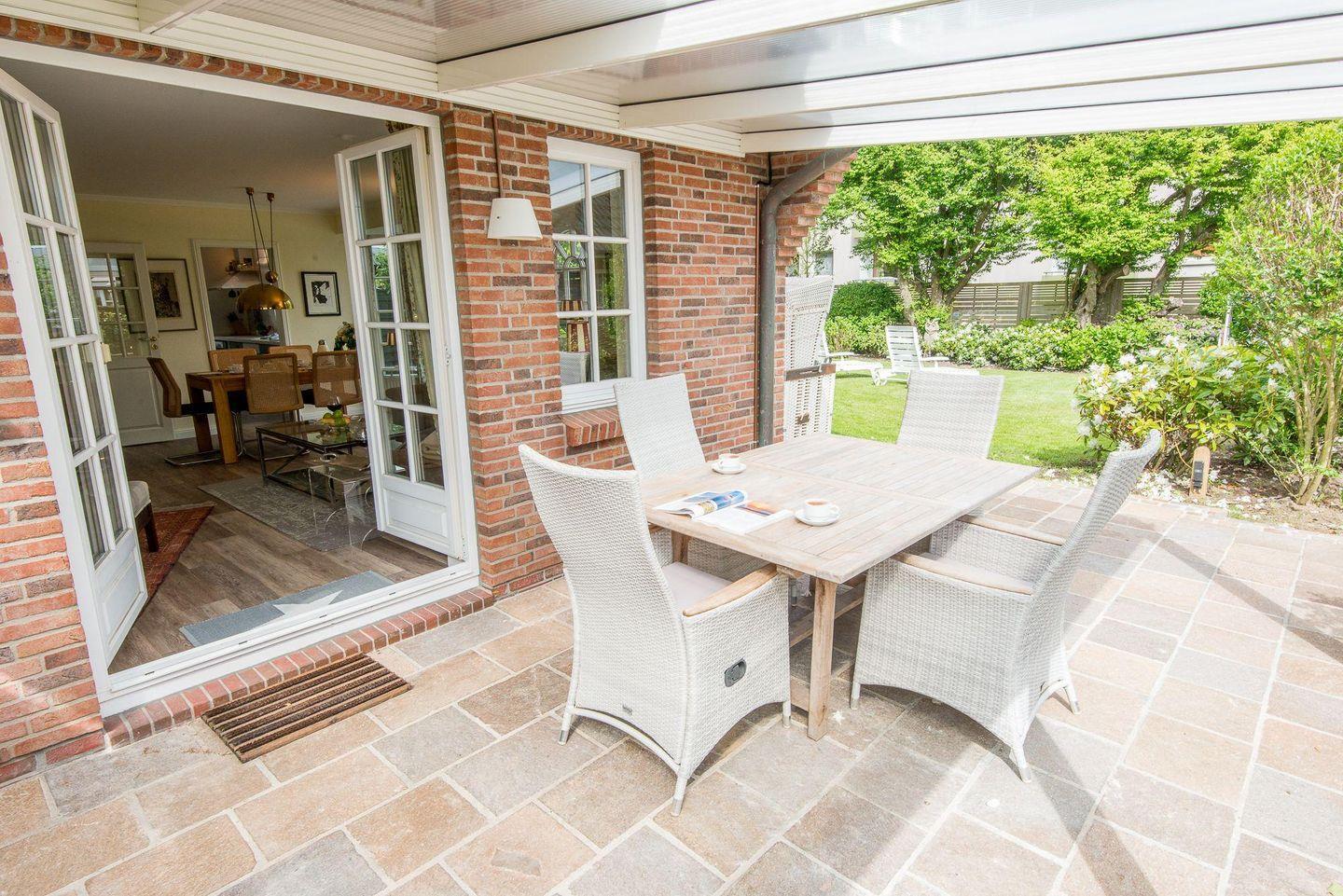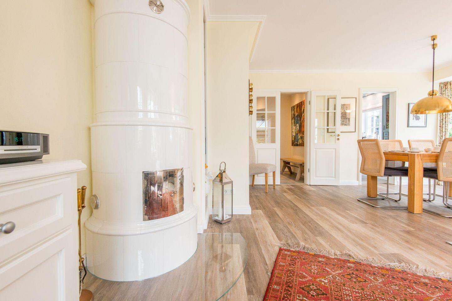 Im stilvoll eingerichteten Wohnzimmer erwarten Sie ein großzügiges Ecksofa, ein Sessel sowie ein original schwedischer Kachelofen für gemütliche Abende. Der einladende Esstisch mit vier Stühlen bietet Platz für gemeinsame Mahlzeiten, und der TV sorgt für Unterhaltung. Der direkte Zugang führt Sie zum Garten, zur Terrasse nach Osten sowie zur möblierten und überdachten Terrasse nach Süden.