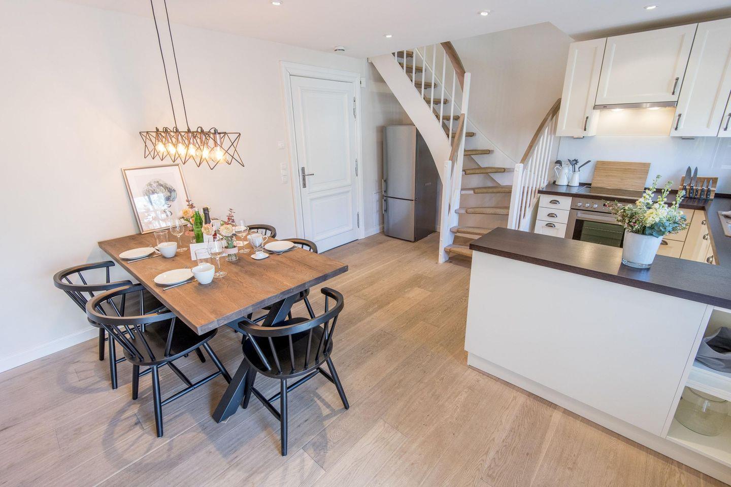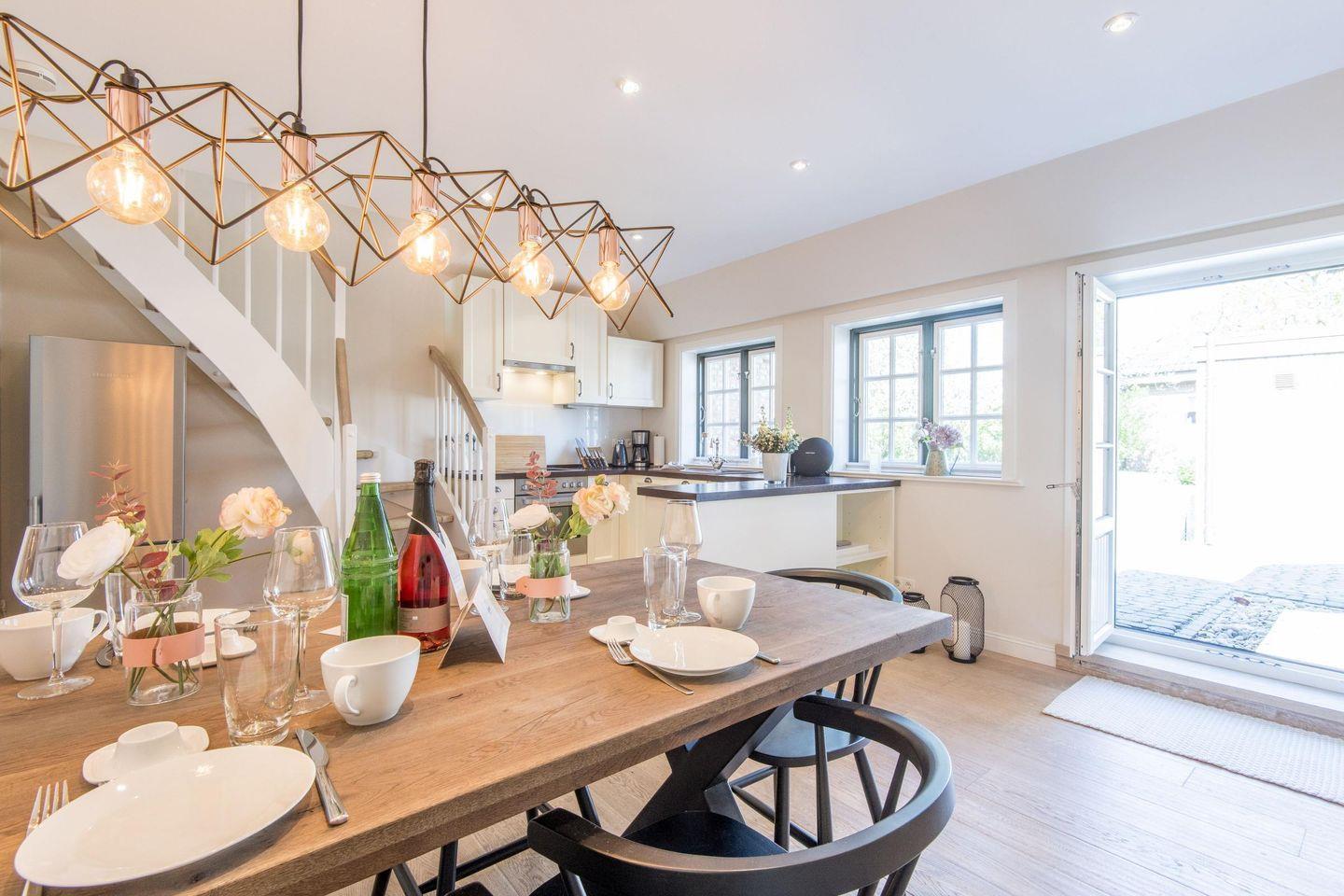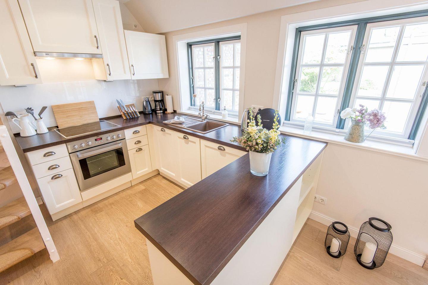 Die moderne, offen gestaltete Küche verfügt über einen Induktionsherd, eine Filterkaffeemaschine und eine komfortable Sitzecke für bis zu 6 Personen. Hier ist jeder erdenkliche Komfort geboten, sodass die Selbstversorgung leichtfällt und Spaß macht.
