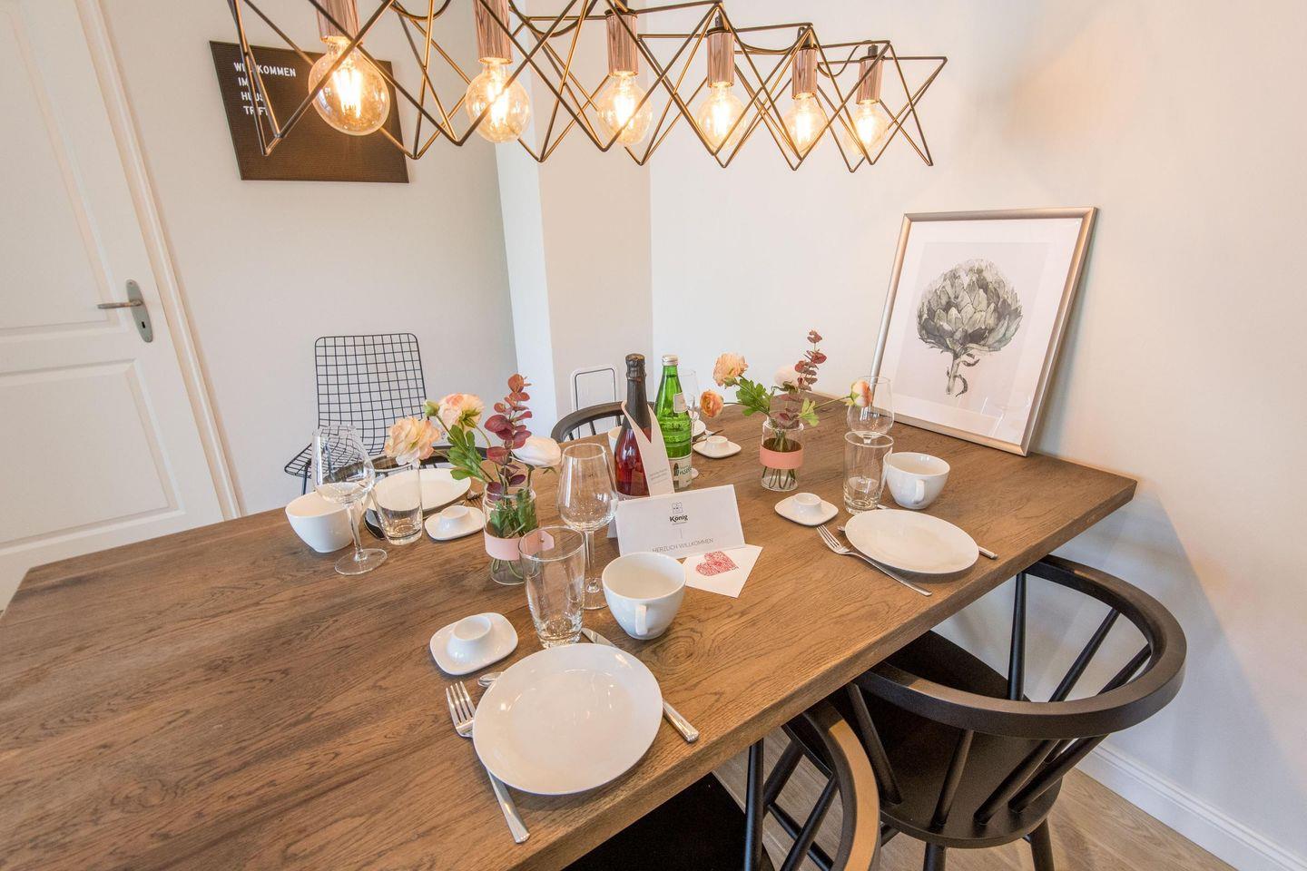 Das helle Wohnzimmer im Obergeschoss mit gemütlichem Ecksofa, Einbauschränken und Smart-TV lädt zu erholsamen Stunden ein. Von der Küche im Erdgeschoss aus erreichen Sie die sonnige Terrasse, auf der Sie entspannte Tage im Freien genießen können.