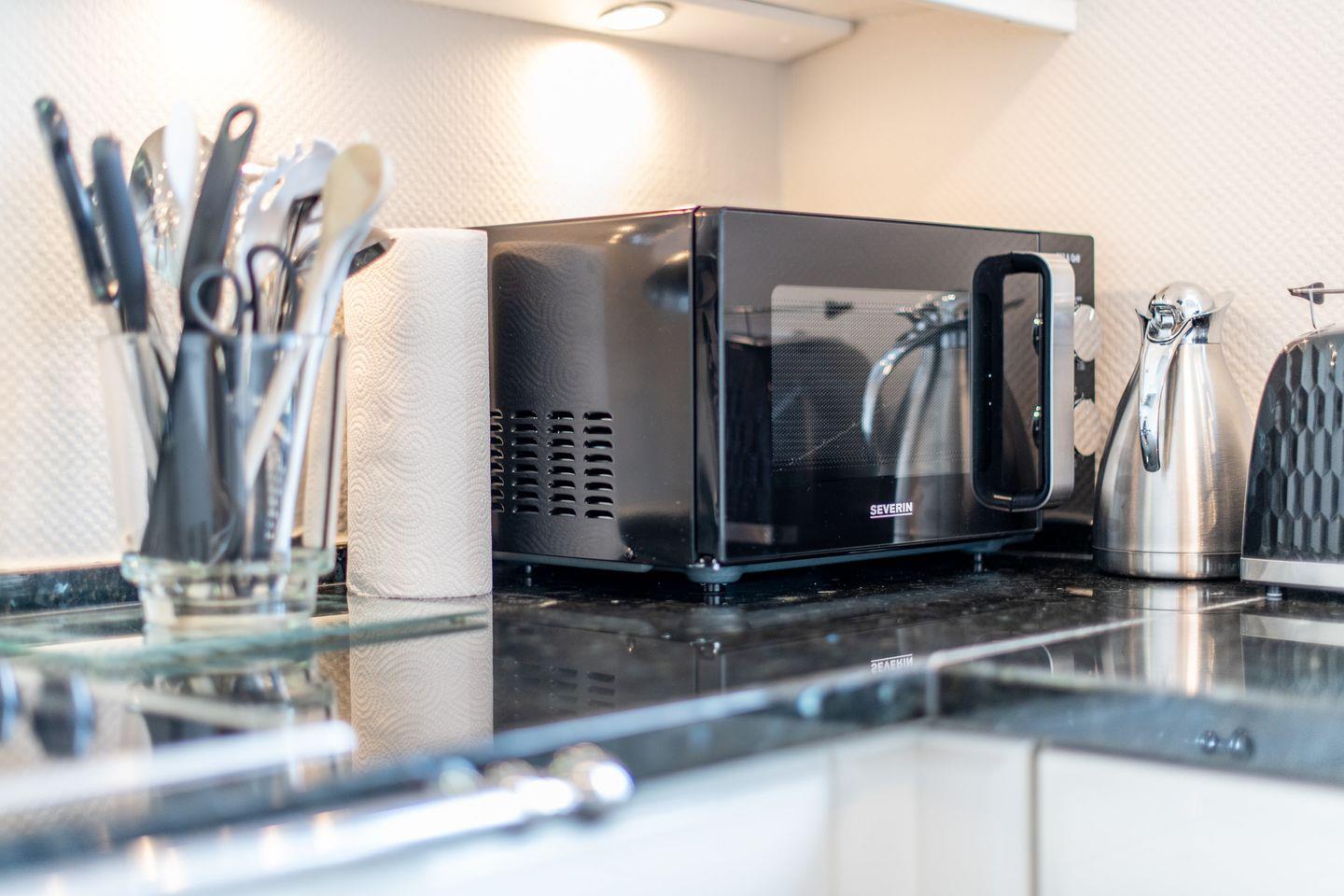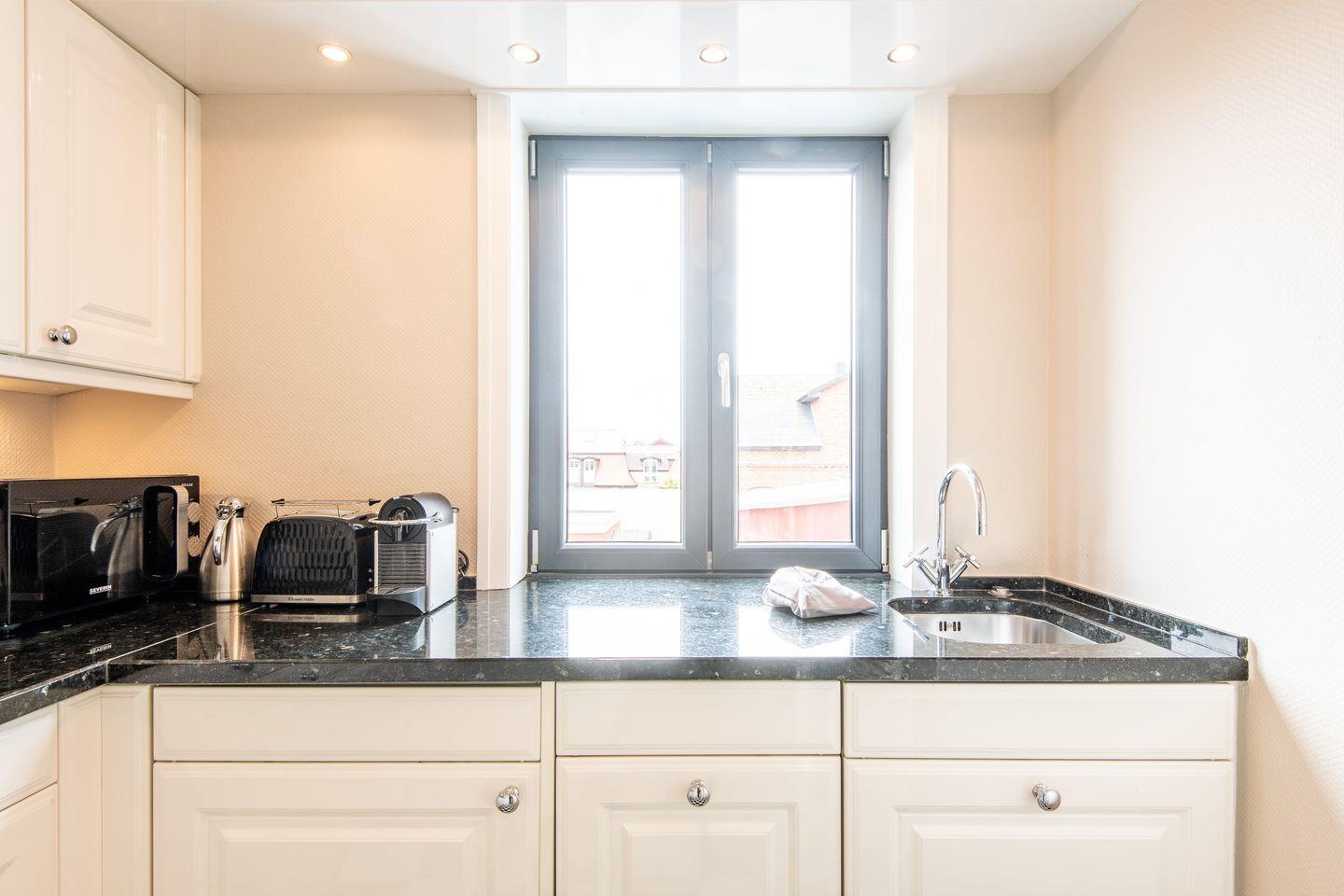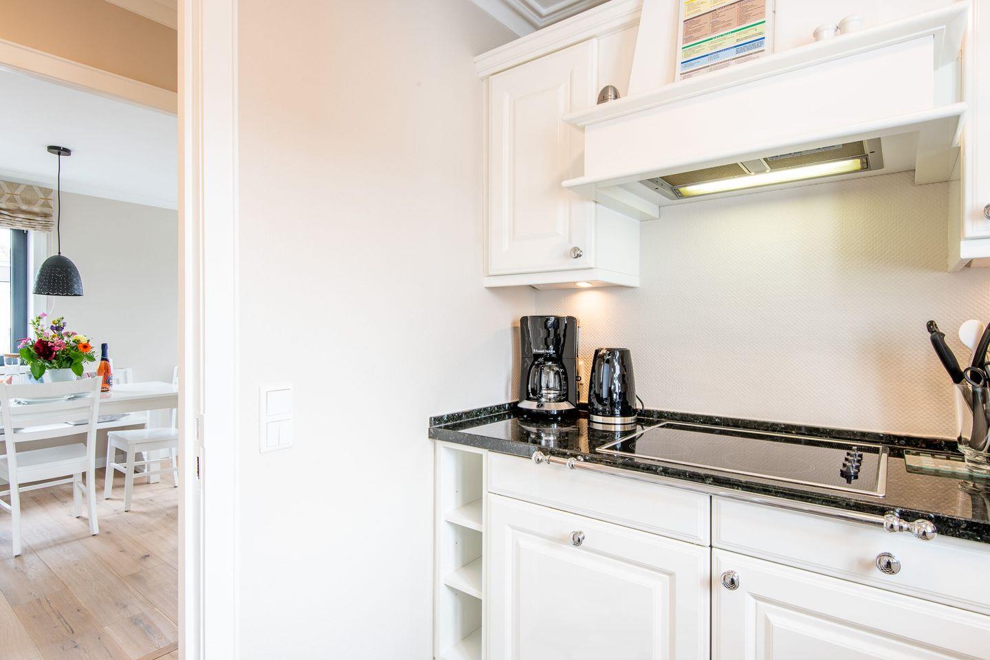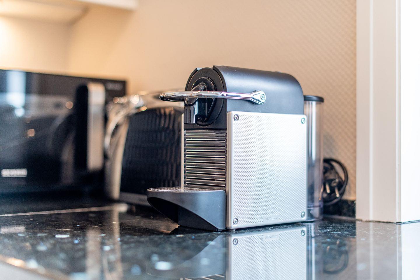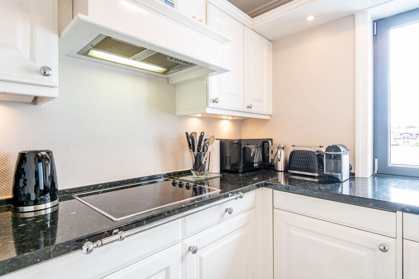 In der separaten Hochglanzküche finden Sie eine Granitarbeitsplatte, Cerankochfeld, Geschirrspüler, Nespresso-Maschine und Filterkaffeemaschine sowie weitere moderne Annehmlichkeiten, die Ihnen den Komfort bieten, Ihre Lieblingsspeisen wie zu Hause zuzubereiten.