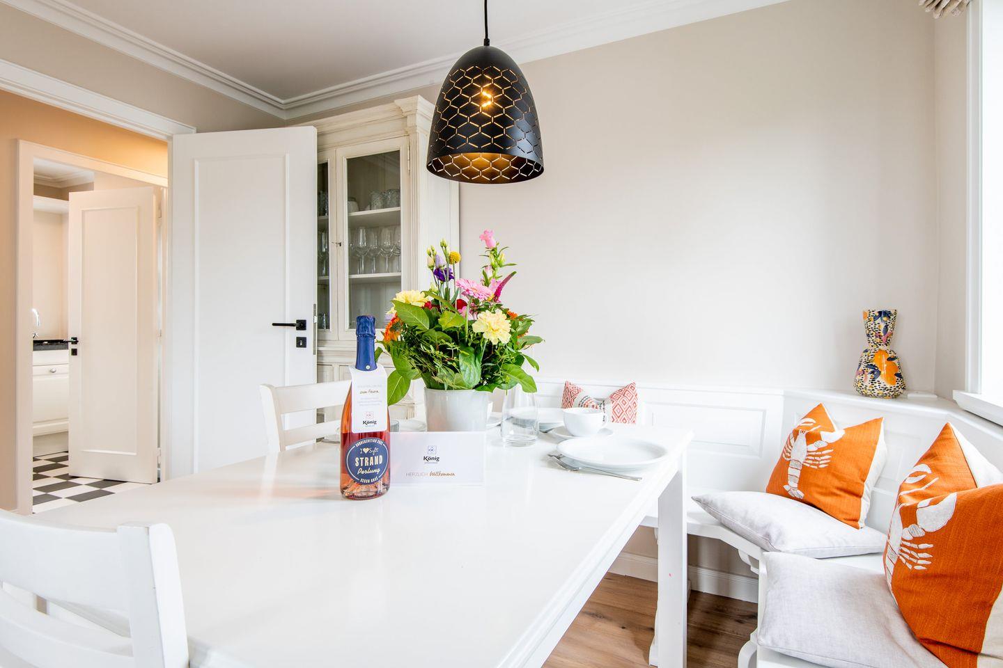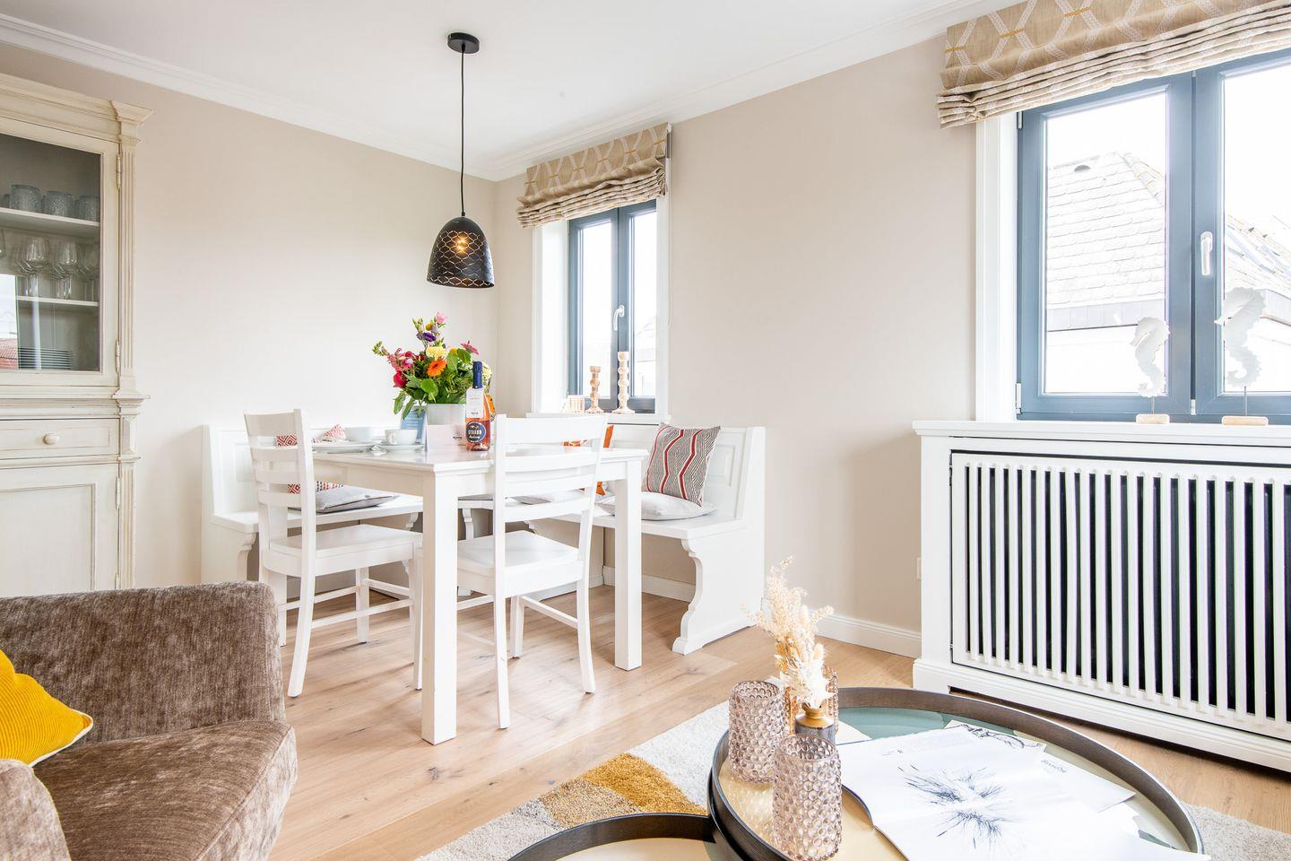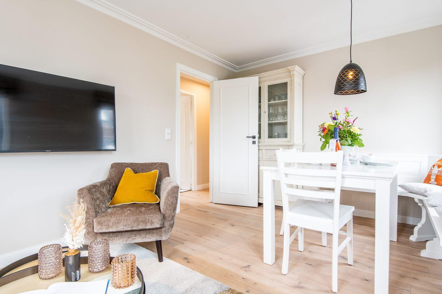 Das gemütliche Wohnzimmer ist stilvoll eingerichtet und mit einem bequemen Sofa sowie einer Essecke ausgestattet, die ausreichend Platz für gemeinsame Mahlzeiten bietet. Hier können Sie entspannen und die erlebnisreichen Tage auf Sylt ausklingen lassen.