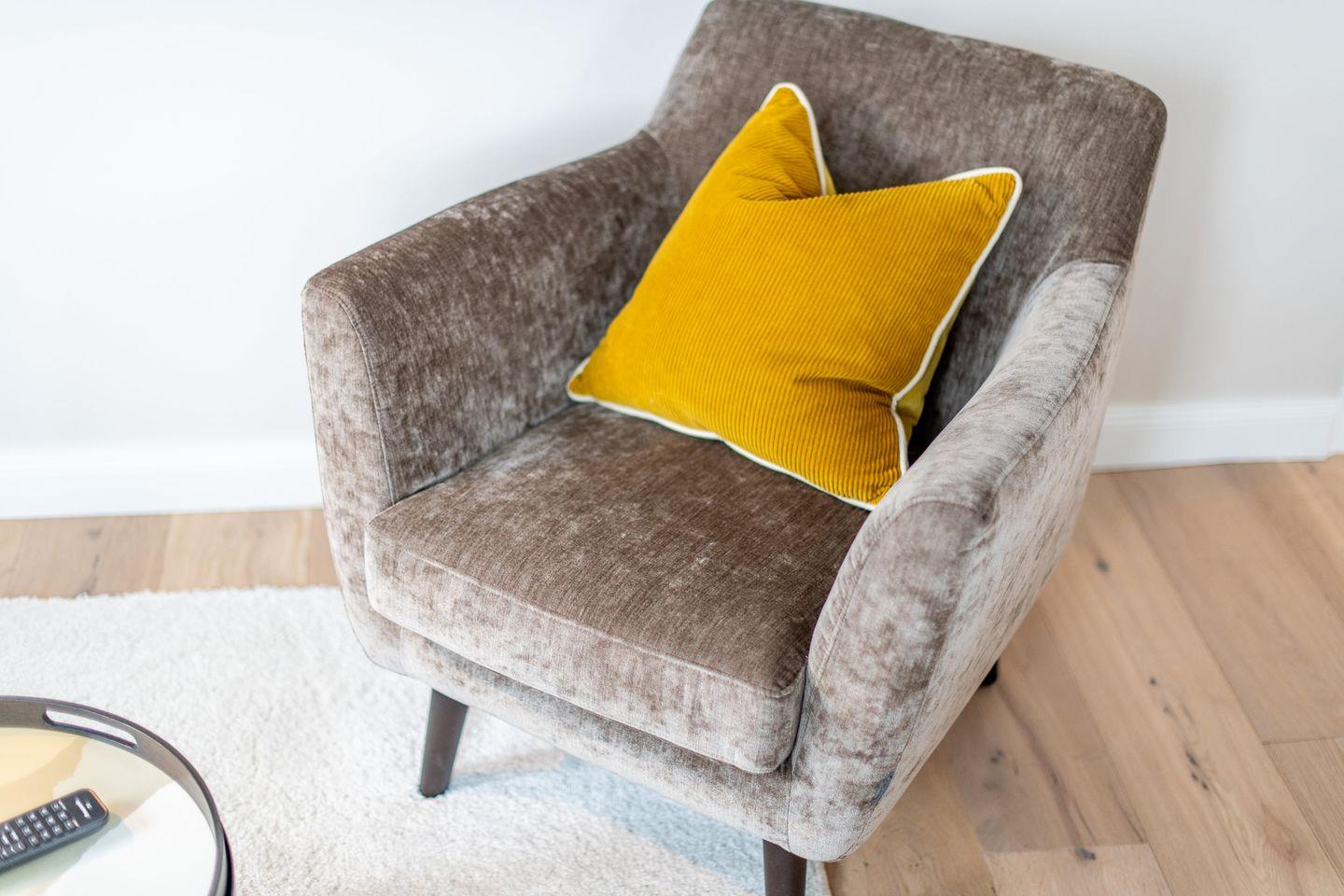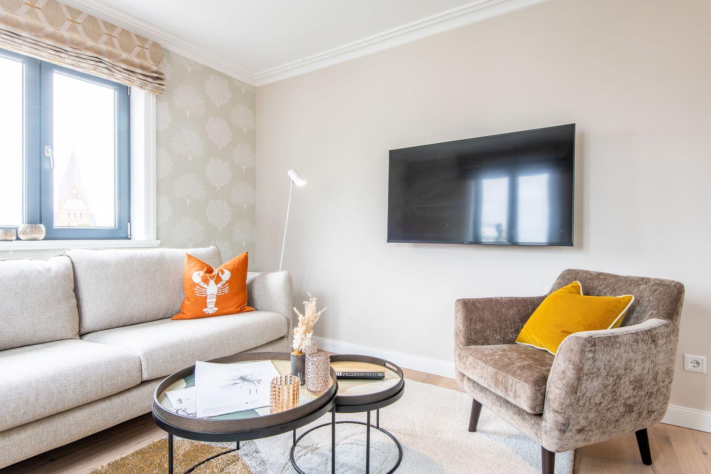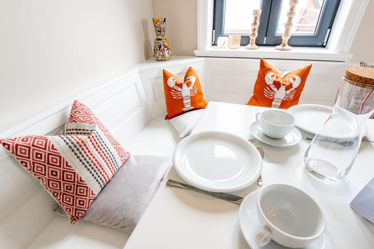 Das gemütliche Wohnzimmer ist stilvoll eingerichtet und mit einem bequemen Sofa sowie einer Essecke ausgestattet, die ausreichend Platz für gemeinsame Mahlzeiten bietet. Hier können Sie entspannen und die erlebnisreichen Tage auf Sylt ausklingen lassen.