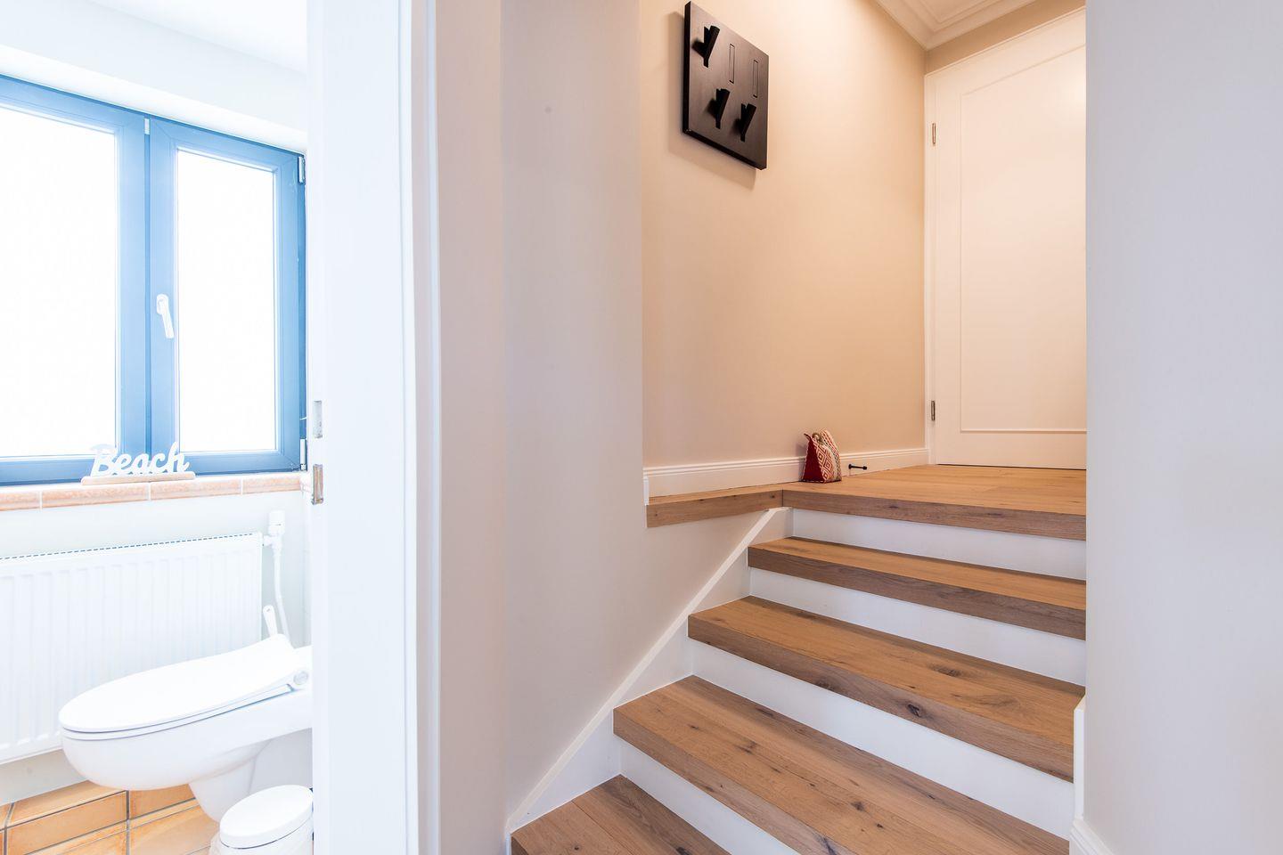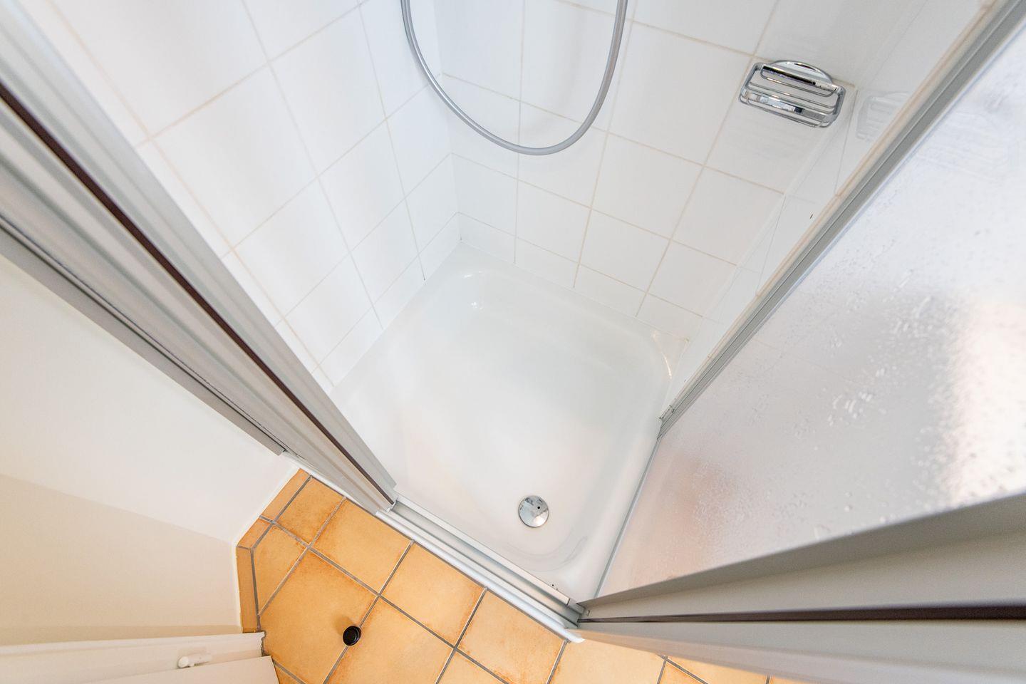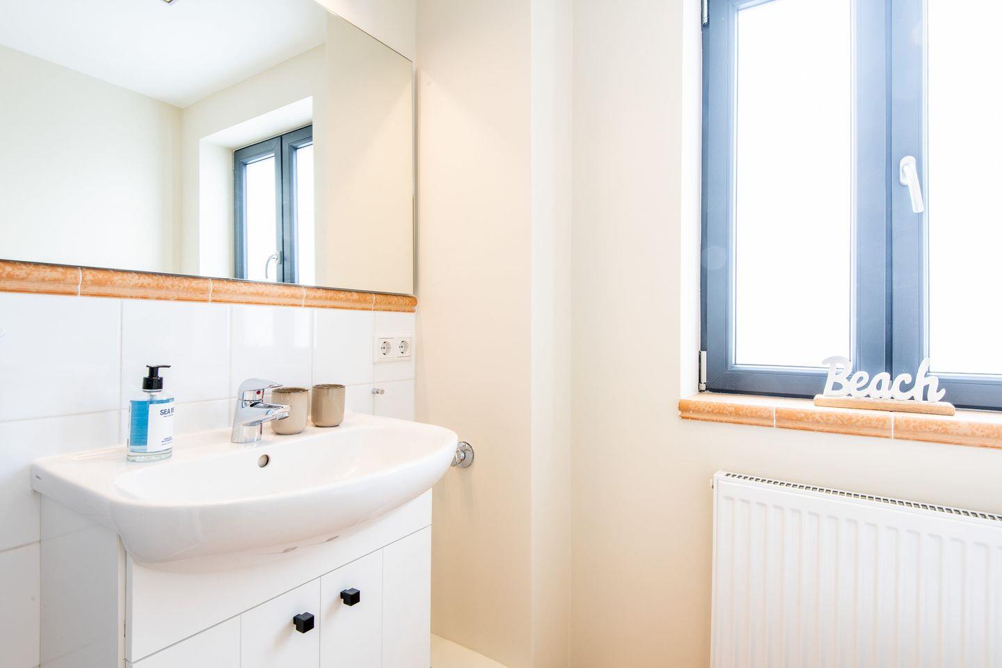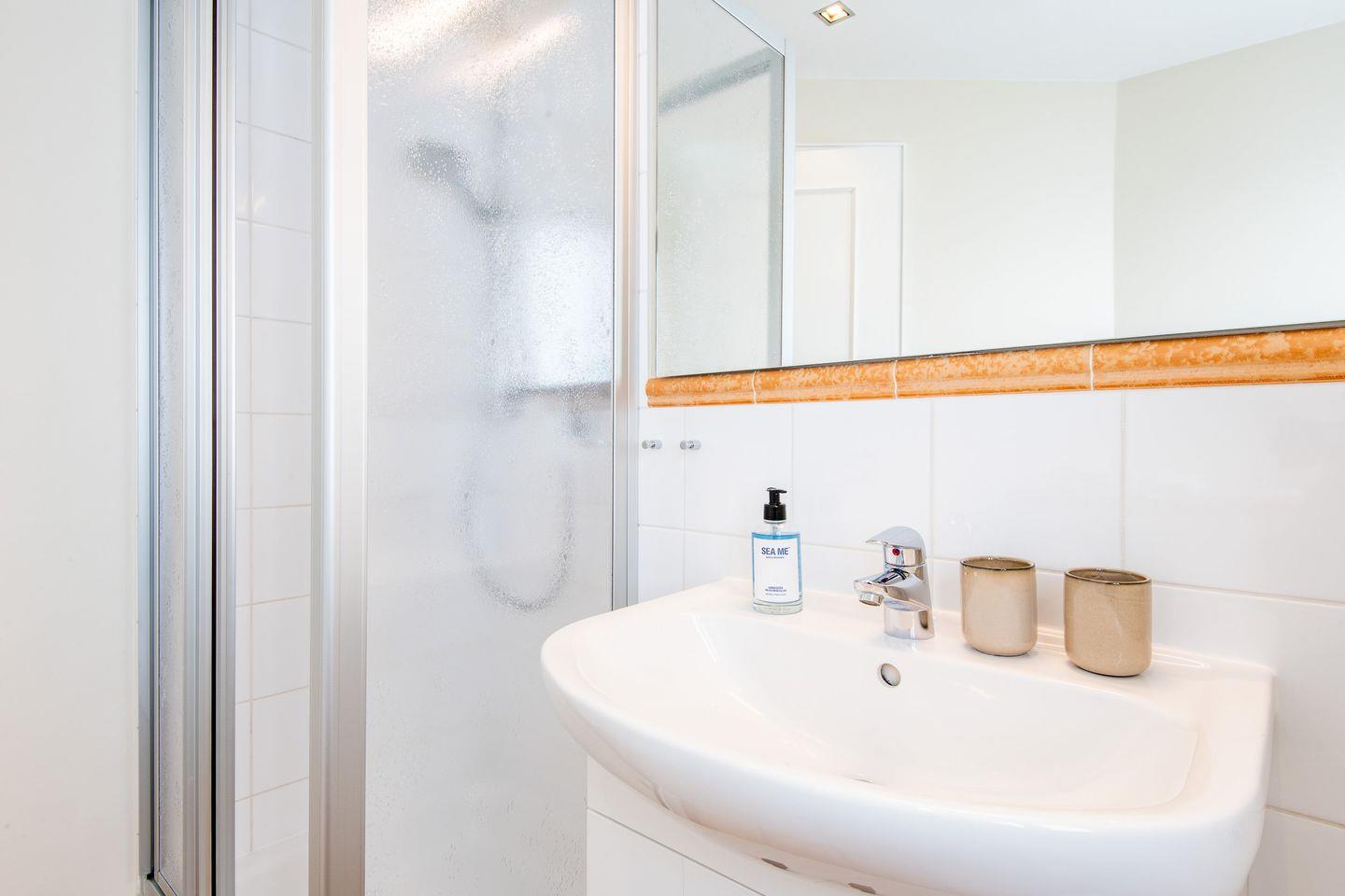 Das helle Badezimmer verfügt über eine Dusche, WC, Föhn und Handtuchwärmer, die Ihnen zusätzlichen Komfort für Ihren Aufenthalt bieten.