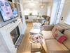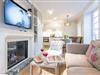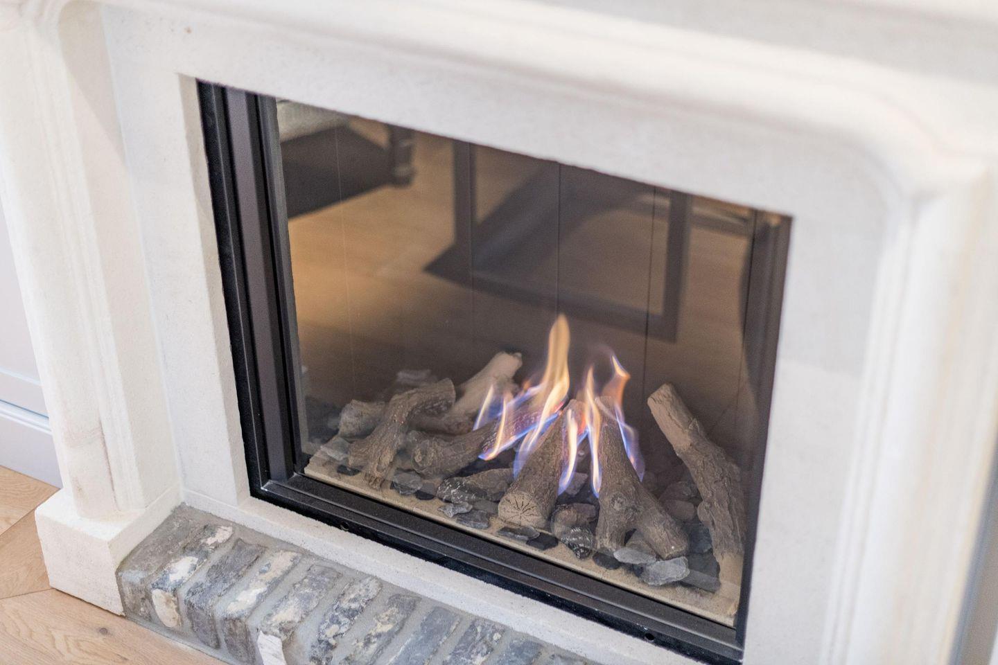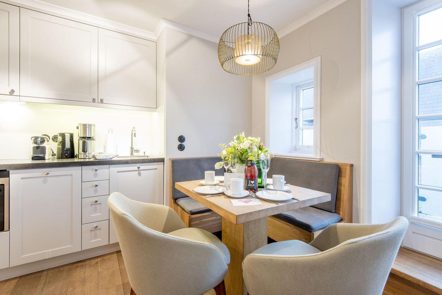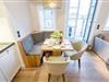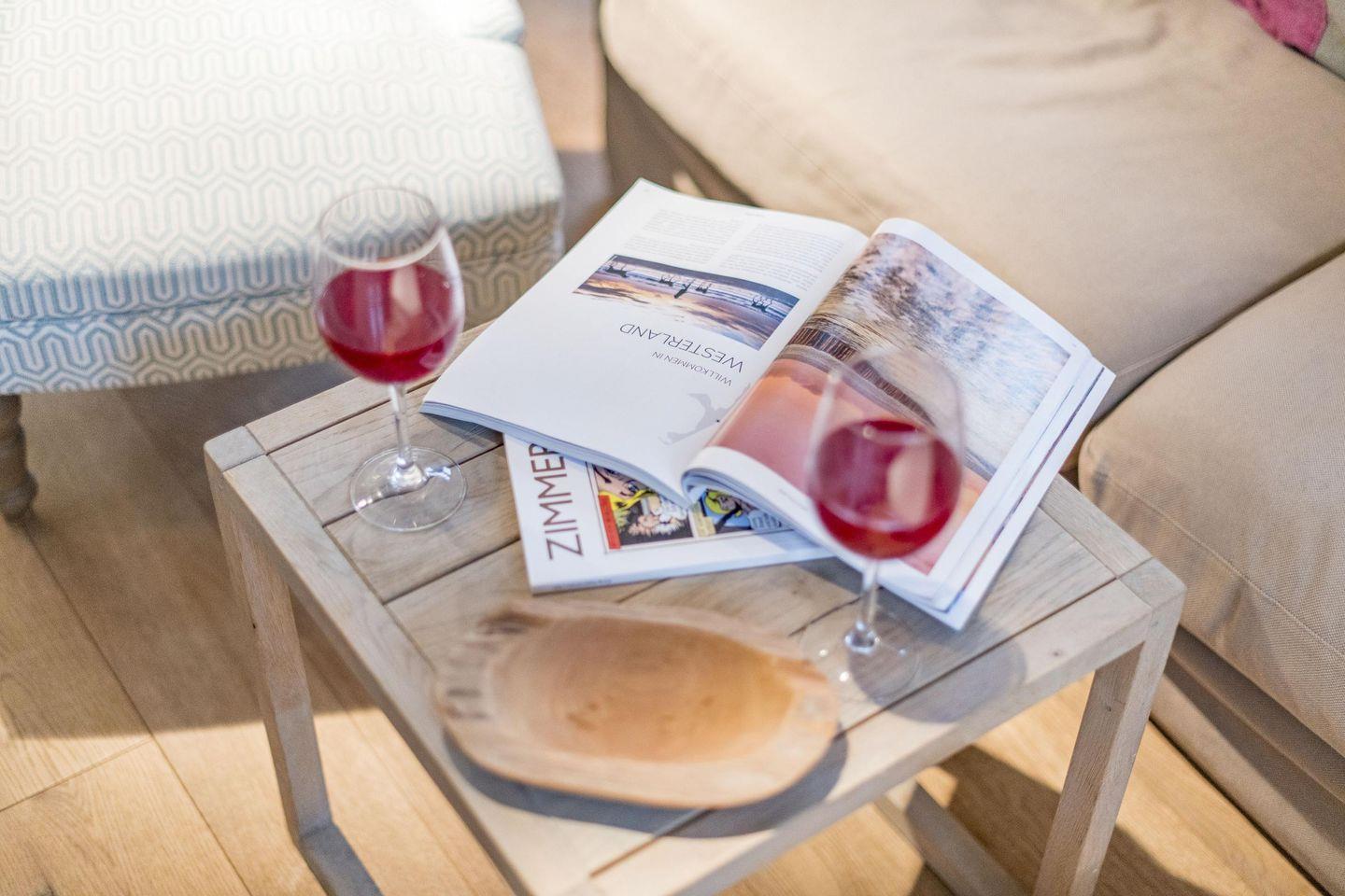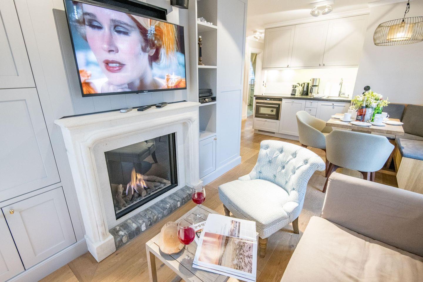 Der großzügige Wohnbereich lädt mit einem gemütlichen Sofa, einem Sessel und einem Esstisch für vier Personen zum Verweilen ein. Für behagliche Abende sorgt der Gaskamin, während der Balkonzugang nach Süden mit herrlichem Dünenblick zum Entspannen einlädt. Die Kombination aus stilvoller Einrichtung und moderner Technik schafft eine Atmosphäre der Erholung und Gemütlichkeit.