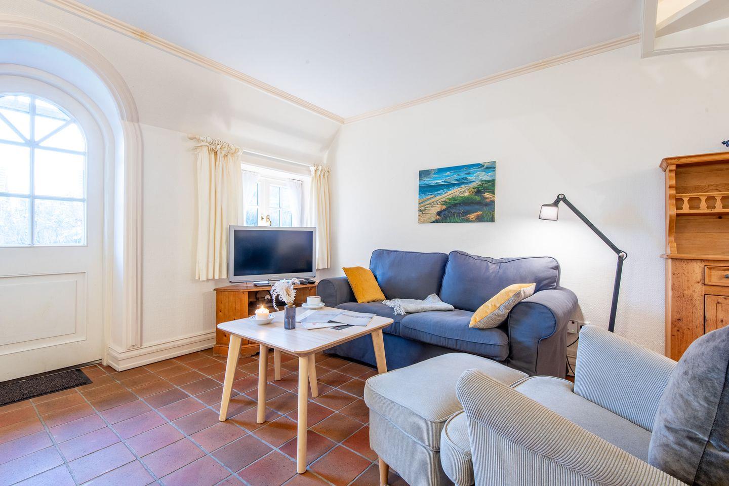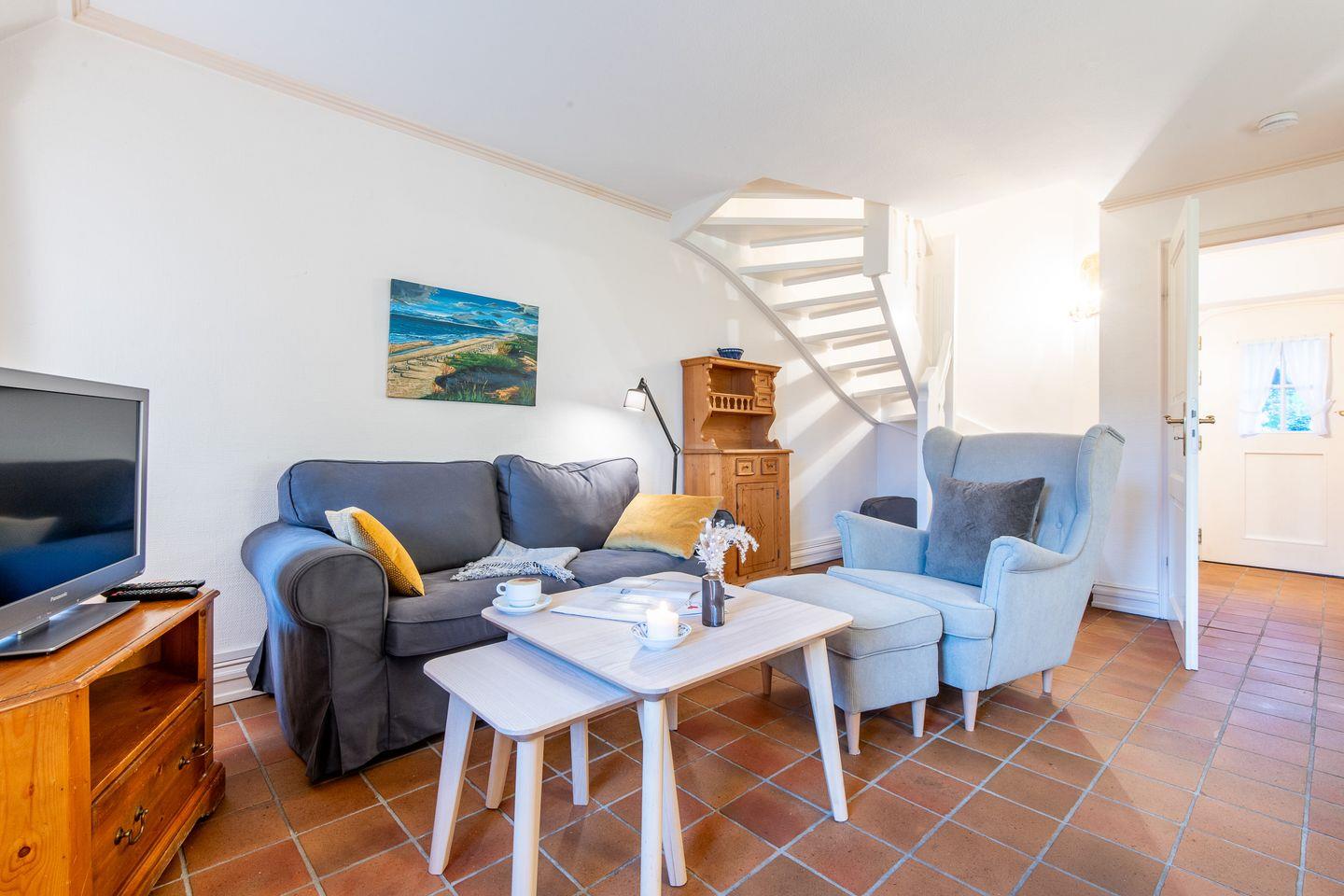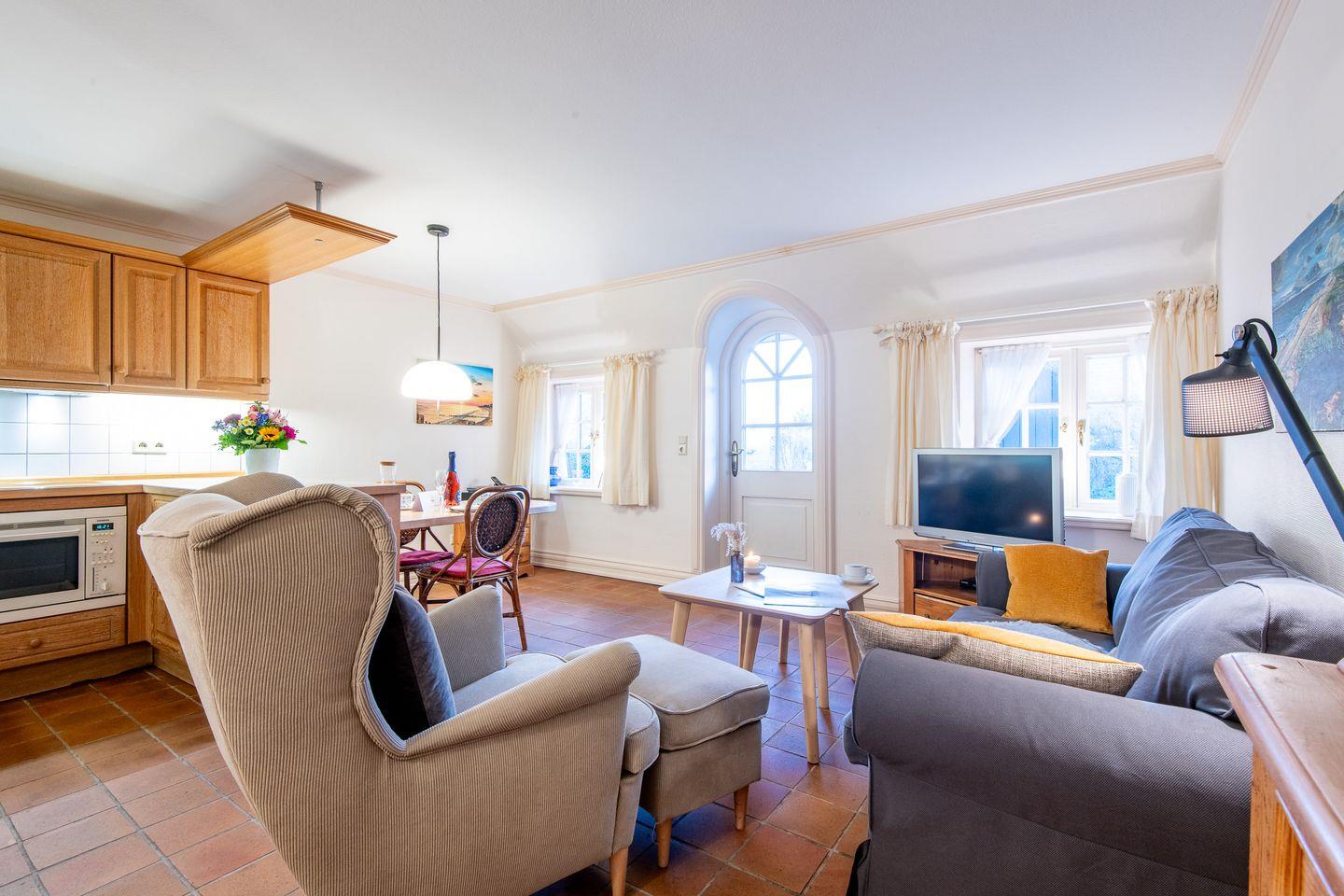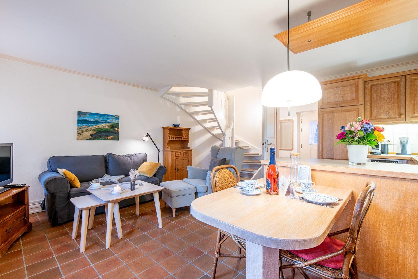 Der helle Wohn-Essbereich lädt mit einem gemütlichen Sofa, Sessel und TV zum Verweilen ein. Der direkte Zugang zur großzügigen und sonnigen Terrasse mit saisonalem Strandkorb (April bis Oktober) und stilvollen Gartenmöbeln sind der ideale Platz, um die frische Nordseeluft in privater Atmosphäre zu genießen.