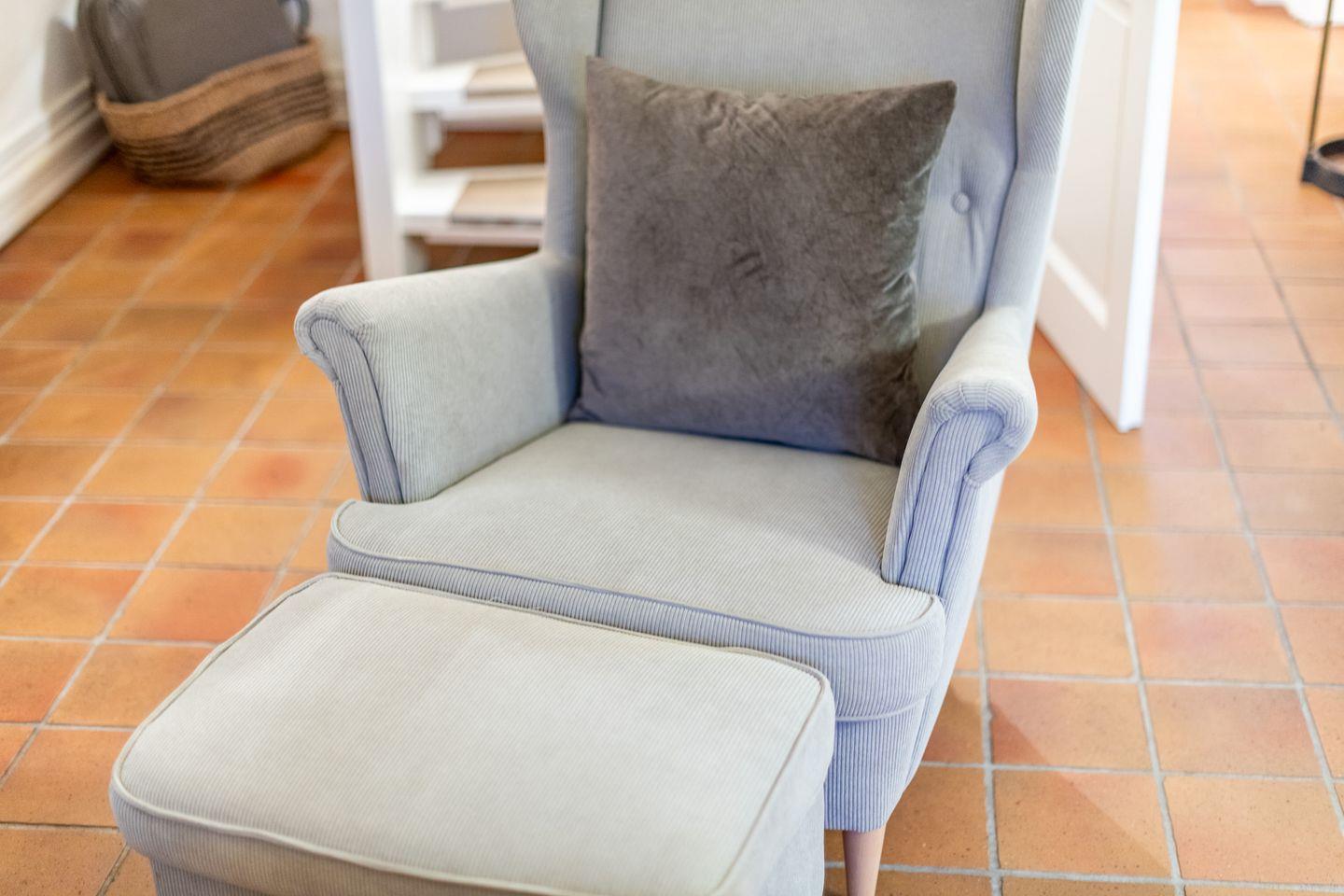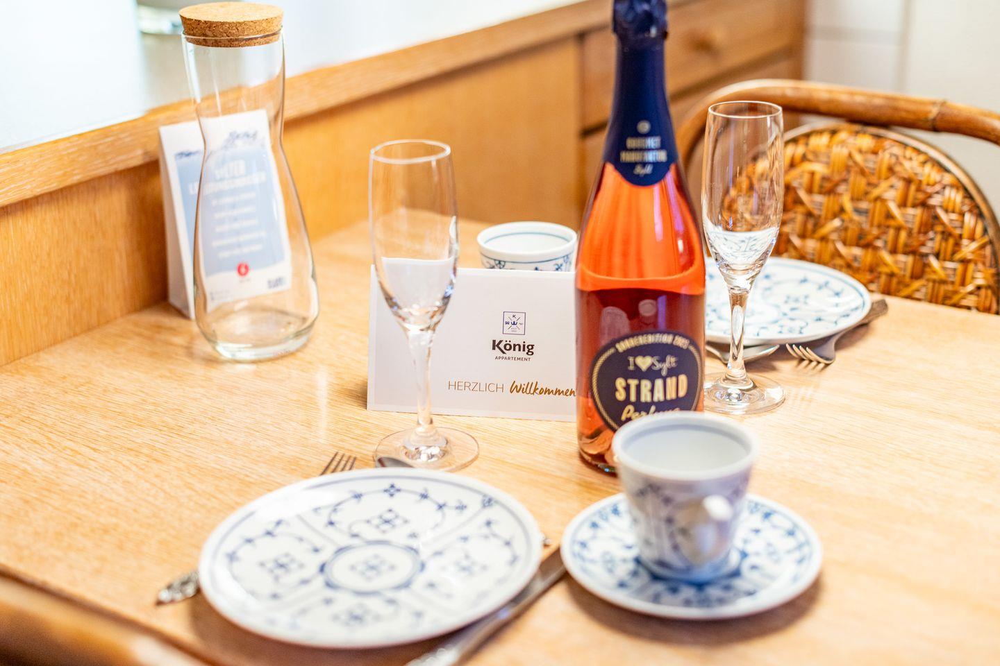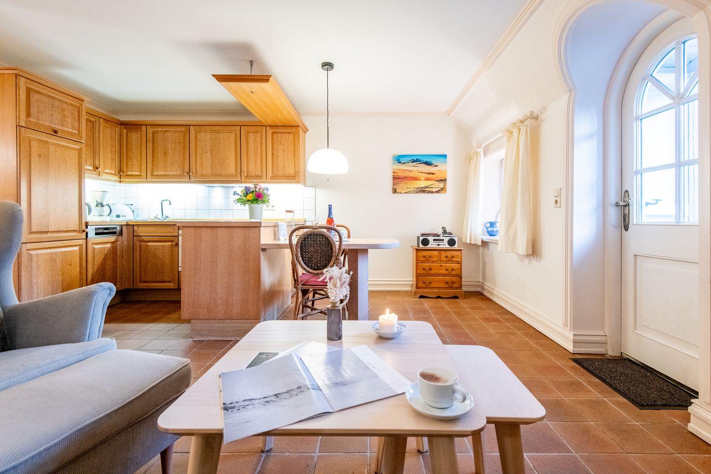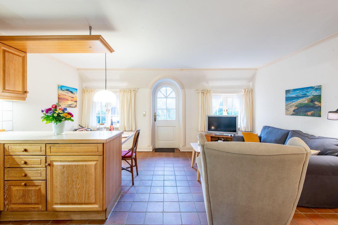 Der helle Wohn-Essbereich lädt mit einem gemütlichen Sofa, Sessel und TV zum Verweilen ein. Der direkte Zugang zur großzügigen und sonnigen Terrasse mit saisonalem Strandkorb (April bis Oktober) und stilvollen Gartenmöbeln sind der ideale Platz, um die frische Nordseeluft in privater Atmosphäre zu genießen.