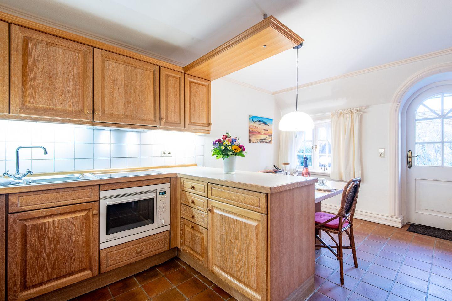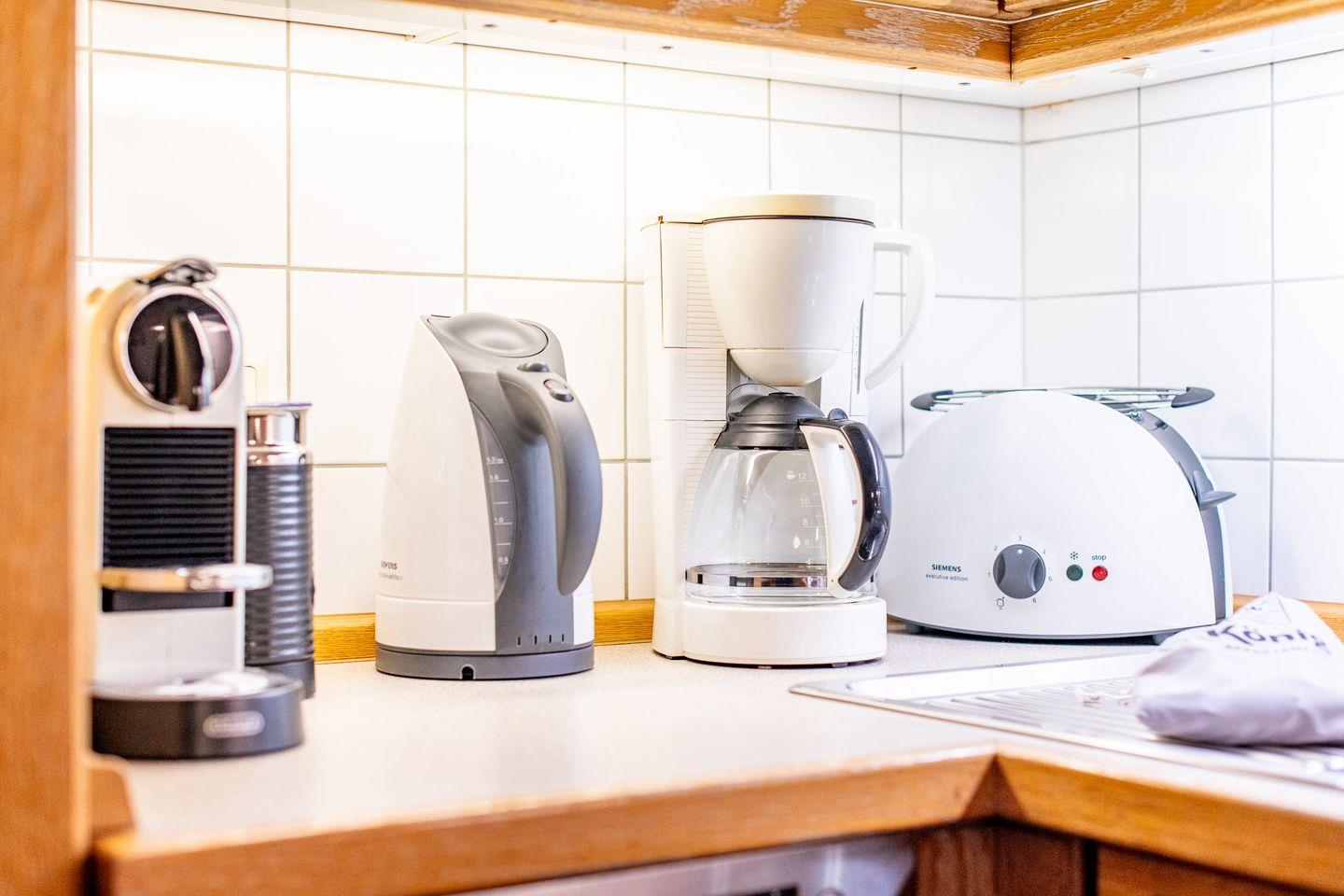 Die offene Küche ist mit einem Ceranfeld, einer Filterkaffeemaschine und einer Nespresso-Maschine ausgestattet. Hier finden Sie alle Annehmlichkeiten, um Ihre Mahlzeiten bequem zuzubereiten und im einladenden Essbereich zu genießen.