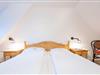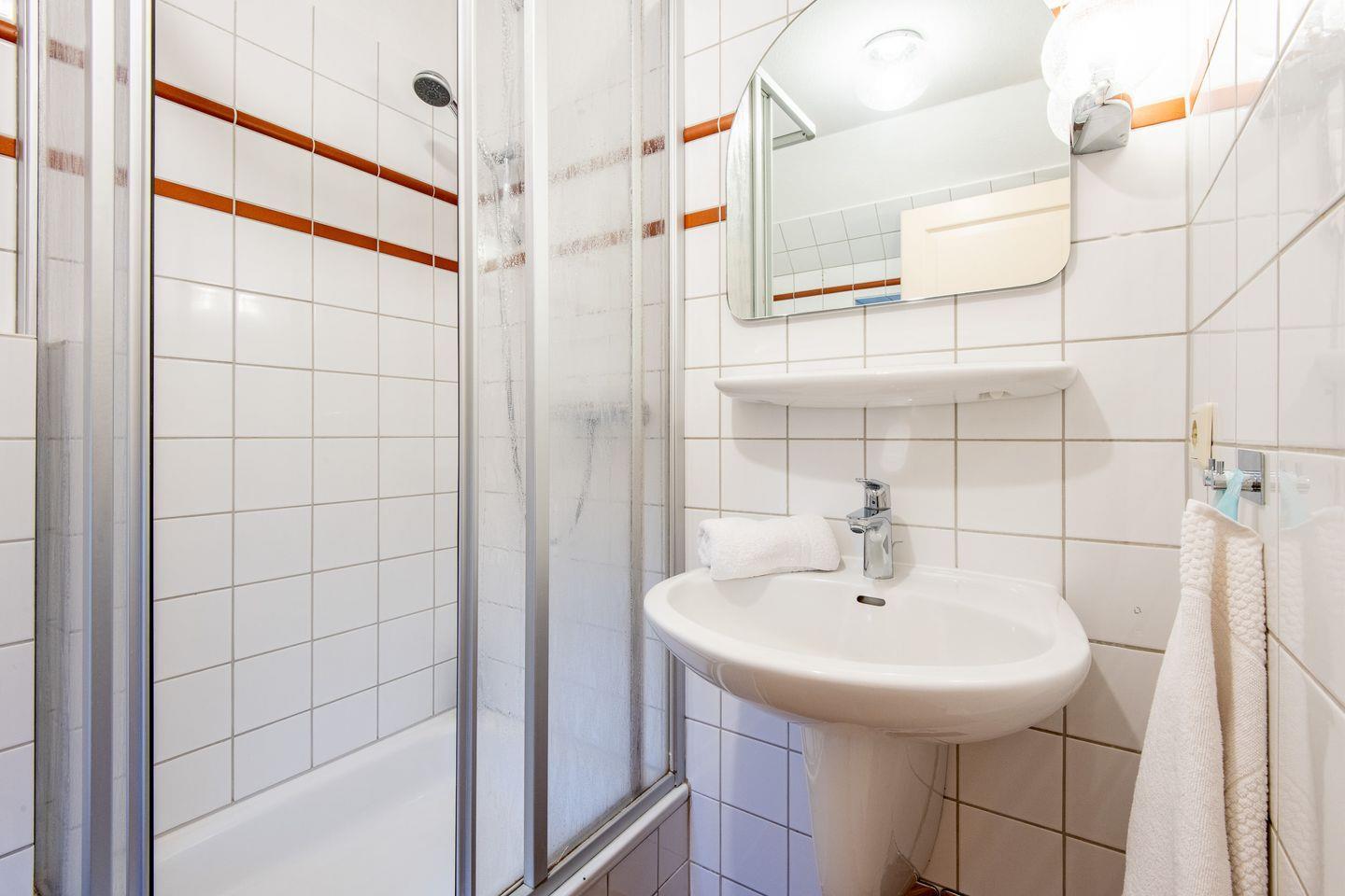 Das Schlafzimmer bietet ein komfortables Doppelbett (2x 90x200 cm) und maßgefertigte Tischlereinbauten, die praktischen Stauraum schaffen. Das Badezimmer mit Tageslicht verfügt über eine moderne Dusche.