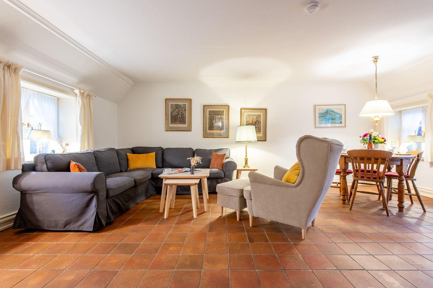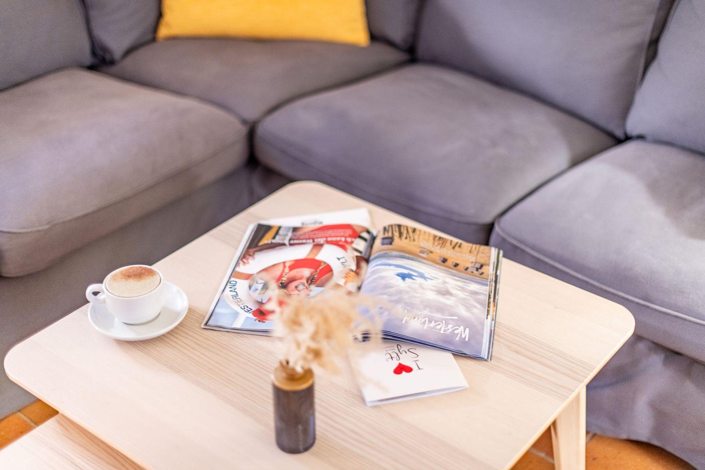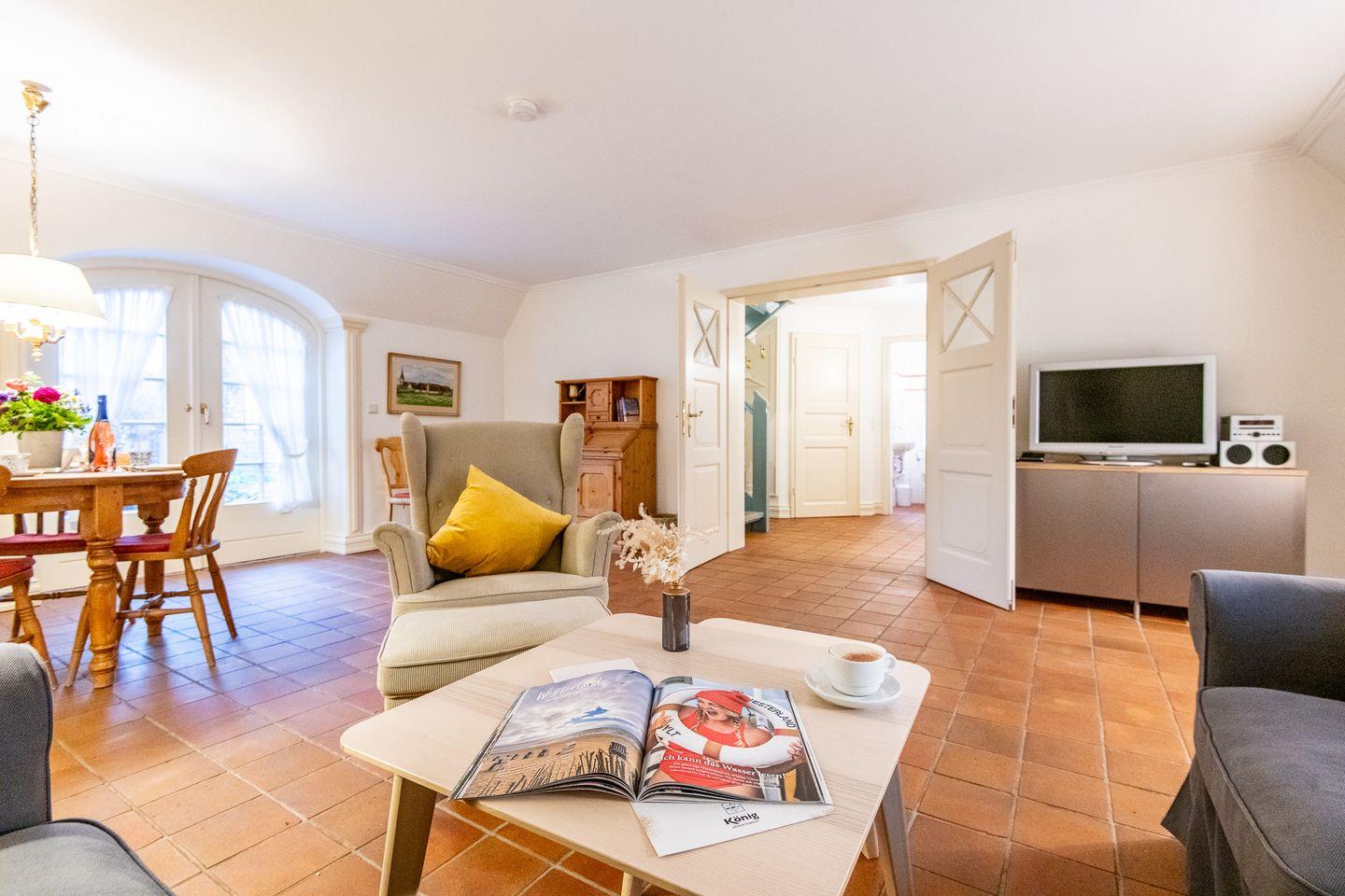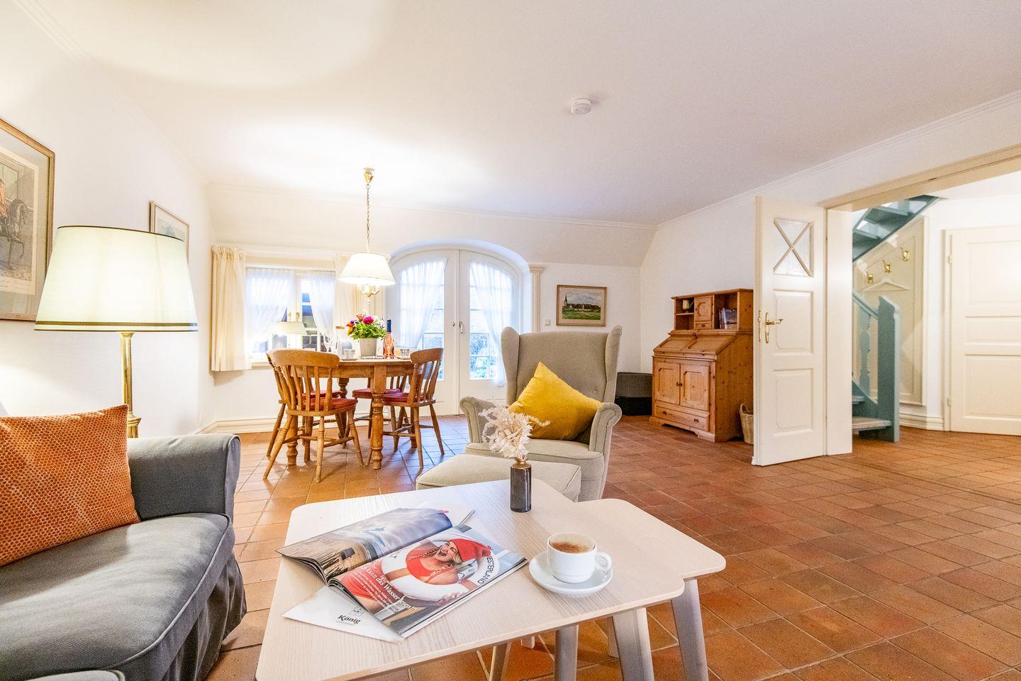 Der helle Wohn-Essbereich ist mit einem gemütlichen Sofa, TV und einer komfortablen Essecke ausgestattet und bietet den idealen Rückzugsort nach einem Tag am Strand. Vom Wohnzimmer aus gelangen Sie direkt auf die sonnige, möblierte Terrasse, die mit einem Strandkorb und Gartenmöbeln zum Verweilen einlädt. Das gesamte Erdgeschoss ist mit Fußbodenheizung und historischen Pluviosen ausgestattet und sorgt für eine behagliche Atmosphäre.