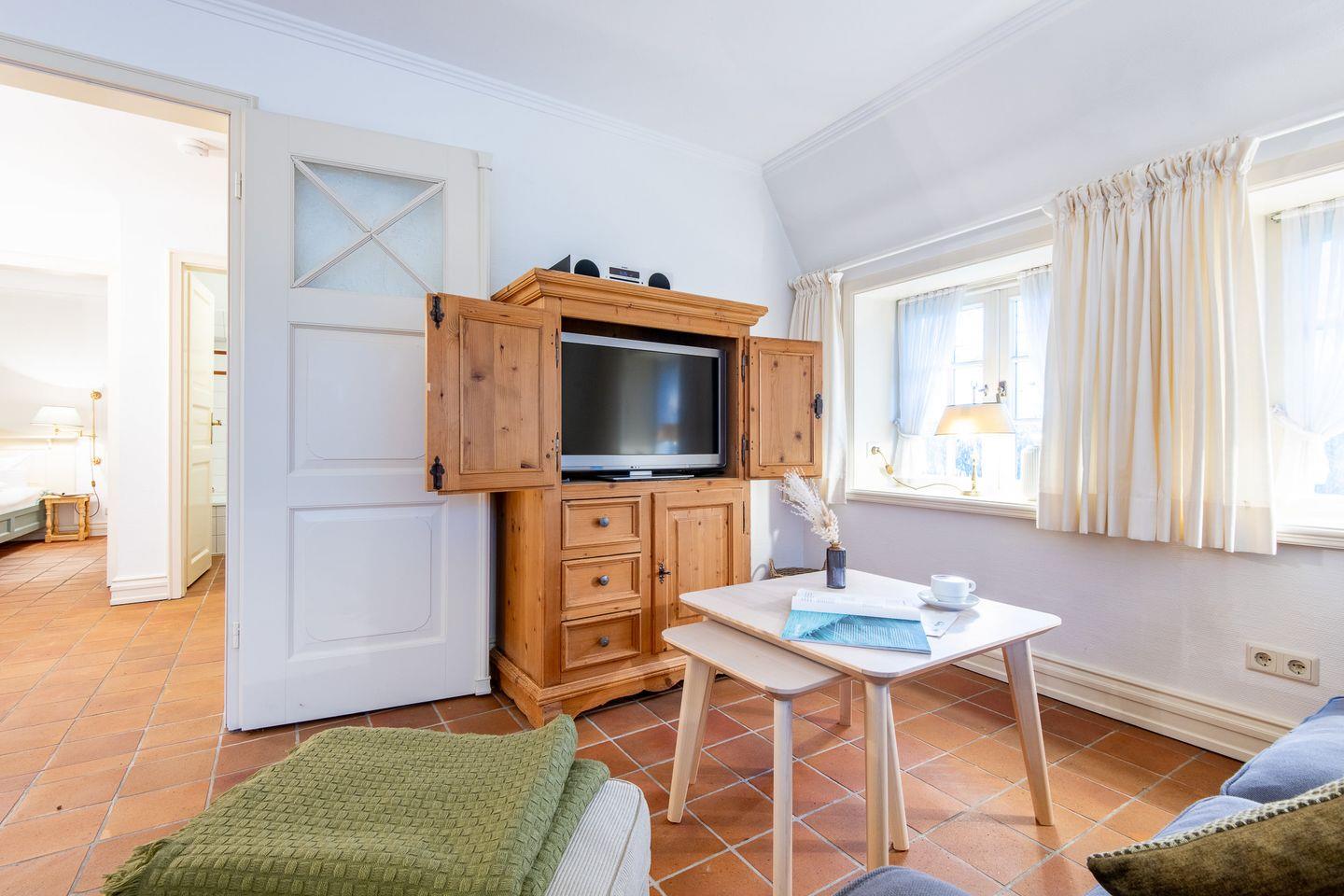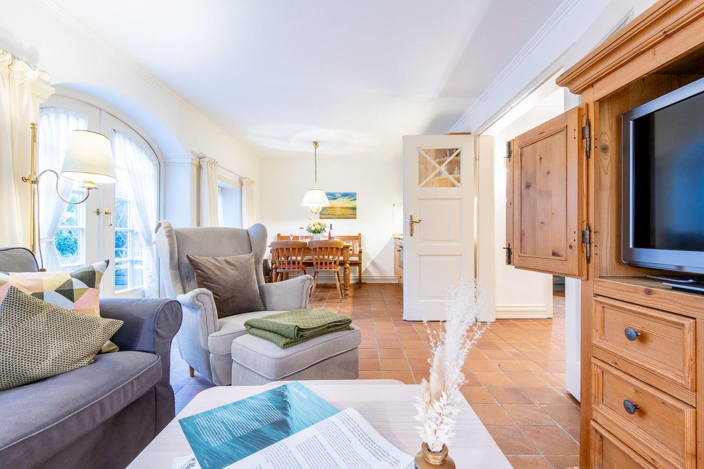 Der großzügige Wohn- und Essbereich strahlt Gemütlichkeit und Komfort aus und ist mit einem bequemen Sofa, TV und einer einladenden Essecke für 3 Personen ausgestattet. Durch den direkten Zugang zur Terrasse können Sie Ihren Morgenkaffee im Freien genießen oder abends die Sylter Brise spüren.