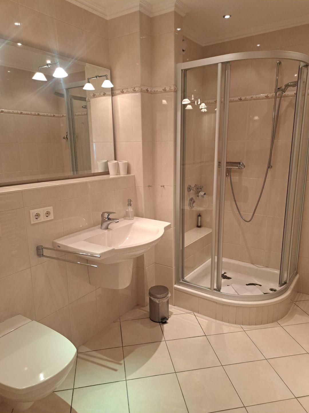 Das Badezimmer verfügt über eine Dusche mit Wanne, sodass Sie nach einem erlebnisreichen Tag auf Sylt entspannen können, während Sie eine wohltuende Dusche oder ein warmes Bad nehmen. Für zusätzliche Annehmlichkeiten sorgen Waschmaschine und Trockner, die Sie während Ihres Aufenthalts nutzen können. Ein Haartrockner, Bügeleisen und Bügelbrett sind ebenfalls vorhanden, um Ihre persönliche Pflege einfach und angenehm zu gestalten.