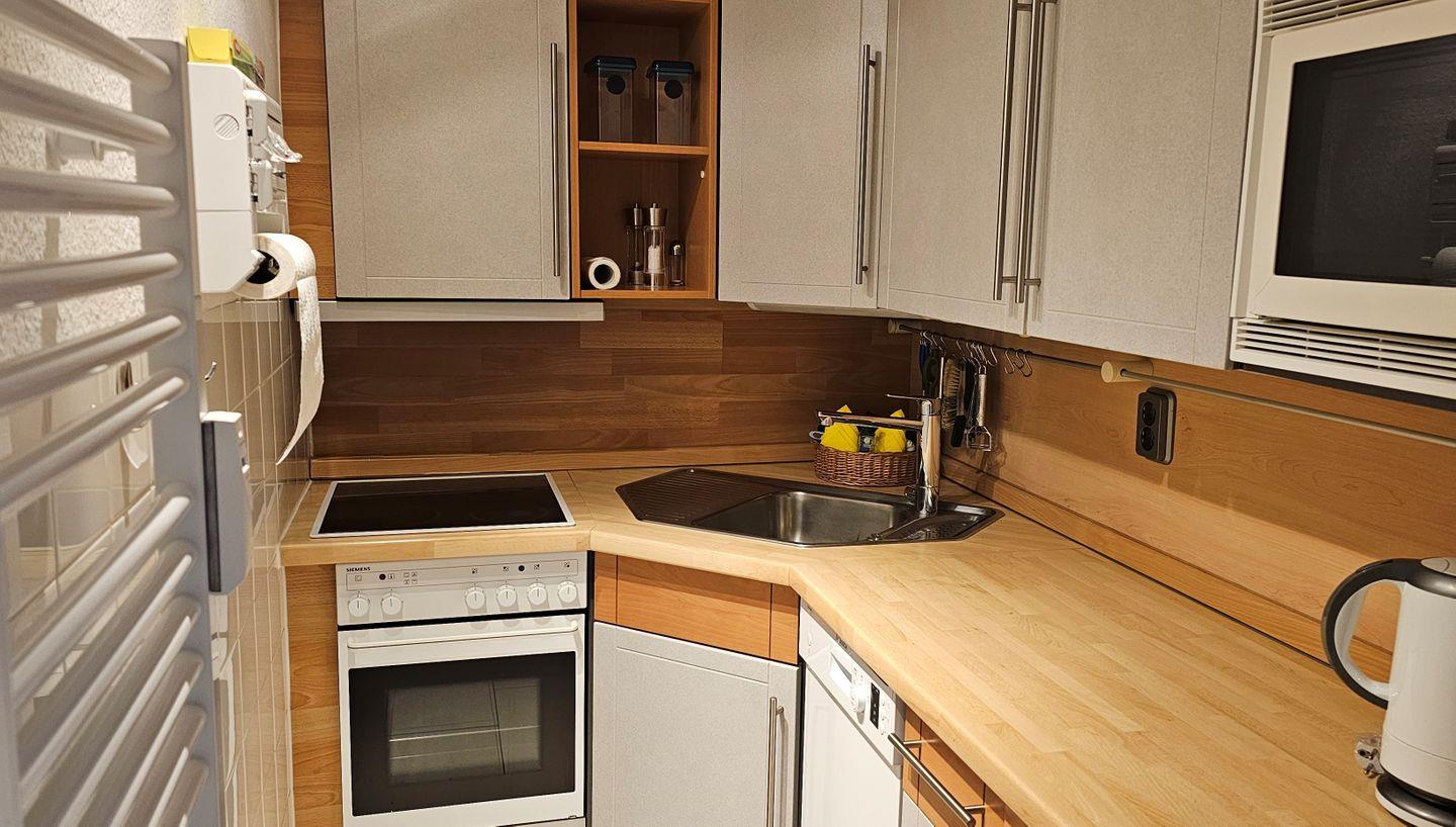 Die gut ausgestattete, geschlossene Küche lädt dazu ein, kulinarische Köstlichkeiten zu zaubern. Sie finden dort alles, was Sie benötigen – vom Herd über den Backofen bis hin zur Spülmaschine und Kühlschrank mit Gefrierfach. Für einen gemütlichen Frühstücksstart stehen Ihnen auch eine Kaffeemaschine, Wasserkocher, Toaster und sogar ein Eierkocher zur Verfügung. Der Essbereich bietet genügend Platz für gemeinsame Mahlzeiten.