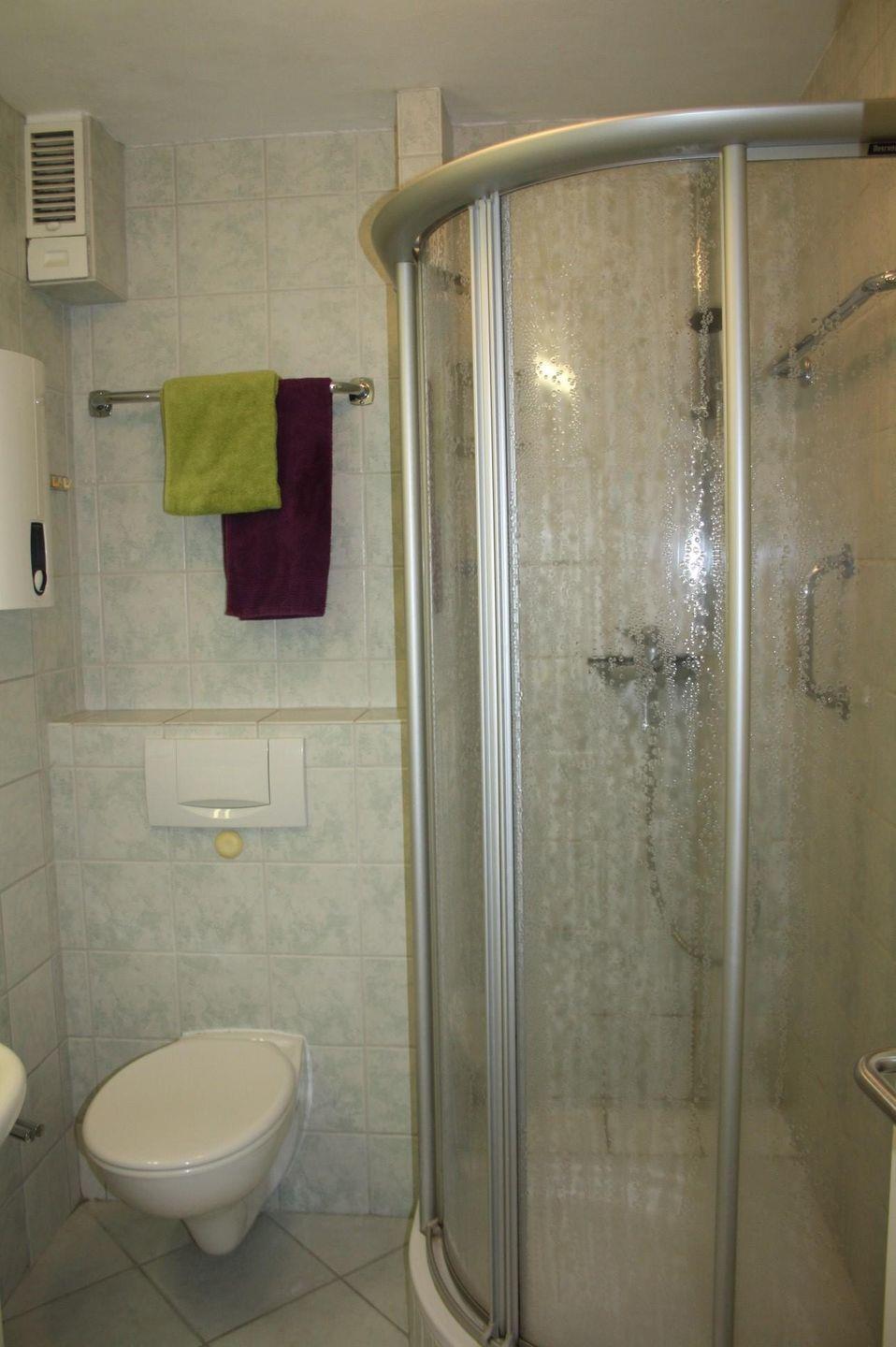 Die moderne Dusche im Badezimmer bietet nicht nur Erfrischung, sondern sorgt für eine wohltuende Auszeit nach einem langen Tag an der frischen Luft. Besonders praktisch sind die Waschmaschinennutzung sowie der Haartrockner und die Kosmetikspiegel, die für Ihr Wohlbefinden sorgen.