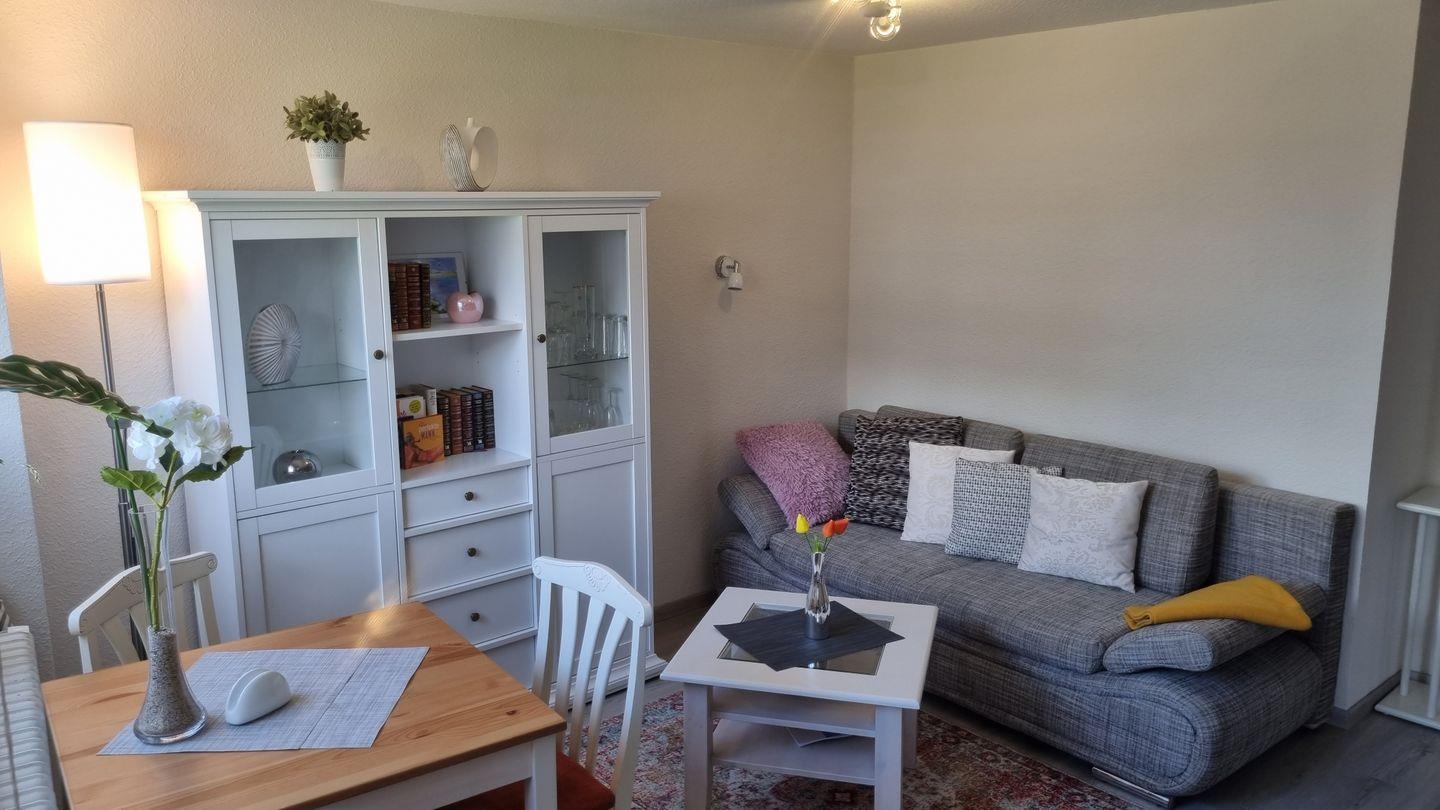 Die offene Küche ist ideal für Selbstversorger, die ihre Kochkünste ausprobieren möchten. Hier finden Sie alles Nötige ausgestattet: einen Backofen, Kühlschrank, Kaffeemaschine, Wasserkocher sowie Geschirr und Besteck. Ein einladender Esstisch lädt zum gemeinsamen Speisen ein. Das gemütliche Sofa im Wohnbereich rundet das harmonische Ambiente ab und bietet sich perfekt an, um nach einem Tag am Strand zu entspannen und den Abend bei einem guten Film auf dem Fernseher ausklingen zu lassen. Selbstverständlich ist die Wohnung auch mit kostenlosem WLAN ausgestattet, damit Sie jederzeit mit Familie und Freunden in Kontakt bleiben oder Ihre Urlaubsfotos in die sozialen Medien teilen können.