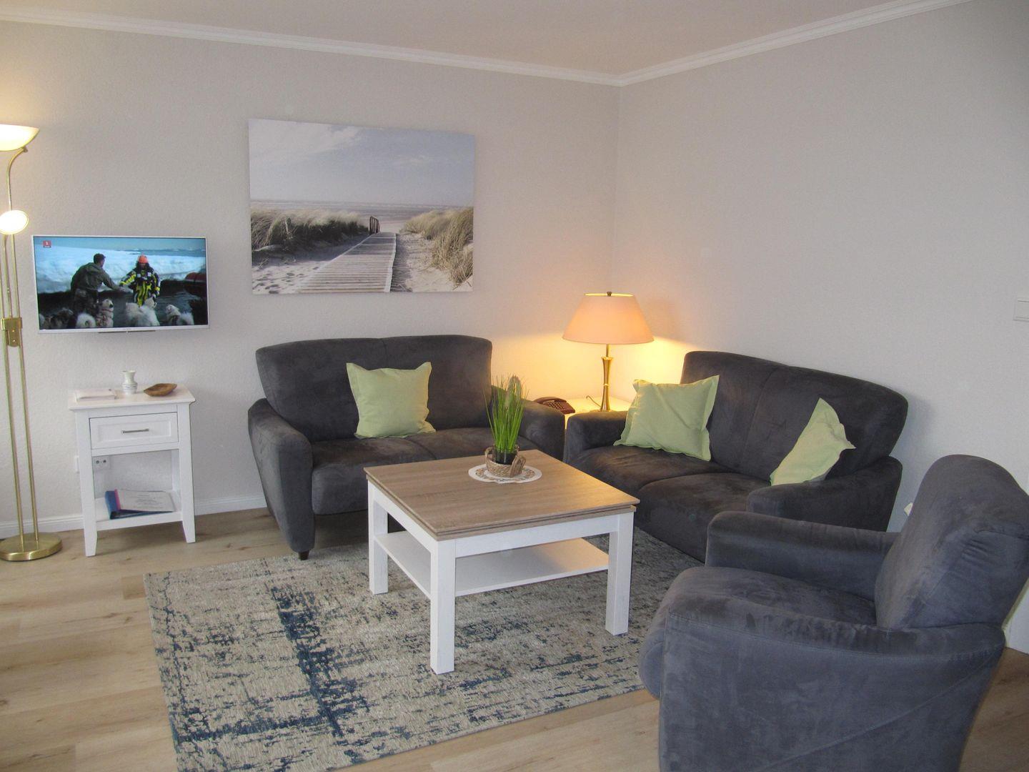 Die Wohnung verfügt über ein geschmackvoll eingerichtetes Schlafzimmer, in dem Sie nach einem erlebnisreichen Tag auf Sylt erholsam schlafen können. Die Schlafmöglichkeiten sind für zwei Personen ausgelegt und ermöglichen Ihnen eine ruhige Nachtruhe. Der offene Wohnbereich ist mit einem komfortablen Sofa, einem Sessel und einem Esstisch ausgestattet, an dem Sie entspannte Stunden verbringen oder Ihre Mahlzeiten genießen können.