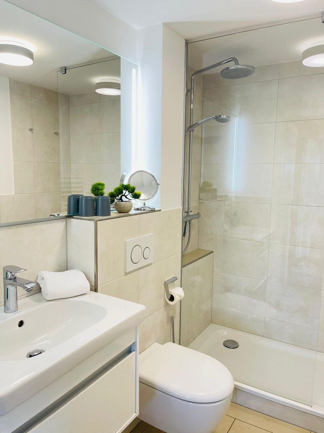 Der Wohnbereich ist gemütlich gestaltet und lädt zum Entspannen ein. Ein komfortables Sofa, ein TV für entspannende Filmabende und ein Esstisch schaffen eine einladende Atmosphäre. Die Regendusche im Badezimmer sorgt für ein wohliges Gefühl. Zur weiteren Ausstattung gehören ein Haartrockner, ein Kosmetikspiegel und praktische Küchenutensilien, die Ihren Aufenthalt so angenehm wie möglich gestalten.