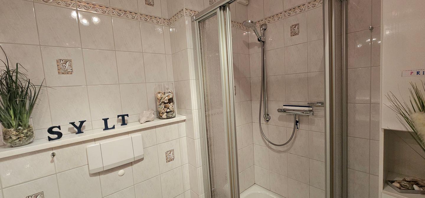 Küche mit Mikrowelle, Bad mit Dusche.