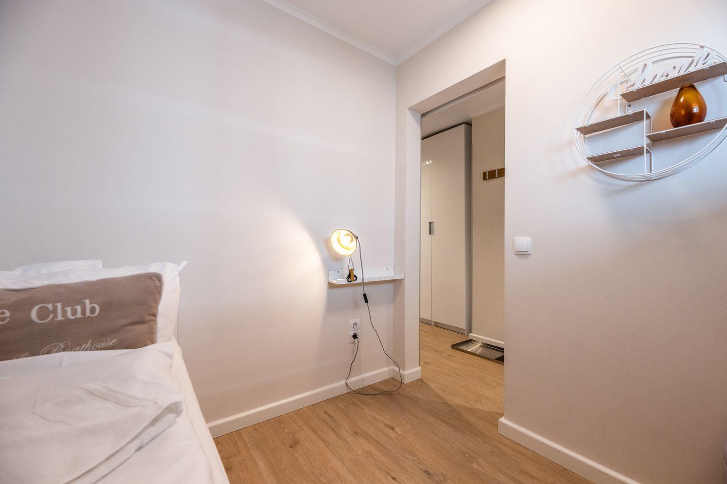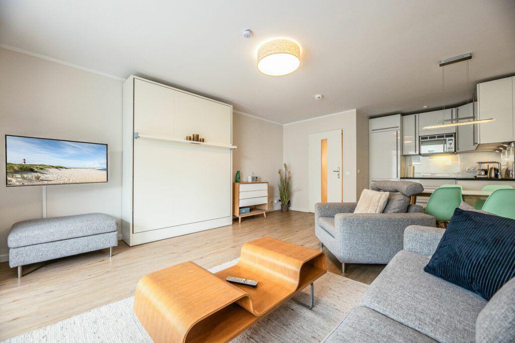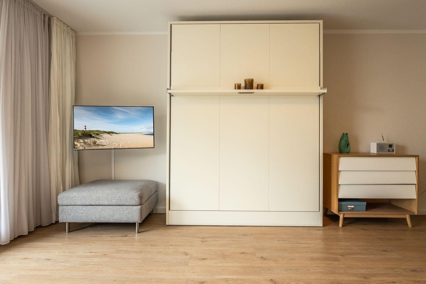 Das komfortable Wohnzimmer ist mit einem gemütlichen Sofa und einem modernen Schrankbett eingerichtet, perfekt für entspannte Abende. Ein Fernseher und eine HiFi-Anlage sorgen dafür, dass es Ihnen an Unterhaltung nicht fehlt. Zudem steht kostenloses WLAN zur Verfügung, sodass Sie auch während Ihres Aufenthalts immer online sein können.