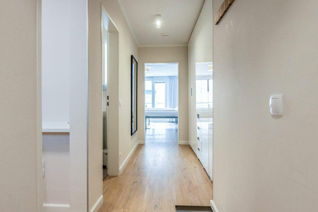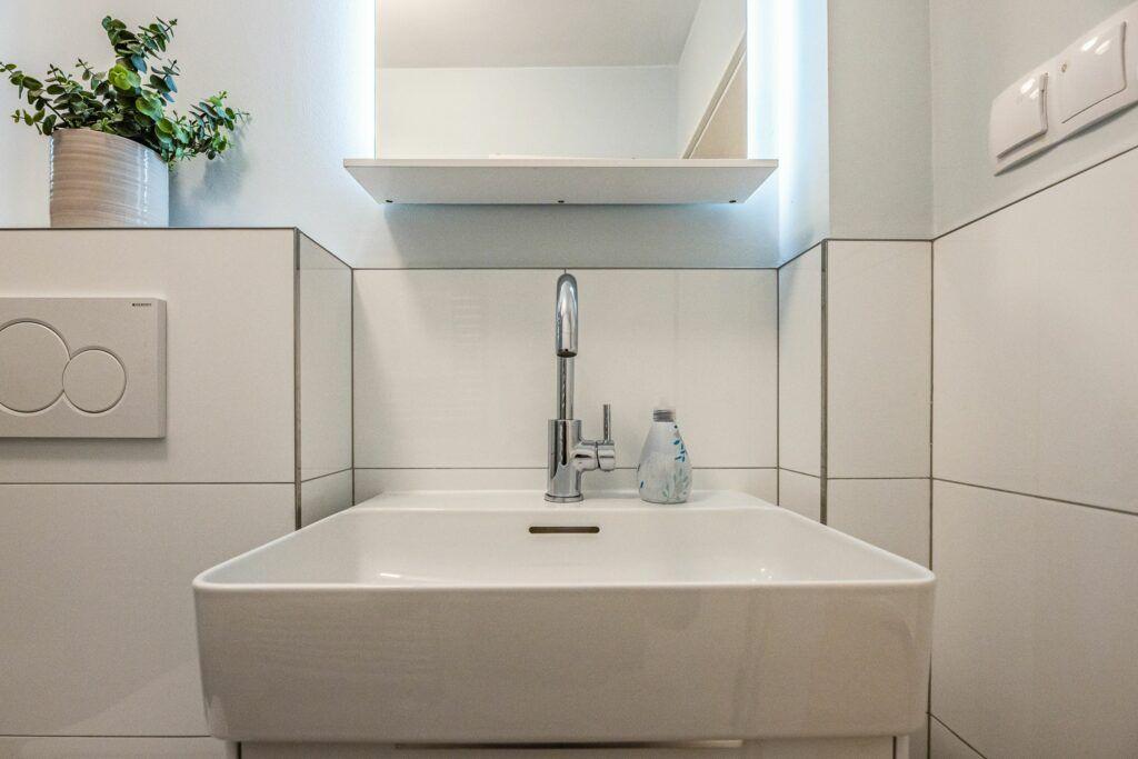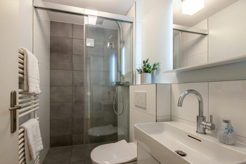 Die saubere und moderne Sanitäreinheit umfasst eine Dusche, ein WC sowie ein Waschbecken und ist mit einem Haartrockner ausgestattet, sodass es an nichts mangelt. Zudem können Gäste die gemeinschaftliche Nutzung von Waschmaschine und Trockner in Anspruch nehmen. Die gesamte Wohnung ist Nichtraucher-freundlich und bietet höchste Hygienestandards für einen sorgenfreien Aufenthalt.