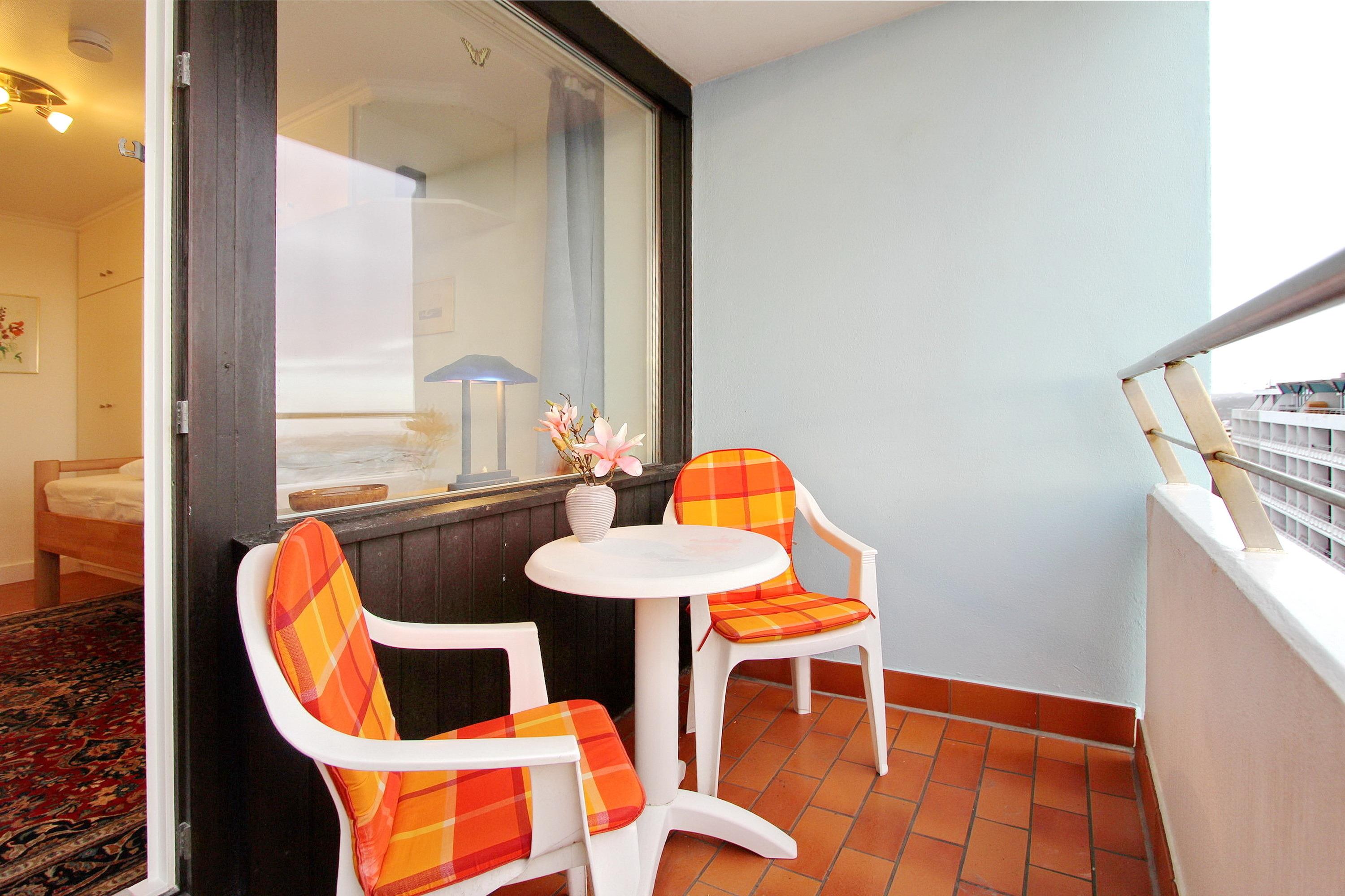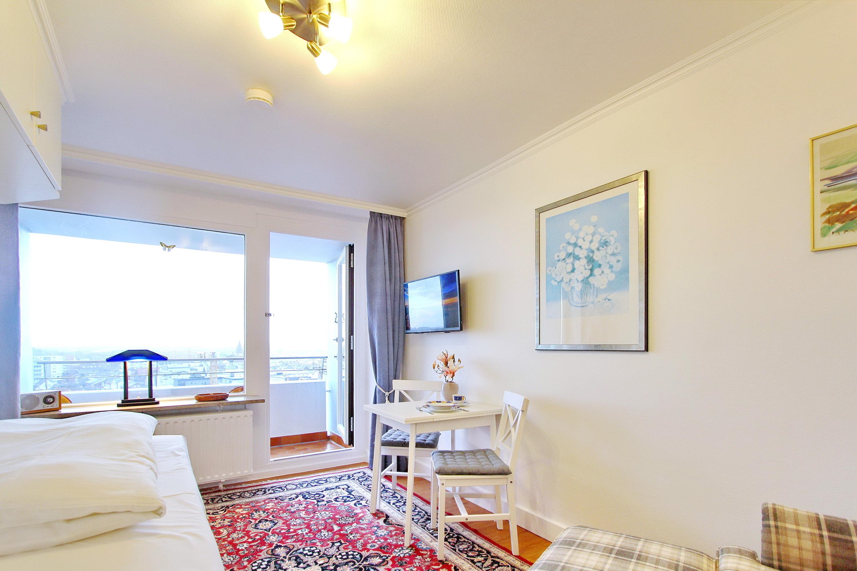 Sehr nette 1-Zimmer-Wohnung in der 9. Etage im Haus Metropol mit herrlichem Blick über die Stadt und die Insel - bei schönem Wetter schauen Sie bis zum nordfriesischem Wattenmeer und zum Festland. Der hell und freundlich gestaltete Wohn-/Schlafraum mit vorgelagertem Ostbalkon verfügt über ein Einzelbett, einem Essplatz mit 2 Stühlen und einem gemütlichen Sessel mit Fußhocker. In der, im Flur befindlichen, Küchenzeile finden Se einen Backofen, einen Herd mit 4 Platten, einen Geschirrspüler und ein Kühlschrank mit Gefrierfach und alles um sich selbst zu verpflegen. Modernes Badezimmer mit Eckdusche und WC. Zur technischen Ausstattung gehört ein Radio und ein Flachbild-TV. Nichtraucherwohnung. Das freie Wlan-Netz (WEG Haus Metropol - Passwortfrei - ohne Gewähr) können Sie kostenfrei nutzen. Wohnungsgröße ca. 23 m².