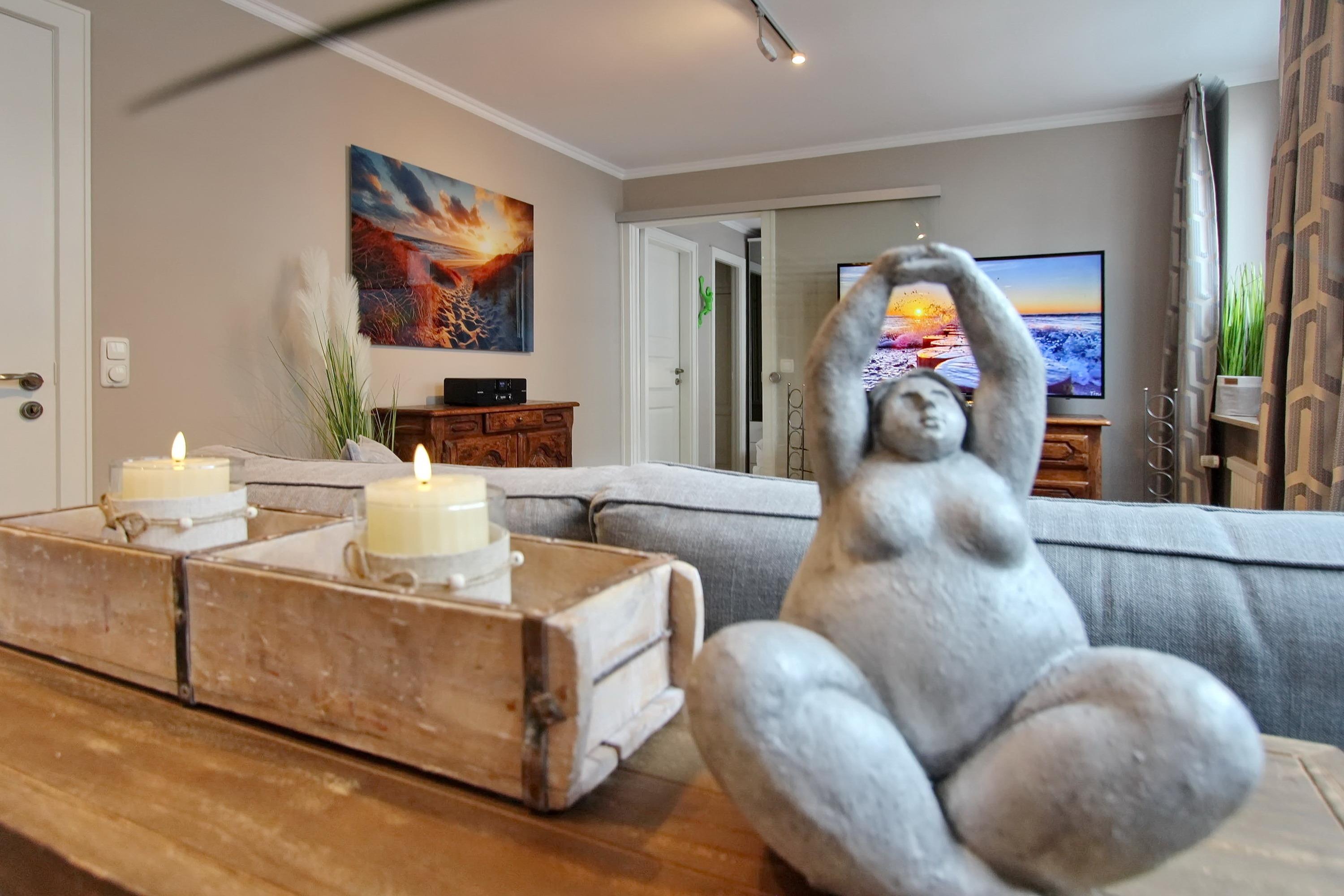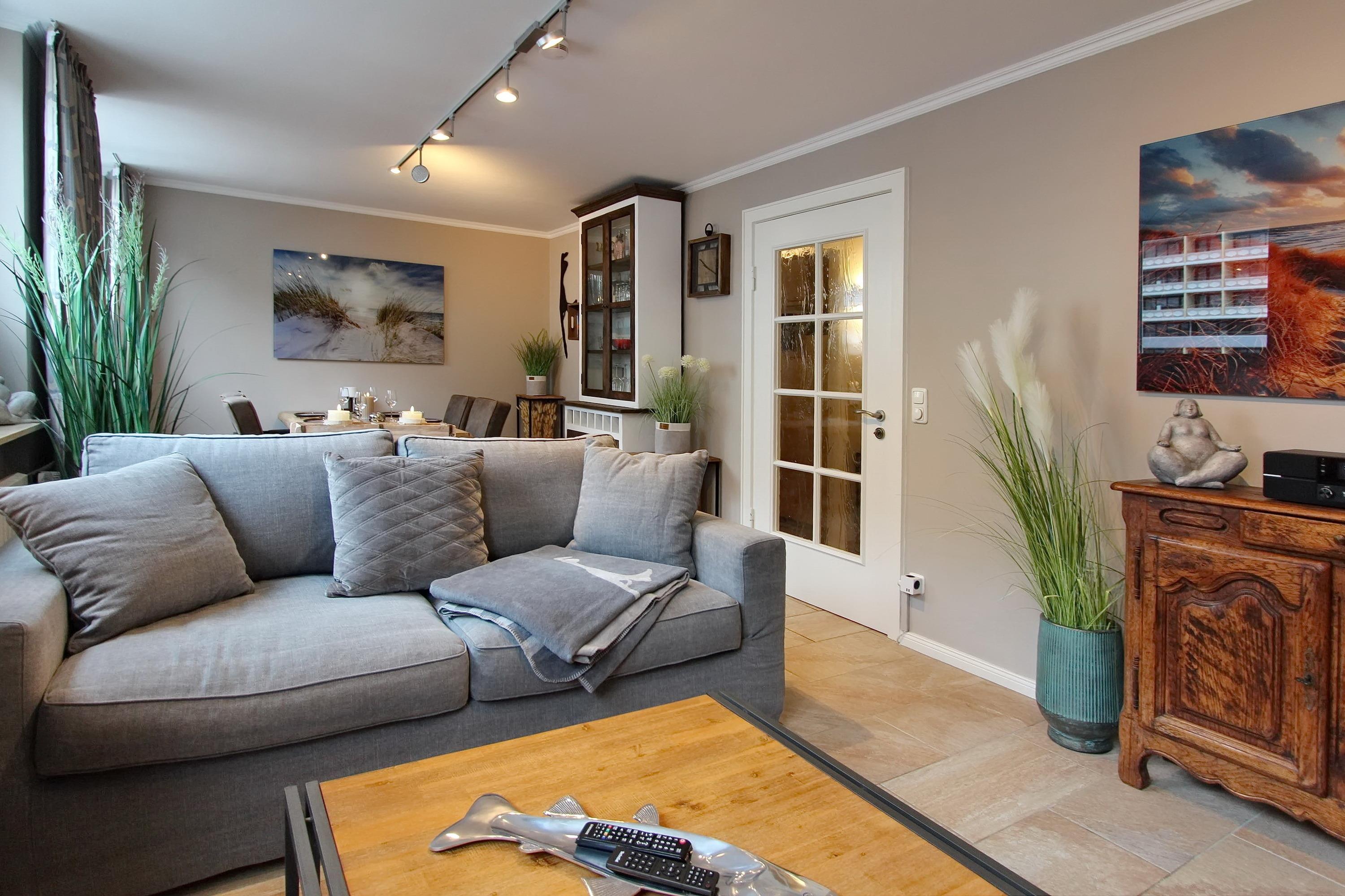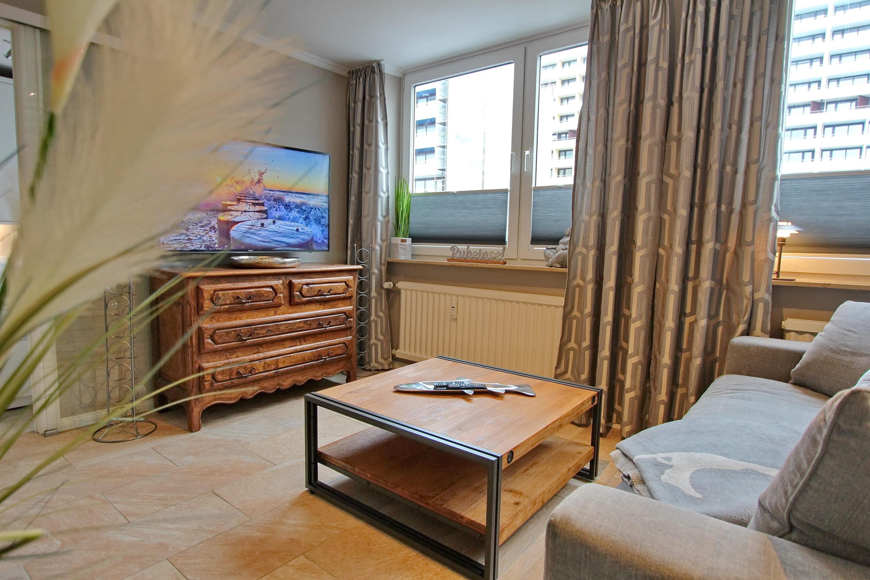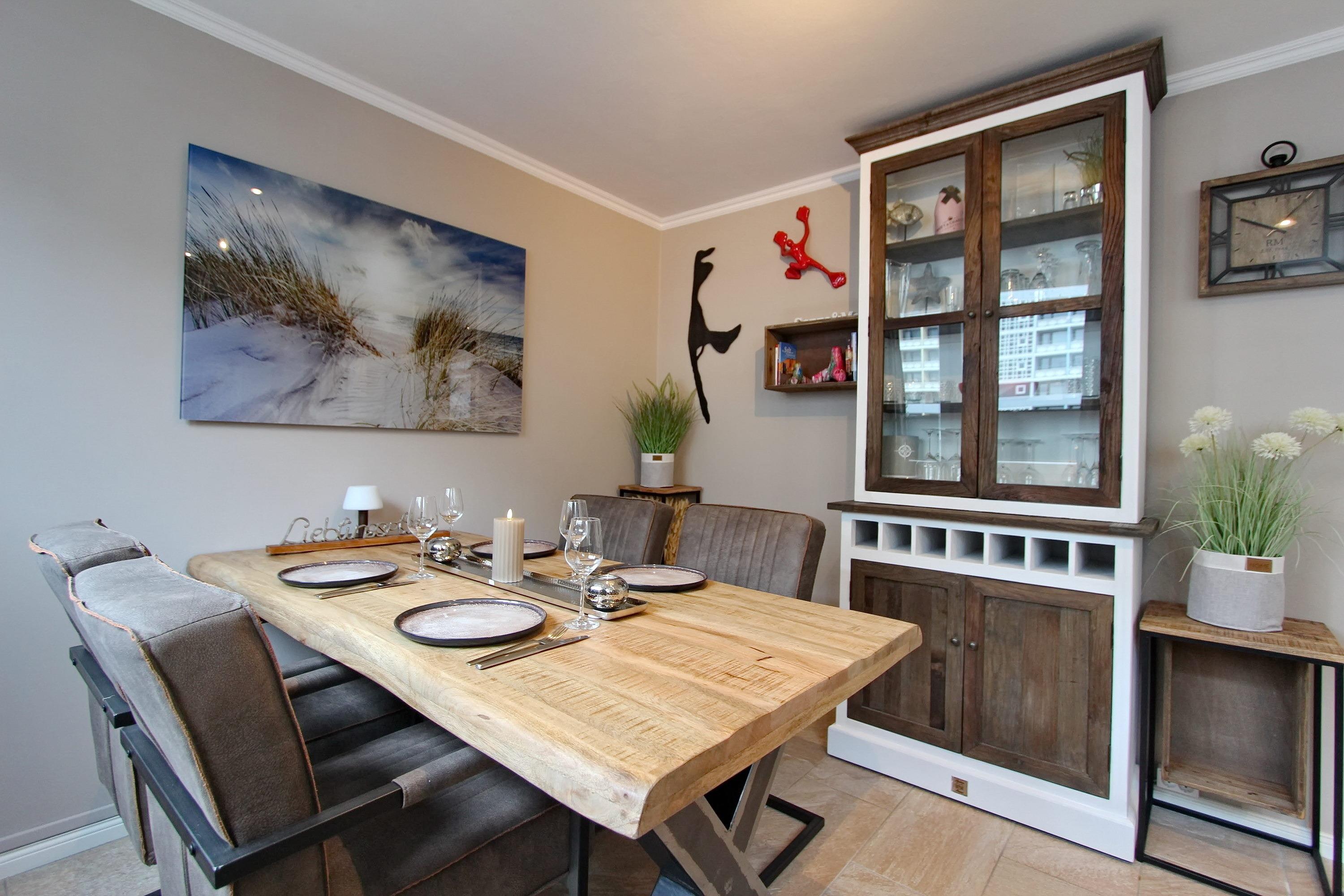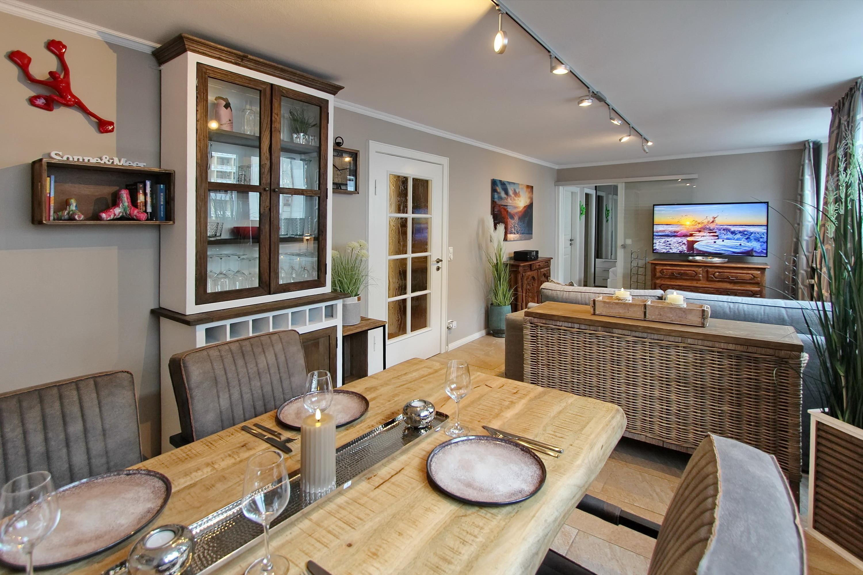 Die Wohnung ist mit ganz viel Liebe zum Detail und vielen kleinen Accessoires eingerichtet. Modern und antik wird hier gekonnt kombiniert. Der Wohnraum ist mit einer gemütlichen Couchgarnitur und einem tollen großzügigem Echtholz-Essplatz mit 4 Polsterstühlen ausgestattet. Im angrenzenden Schlafzimmer befindet sich ein Doppelbett und viel Stauraum und noch ein zusätzlicher kleiner Raum mit eingebauten Schränken. Die separate Küche ist voll ausgestattet mit einen 4 Platten-Induktionskochfeld, einer Mikrowelle, einem Geschirrspüler und einem Kühlschrank mit integriertem Gefrierfach. Duschbad/WC mit Halbrundtusche, großzügigem Waschtisch und Handtuchheizkörper. Nichtraucherwohnung. Wohnungsgröße ca. 45 m². Ein Hotspot im Haus ermöglicht Ihnen einen kabellosen und kostenfreien Zugang zum Internet (WEG-AD3 - Passwortfrei - ohne Gewähr).