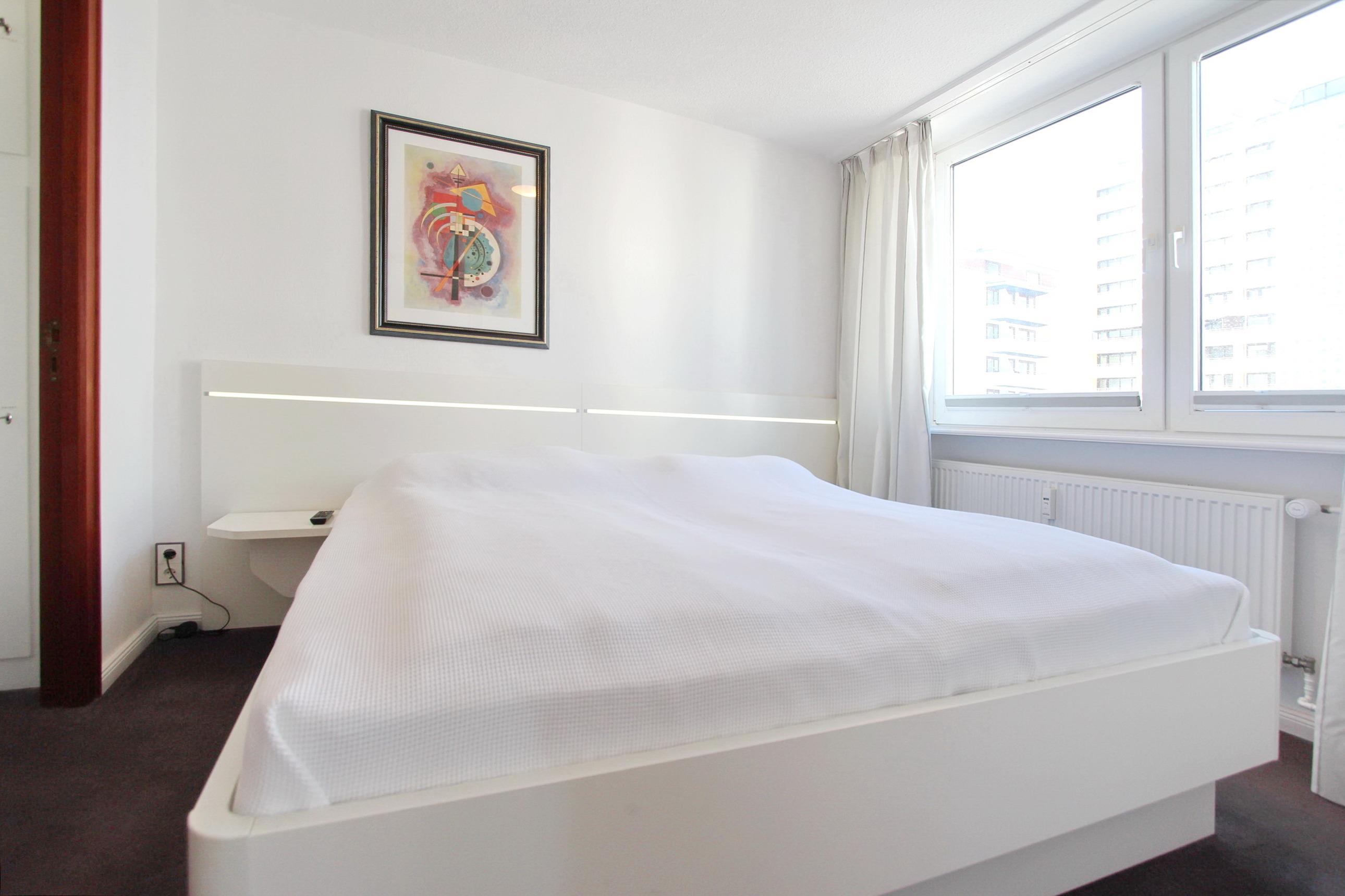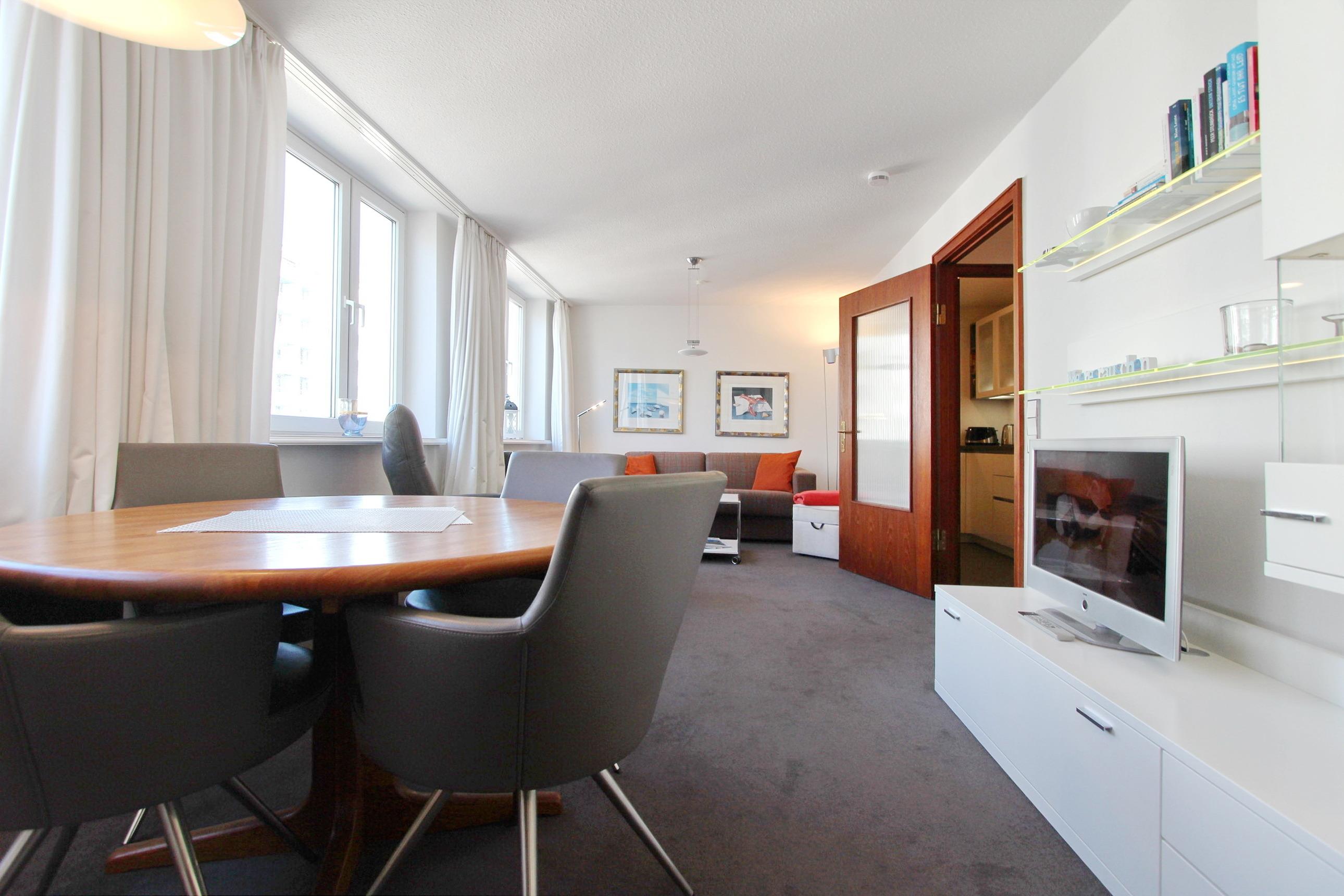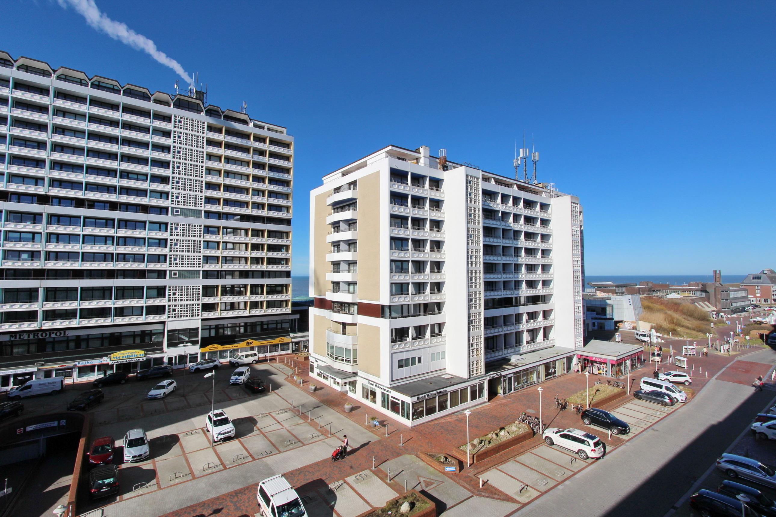 Schöne 2 Zimmer-Wohnung im Herzen von Westerland - sie befindet sich in der 5. Etage zur Westseite in einem mehrstöckigen Appartementhaus in unmittelbarer Nähe des Hauptstrandes und des Stadtzentrums. Der Wohnraum ist mit einer gemütlichen Couchgarnitur mit Schlaffunktion, 2 Swinger-Sesseln mit Hocker und einem Essplatz mit 4 Stühlen ausgestattet. Im Schlafzimmer befindet sich ein großes Doppelbett und ein begehbarer Kleiderschrank. Das angrenzende Duschbad verfügt über eine Dusche mit niedrigem Einstieg, WC und großem Waschtisch und einer Waschmaschine. In der separaten Küche finden Sie ein Ceran-Kochfeld mit 4 Platten, ein Backofen, ein Kühlschrank mit Gefrierfach und einen Geschirrspüler. Ein Hotspot im Haus ermöglicht Ihnen kabellosen und kostenfreien Zugang ins Internet (WEG-AD3 - Passwortfrei - ohne Gewähr). Nichtraucherwohnung. Wohnungsgröße ca. 40 m².