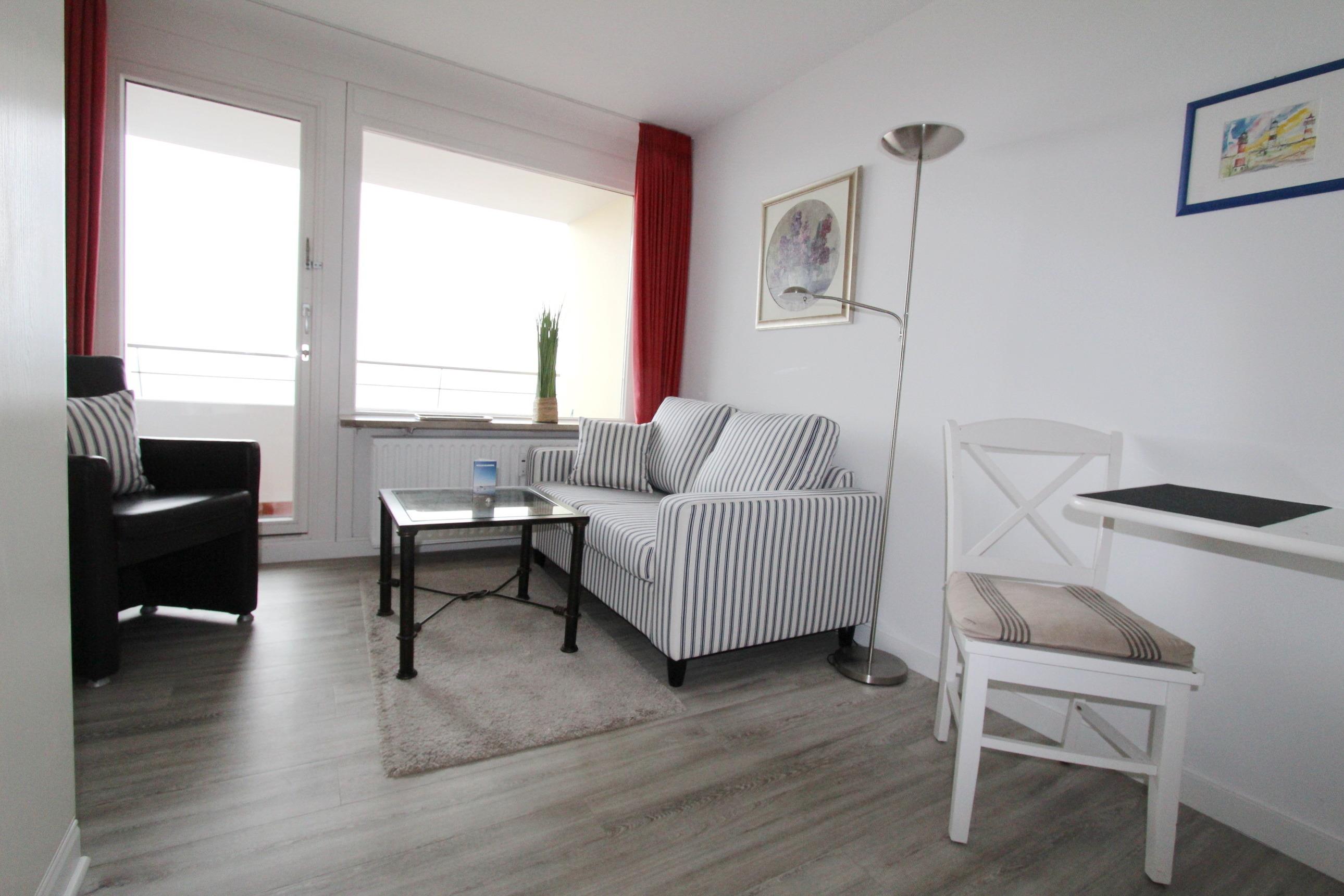 Wohlfühloase in der 5. Etage im Haus Metropol mit herrlichem Blick über den Strand und die Nordsee. Der kombinierte Wohn-/Schlafraum mit vorgelagertem Westbalkon und Balkonmöbeln verfügt über Einzelschrankbetten, einen Essplatz mit 2 Stühlen, sowie ein Sofa und einen Ledersessel am Fenster. In der ganzen Wohnung wurde Designfussboden verlegt. Die Einbauküche mit 2 Platten Ceranfeld, Dunstabzugshaube und zusätzlicher Nespressomaschine ermöglicht ihnen sich selbst zu verpflegen. Im Badezimmer gibt es eine Dusche. Zur technischen Ausstattung dieser Nichtraucherwohnung gehört: ein Flachbildfernseher und ein Tivoli-Radio mit Bluetooth. Ein freies WLAN Netzwerk (WEG Haus Metropol - Passwortfrei - ohne Gewähr) steht ihnen kostenfrei zur Verfügung. Wohnungsgröße: ca. 25 m².