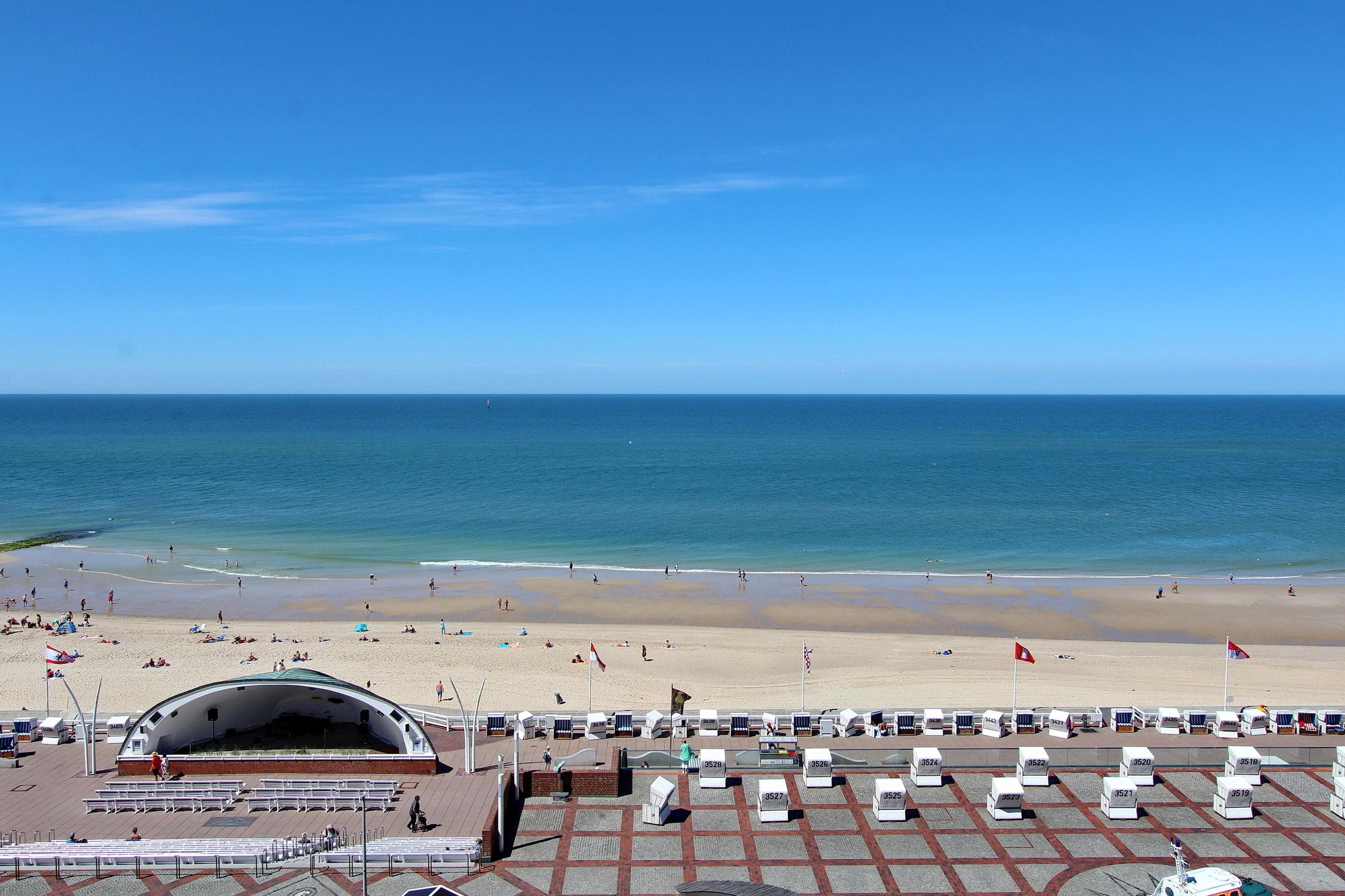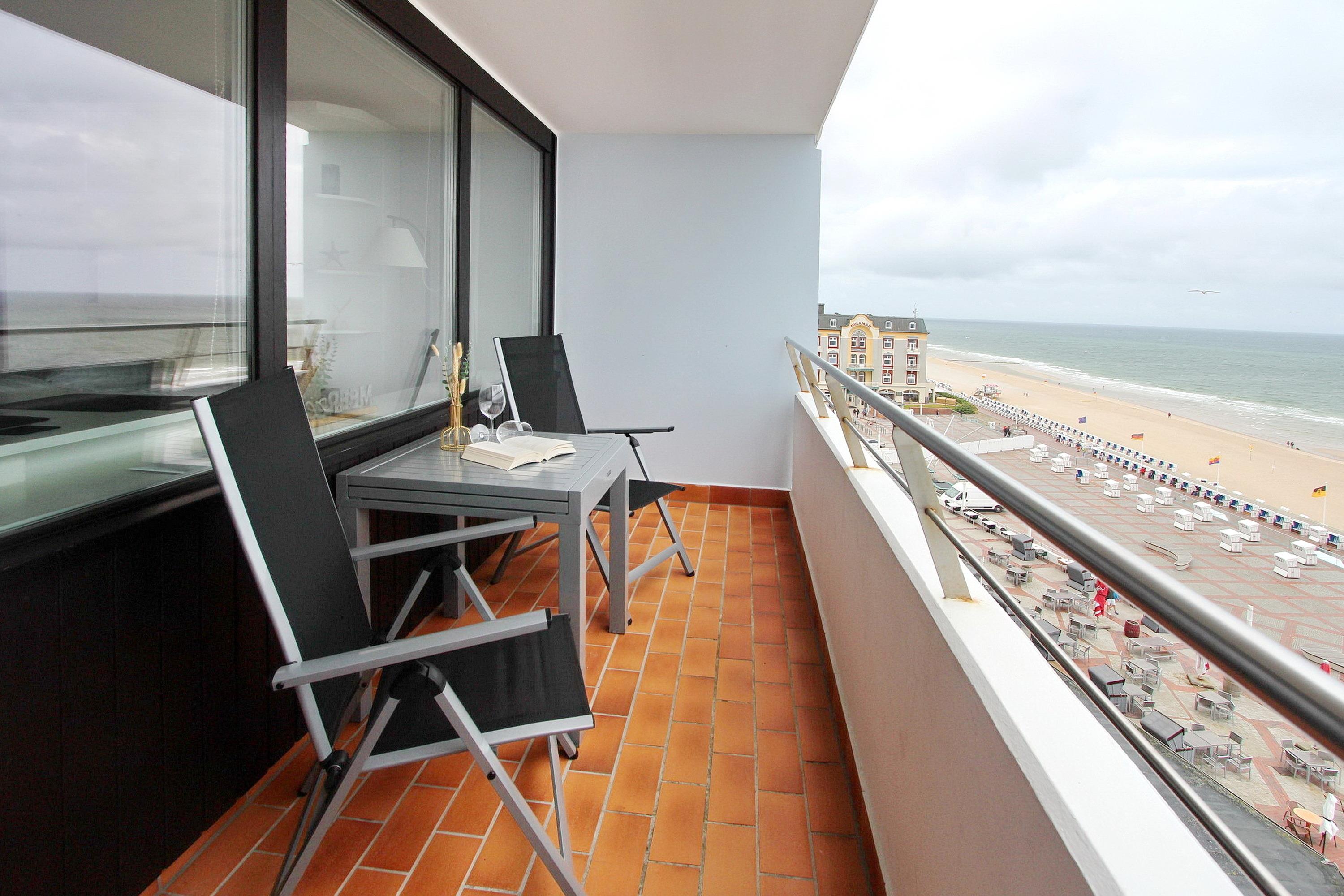 Diese Wohnung in der 5. Etage im Haus Metropol zur Seeseite hat einen herrlichen Blick über den Strand und die Nordsee. Sie ist hell und freundlich eingerichtet und hat einen vorgelagerten Westbalkon mit Balkonmöbel mit Sitzauflagen. Der kombinierte Wohn-Schlafraum verfügt über Laminatfußboden, ein Doppelschrankbett einen Essplatz am Fenster mit 2 Rattanstühlen und eine Sitzgruppe mit Fernsehsessel und Fußhocker. Im Badezimmer gibt es eine Dusche, einen beheizten Handtuchhalter, Duschhocker, einen mobilen Haltegriff für die Dusche und einen Fön. In der Einbauküche im Flur mit Ceranfeld, Geschirrspüler und Mikrowelle können sie bequem kleine Mahlzeiten zubereiten. Zur technischen Ausstattung dieser Wohnung gehört: ein Flachbildfernseher, eine Bluetoothanlage mit CD Player und Radio von Sony. Ein freies WLAN Netzwerk (WEG Haus Metropol - Passwortfrei - ohne Gewähr) steht ihnen kostenfrei zur Verfügung. Diese Nichtraucherwohnung hat eine Größe von ca. 42 m².
