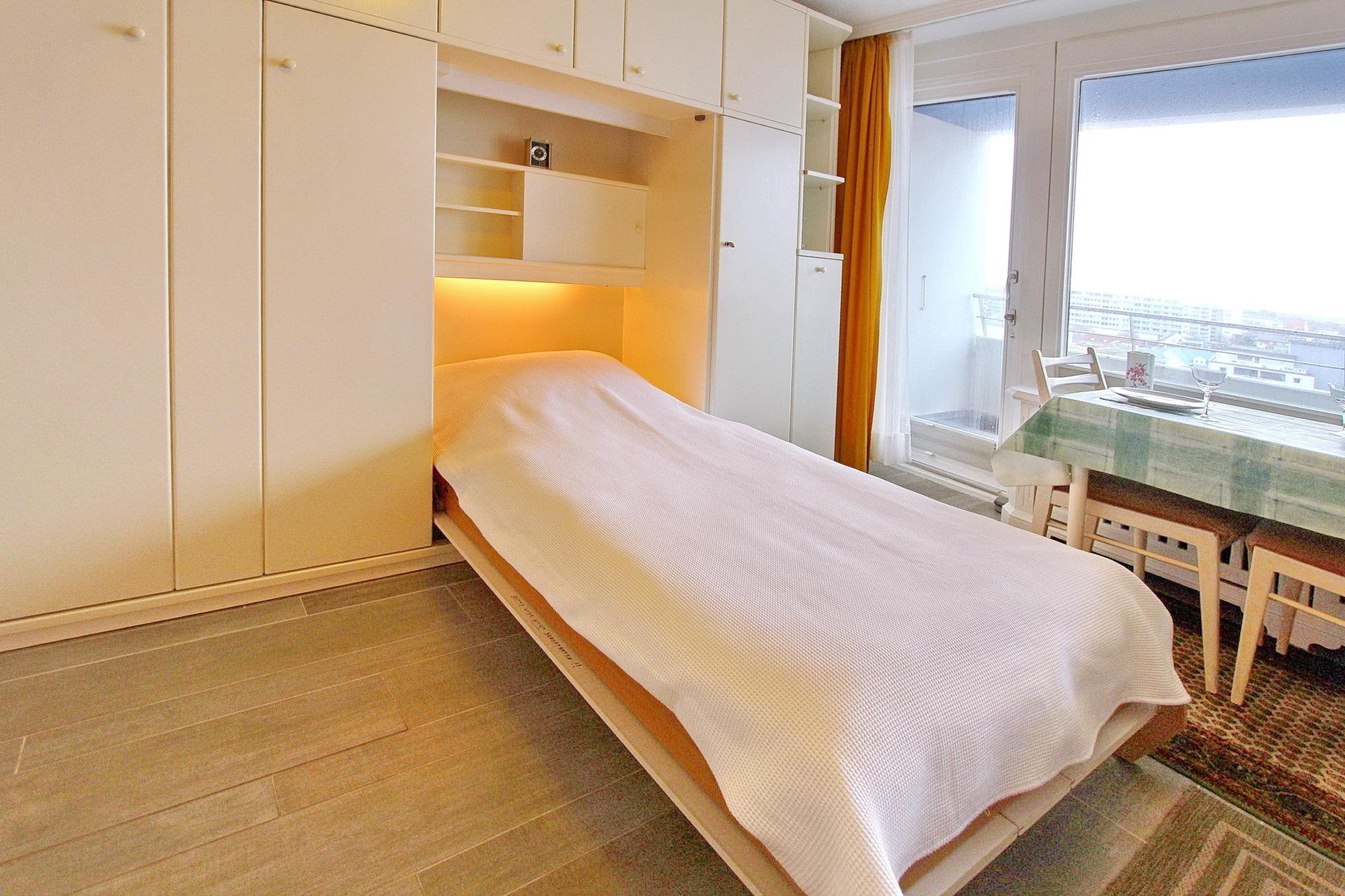 In der 6. Etagen des Haus am Meer befindet sich diese Einzimmerwohnung. Wenige Schritte trennen Sie vom Strand und dem Meer. Der kombinierte Wohn-/Schlafraum mit vorgelagertem Ostbalkon (Balkonmöbel und Auflagen sind vorhanden) ist mit Einzelschrankbetten, einer Couch, einem Sessel und einem Essplatz am Fenster mit 2 Stühlen eingerichtet. Fliesenboden macht diese Wohnung auch für Allergiker geeignet. Das neue, moderne Badezimmer hat eine Dusche mit niedrigem Einstieg. Im Flur befindet sich eine Küchenzeile mit Backofen und ein Herd mit 3 Kochplatten. Zur technischen Ausstattung dieser Wohnung gehört: ein Flachbildfernseher und ein Radio. Den kosten-und passwortfreien Zugang zum WLAN Hot Spot (WEG Haus am Meer - Passwortfrei - ohne Gewähr) können Sie gerne nutzen. Wohnungsgröße: ca. 32 m².