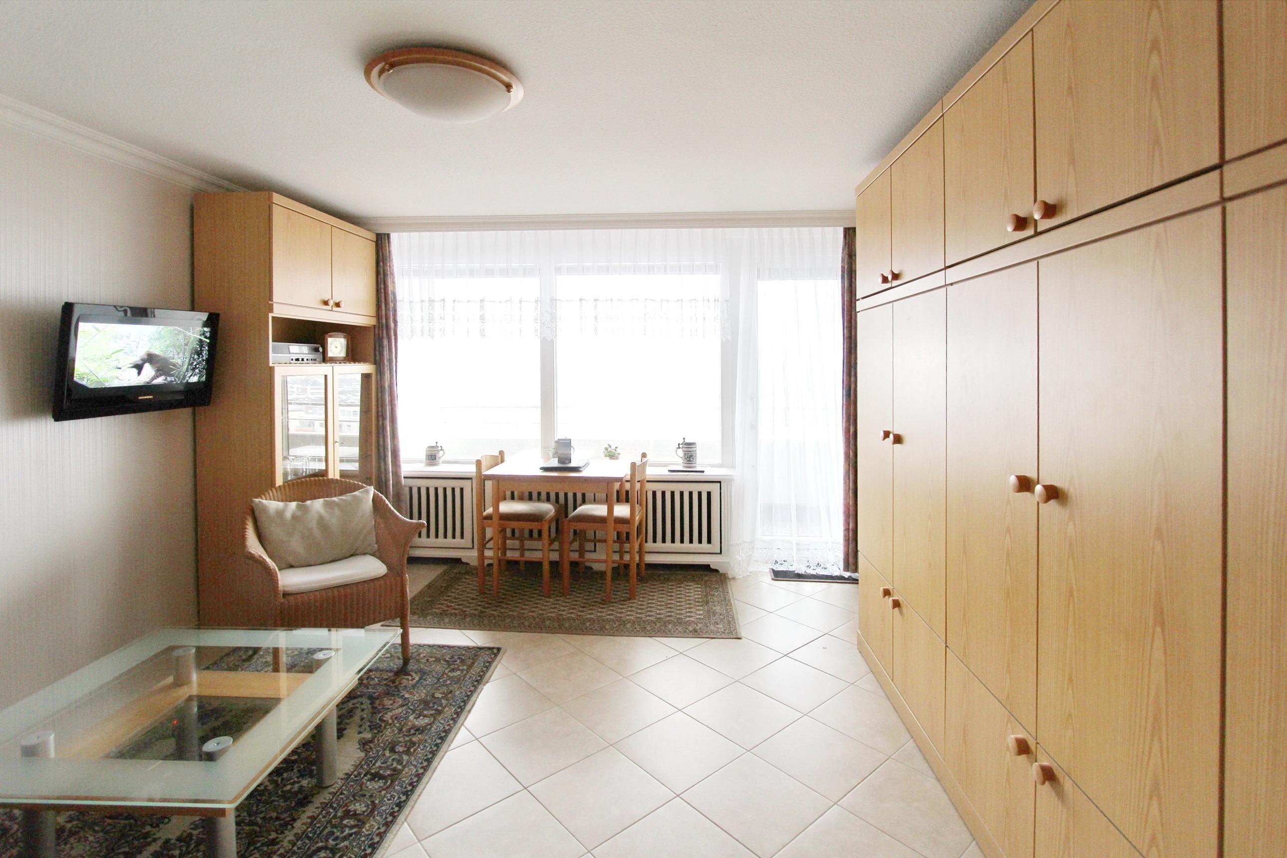 Diese Einzimmerwohnung befindet sich in der 7. Etage im Haus am Meer zur Landseite. Der Strand und die Westerländer Promenade sind fussläufig schnell zu erreichen und auch die Fussgängerzonen Friedrich-und Strandstraße sind gleich um die Ecke. Der kombinierte Wohn-/Schlafraum mit vorgelagertem Ostbalkon (Plastikstühle mit Auflagen und ein Tisch sind vorhanden) ist ausgestattet mit Fliesenboden, Einzelschrankbetten, einem Essplatz am Fenster mit 2 Stühlen und einer Couchgarnitur. Das Badezimmer hat eine Dusche mit niedrigem Einstieg. In der Küchenzeile im Flur mit Cerankochfeld (4 Kochplatten), Backofen und Geschirrspüler können sie sich selbst verpflegen. Zur technischen Ausstattung dieser Wohnung gehört: ein Flachbildfernseher und ein Radio. Den WLAN Hotspot (WEG Haus am Meer - Passwortfrei - ohne Gewähr) können sie kosten und passwortfrei nutzen. Wohnungsgröße: ca. 32 m².