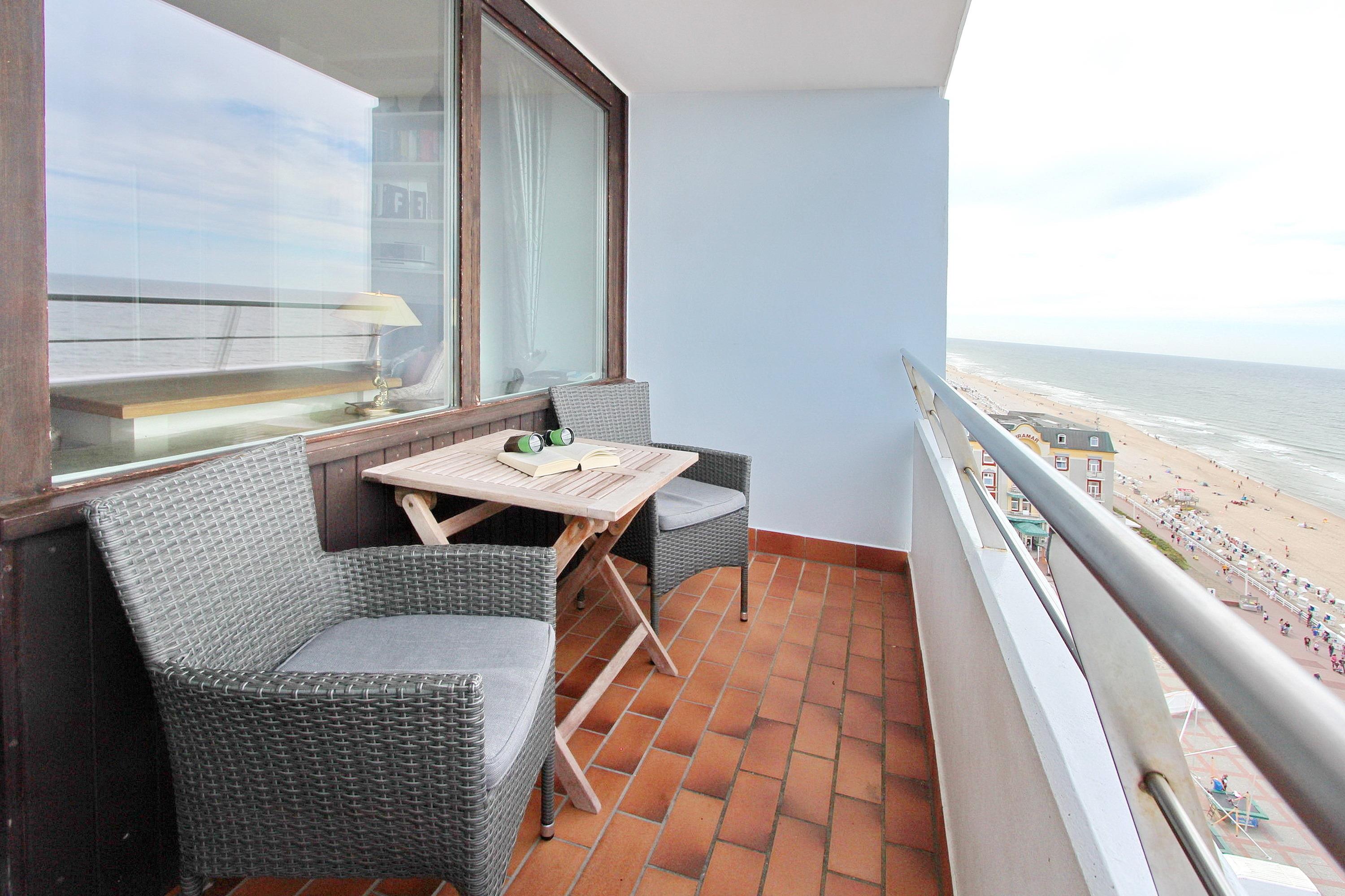 Urlaubsdomizil im Haus Metropol in der 10. Etage mit herrlichem Blick über den Strand und die Nordsee. Der kombinierte Wohn-/Schlafraum mit vorgelagertem Westbalkon (Balkonmöbel mit Auflagen sind vorhanden) ist eingerichtet mit Einzelschrankbetten, einem Designfußbodenbelag, einem Essplatz mit 2 Rattansesseln und einer Ledercouch. Im Badezimmer gibt es eine Dusche mit Haltegriff, einen Handtuchtrockner, Fön, Kosmetikspiegel und Hocker. In der Einbauküche im Flur, mit Geschirrspüler, Ceranfeld mit 2 Herdplatten und Backofen, können Sie sich selbst verpflegen. Zur technischen Ausstattung dieser Nichtraucherwohnung gehört: ein Flachbildfernseher und ein Bluetoothradio mit CD Player von Bose. Die Wohnung verfügt über ein eigenes Wlan-Netz, welches Sie kostenfrei nutzen können (Wlan-Schlüssel liegt im Appartement) und ein Telefon mit Flatrate. Haustiere sind ausdrücklich willkommen. Wohnungsgröße dieser Nichtraucherwohnung: ca. 34 m².