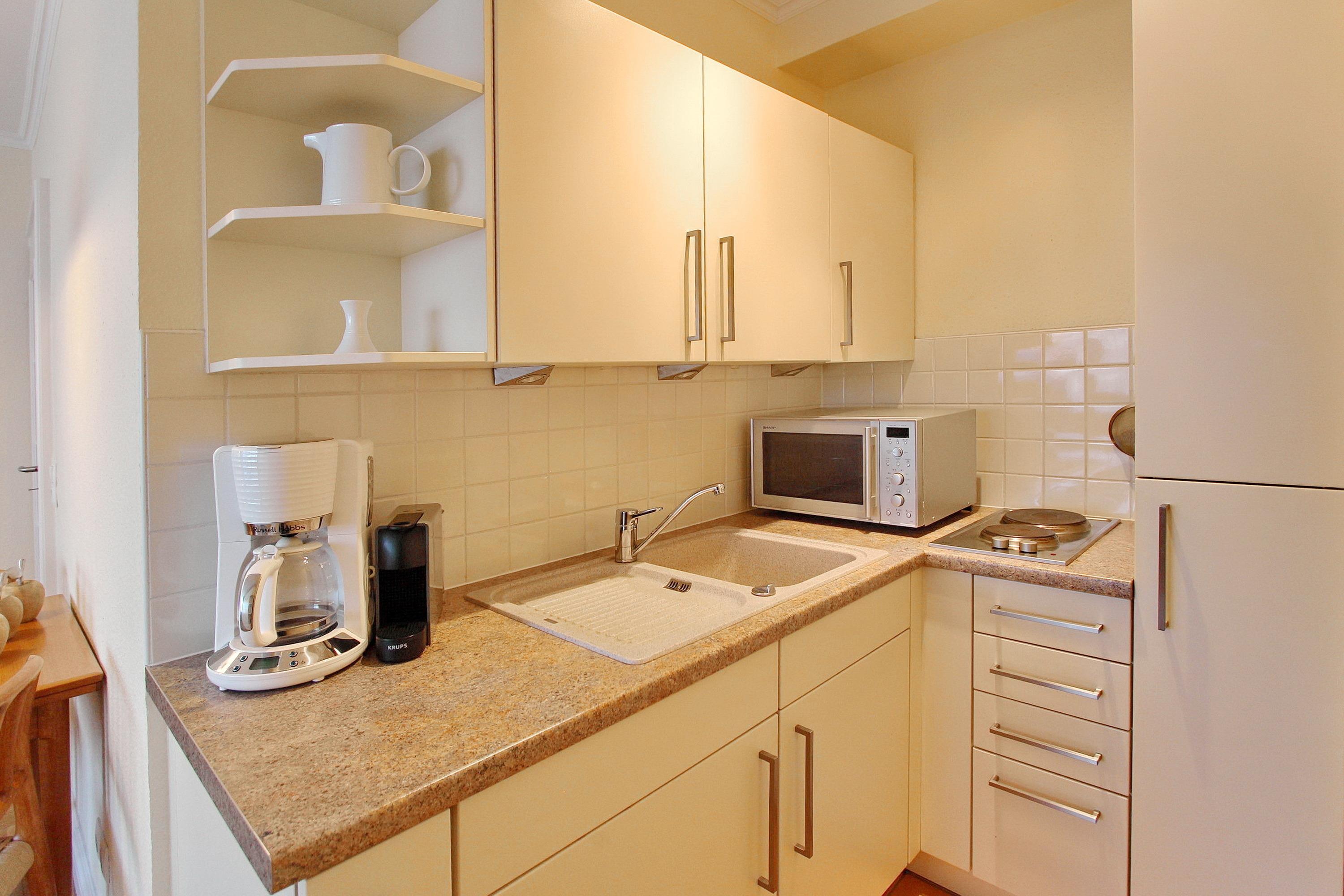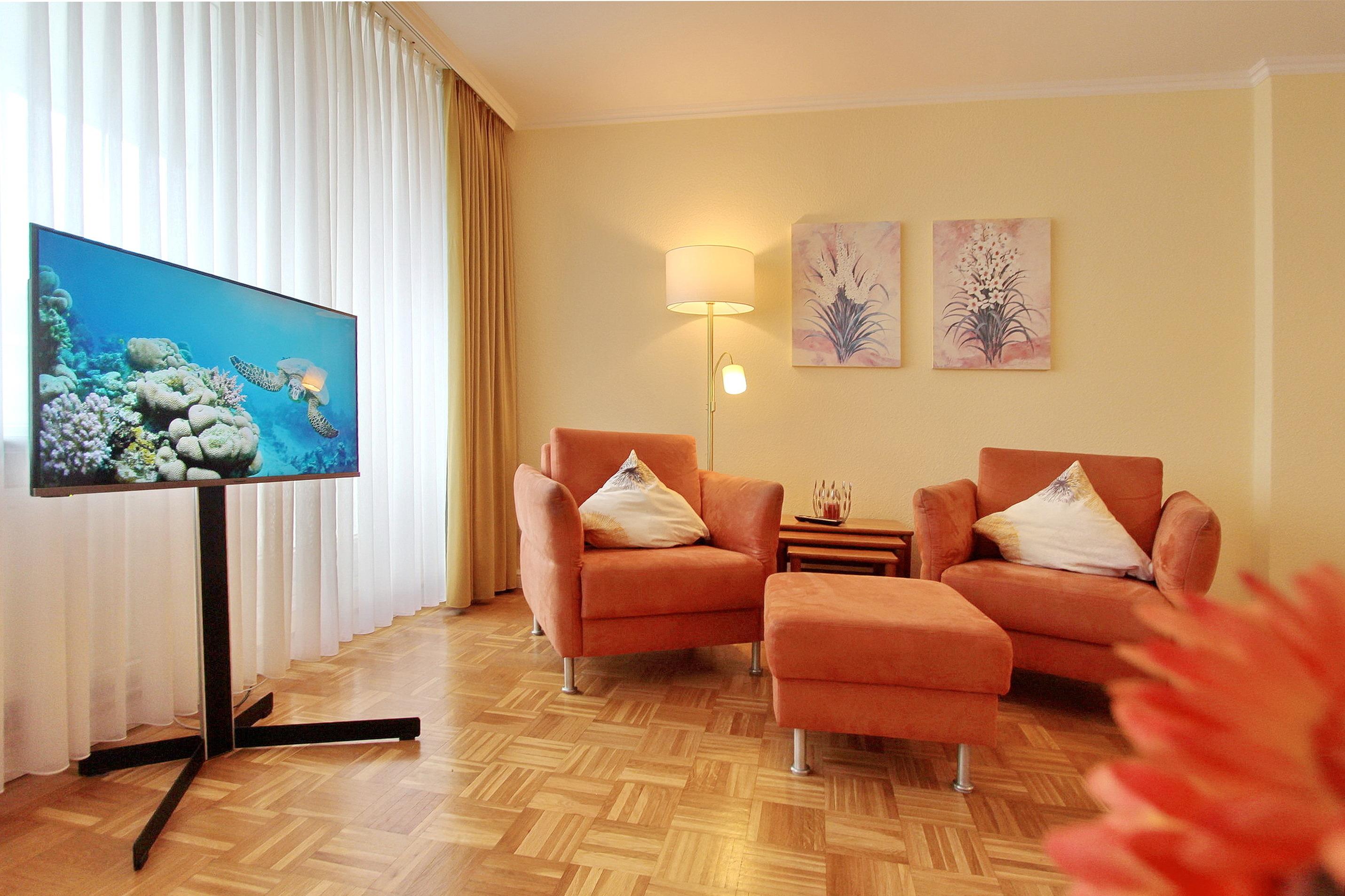 Hell und freundlich eingerichtete 1 Zimmer Wohnung in der 1. Etage zur Westseite. Diese Nichtraucherwohnung in unmittelbarer Strandlage ist mit Einzelschrankbetten, einem Essplatz für 2 Personen sowie einer komfortablen, ansprechende Sitzgruppe ausgestattet. In der offenen Küchenzeile im Wohnbereich (mit Mikrowelle und zusätzlicher Nespressomaschine) können sie einfach und schnell kleine Mahlzeiten oder ein köstliches Frühstück zubereiten. Im hellen Badezimmer gibt es eine Dusche und einen Handtuchtrockner. Den verglasten Westbalkon (Wintergarten) mit modernen Loungemöbeln können sie auch bei schlechtem Wetter nutzen. Diese Wohnung verfügt über einen modernen Flachbildfernseher von Panasonic. Wohnungsgröße: ca. 40 m².