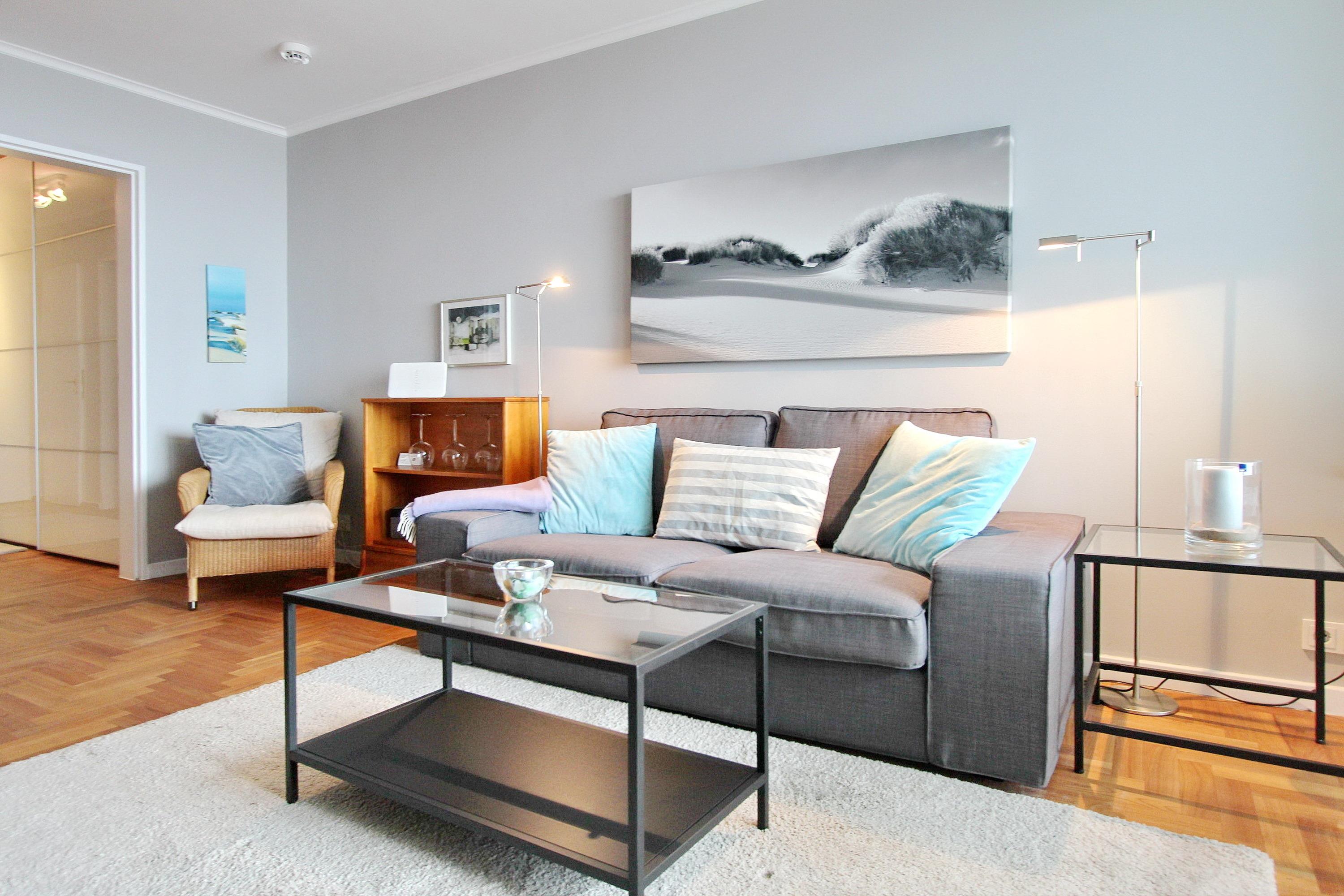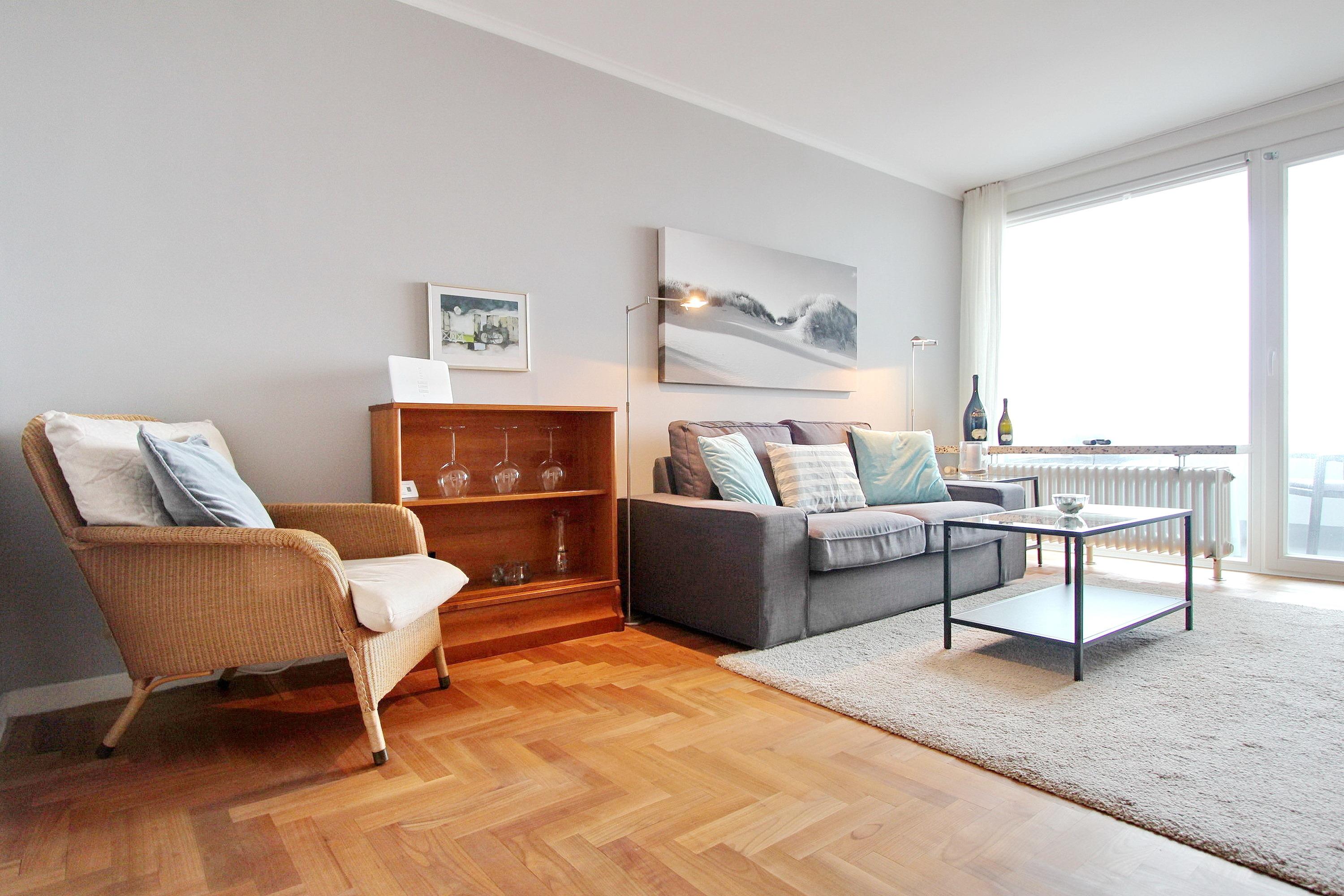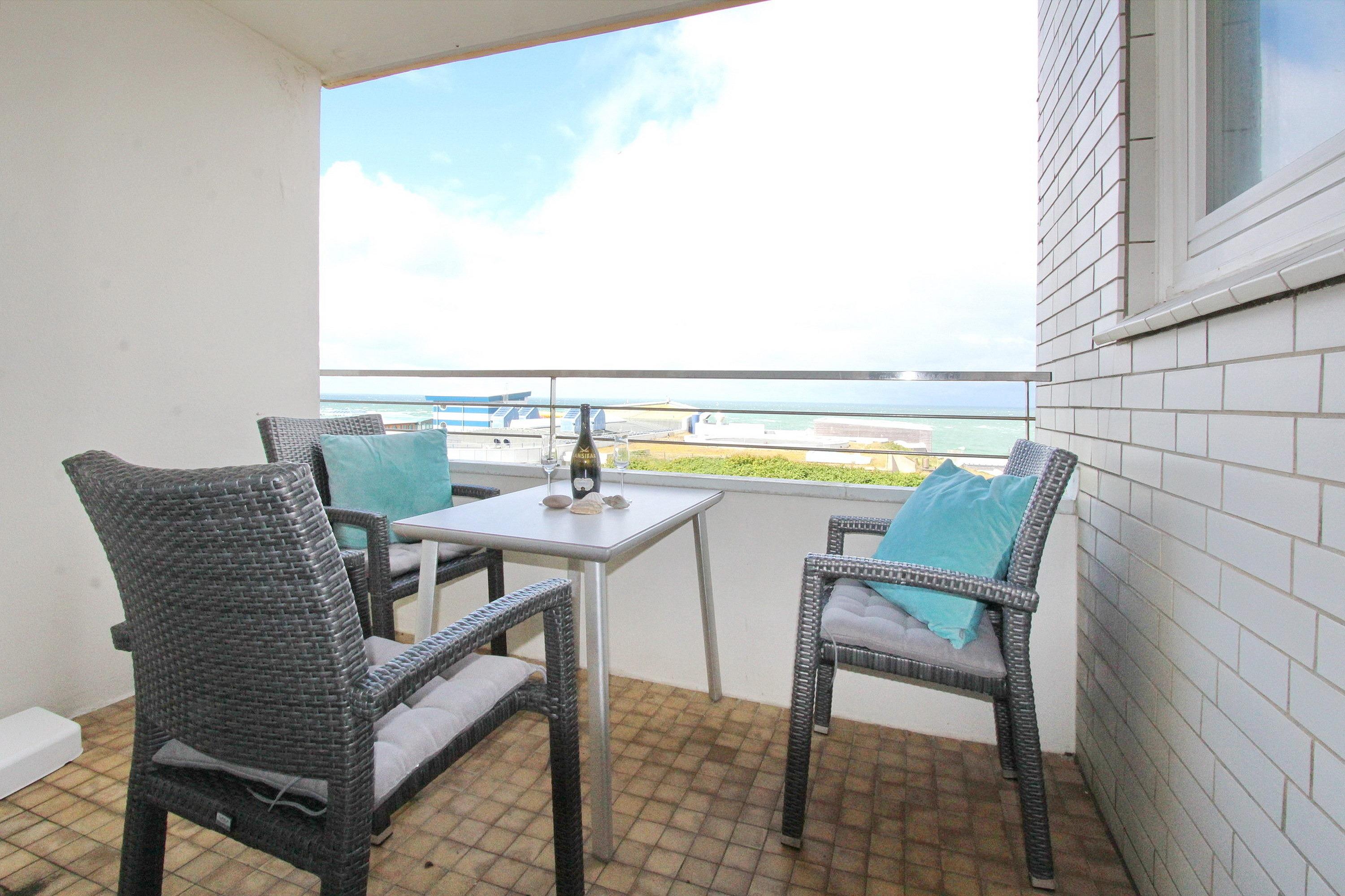 Ferienwohnung in der 5. Etage des Haus Eydum mit tollem Blick auf die Nordsee. Wenn man die Wohnung betritt steht man im Flur, im dem sich Schränke mit viel Stauraum befinden. Vom Flur geht eine Abstellkammer ab und das Badezimmer mit Dusche, Handtuchtrockner, Fön und Kosmetikspiegel. Der Einstieg der Dusche ist niedrig. Im Wohn-/Esszimmer gibt es eine bequeme Couch, 2 Korbstühle und ein Sideboard, zum offenen Küchenbereich gibt es einen Tisch mit 2 Stühlen. Um sich selbst zu verpflegen ist die Küche voll ausgestattet und verfügt über einen Geschirrspüler, ein 4 Platten Ceranfeld und einen großen Kühlschrank mit Gefrierfach. Selbst ein Smoothiemaker von WMF und eine zusätzliche Nespressomaschine sind vorhanden.