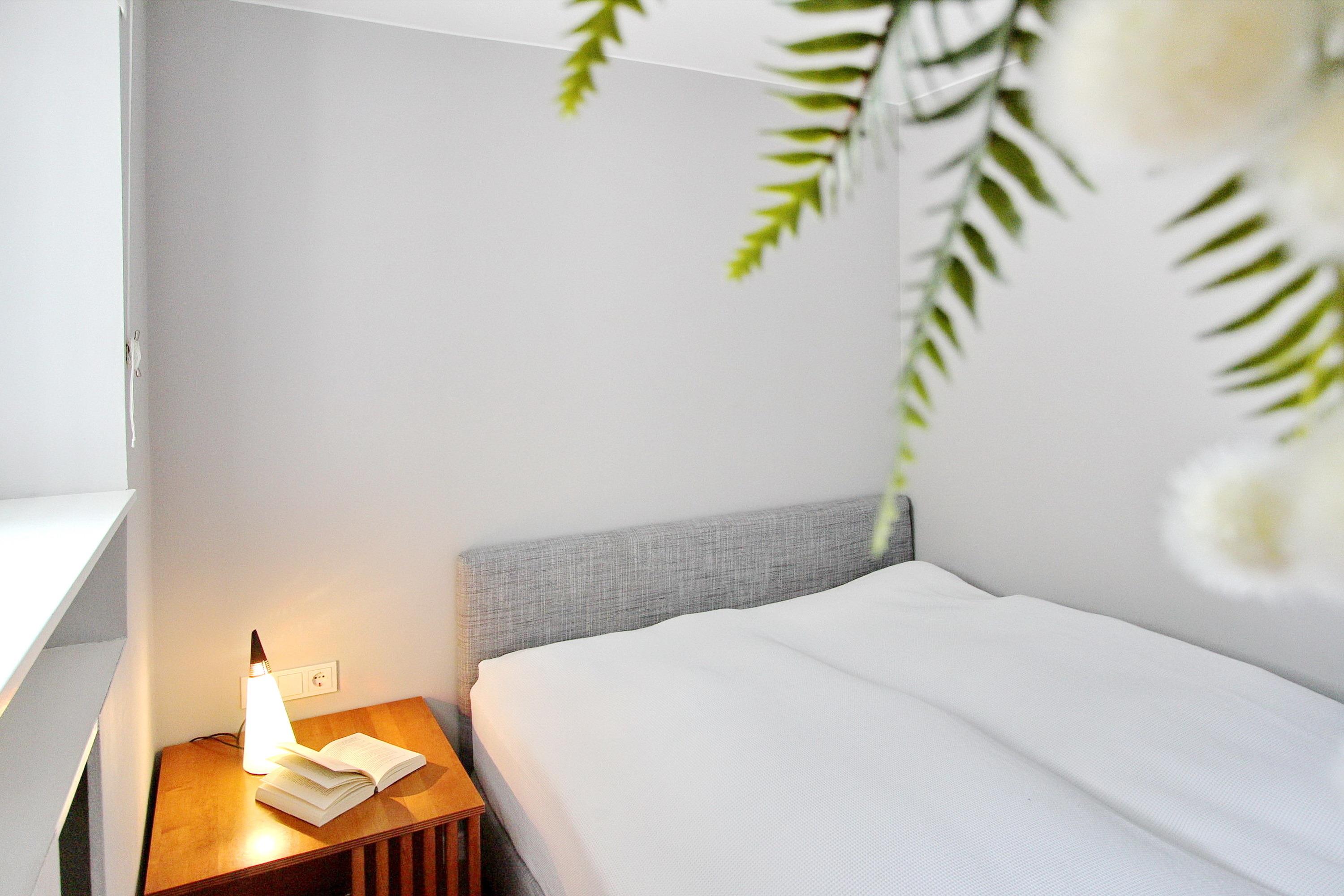 Vom Wohnbereich geht es in das kleine Schlafzimmer mit Fenster. Es steht ein Doppelbett drin, dass nur von einer Seite begehbar ist. Vom Wohnbereich kann man auf den Balkon gehen. Sie sitzen dort auf Rattanmöbeln (3 Stühlen und ein Tisch). Zur technischen Ausstattung der Wohnung gehört ein Smart Fernseher von Panasonic (mit T-Home Entertain), ein DVD Player und eine Soundbox von Bose. Das WLAN des Eigentümers können Sie kostenfrei nutzen (die Zugangsdaten finden sie auf dem Router in der Wohnung). Den kostenfreien Parkplatz Nr. 69 (hinter dem Haus, rechte Seite, 5. Stellplatz von unten gezählt) können Sie gerne nutzen. Eine große Auswahl an Büchern und DVDs steht Ihnen in dieser Nichtraucherwohnung zur Verfügung. Die Wohnungsgröße ist ca. 45 m².