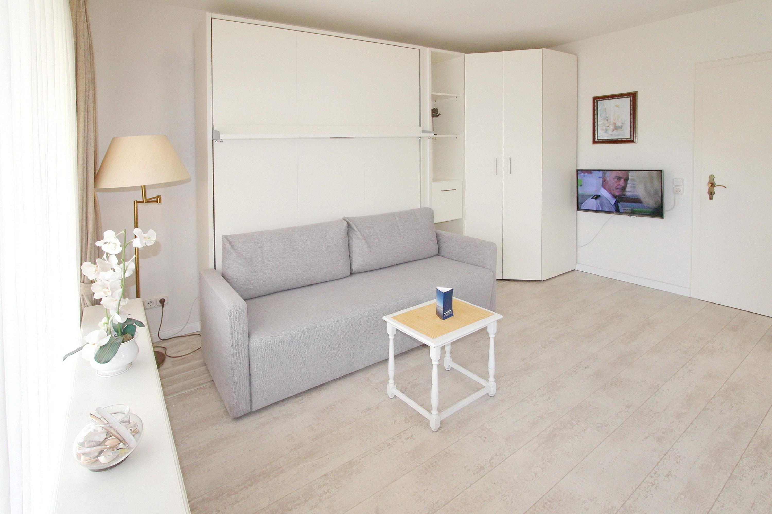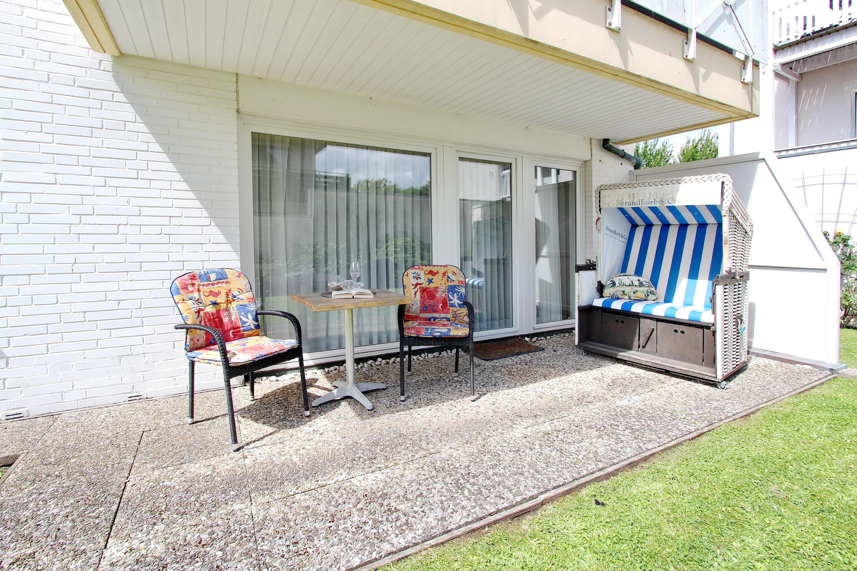 Einzimmerwohnung im Erdgeschoss, mitten in der Westerländer Innenstadt mit Ostterrasse, Strandkorb und kleinem Gartenanteil. Der kombinierte Wohn-/Schlafraum ist eingerichtet mit einem Doppelschrankbett, einem Essplatz mit 2 Stühlen, einer Couch und Fernsehsessel. In der offenen Einbauküche gibt es ein Ceranfeld und eine Dunstabzugshaube. Im Wohnraum wurde hochwertiger Laminatfußboden verlegt. Das 2021 neu renovierte Badezimmer hat eine Dusche mit niedrigem Einstieg, einen Fön und den Vorteil eines Fensters zur direkten Belüftung. Zur technischen Ausstattung dieser Wohnung gehört: ein moderner 32 Zoll Flachbildfernseher von Panasonic und ein Radio. Garage 6 steht Ihnen kostenfrei zur Verfügung. Im Haus befindet sich ein Wasch-und Trockenautomat mit Münzeinwurf. Diese Nichtraucherwohnung hat eine Größe von ca. 35 m².