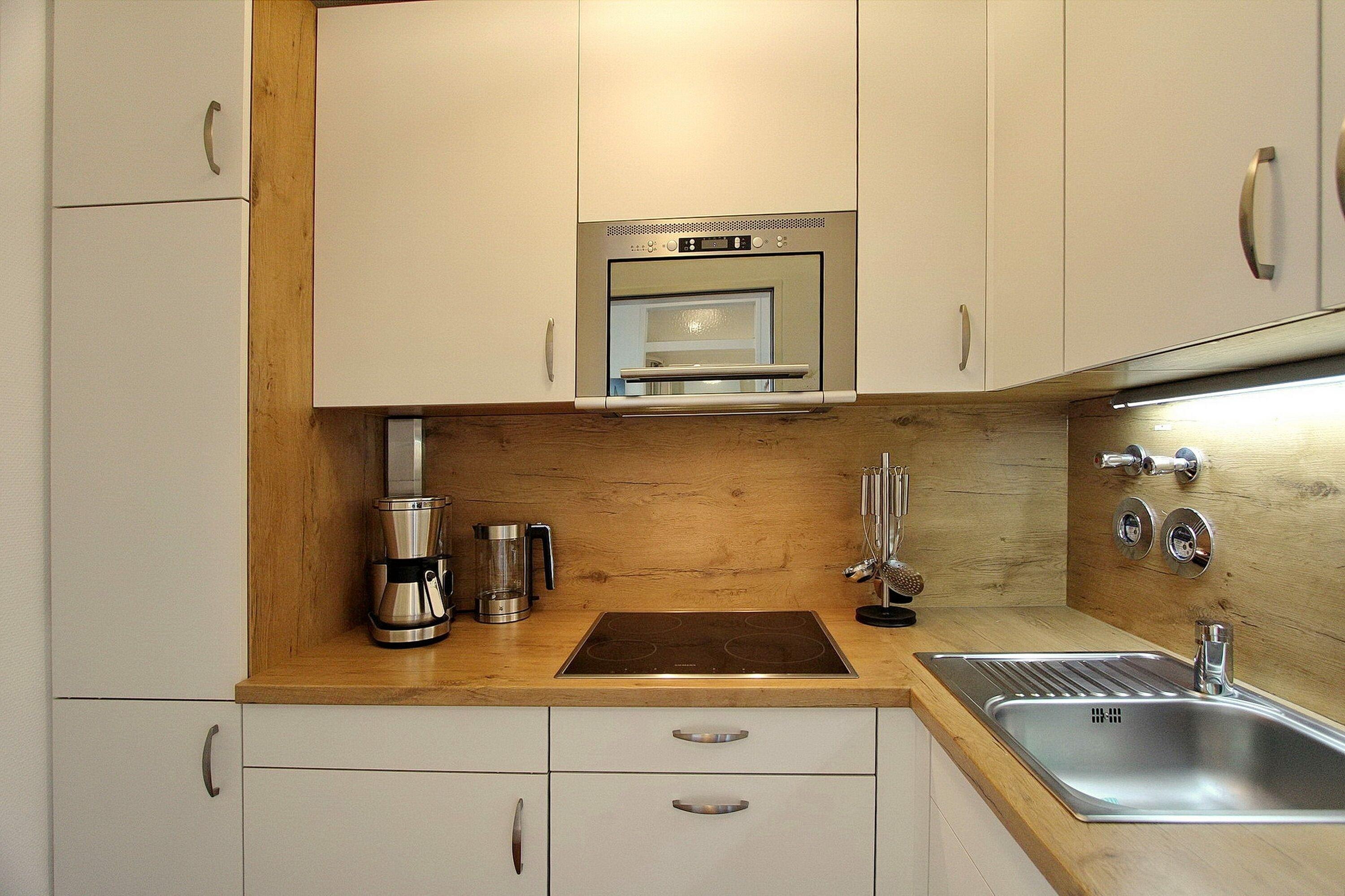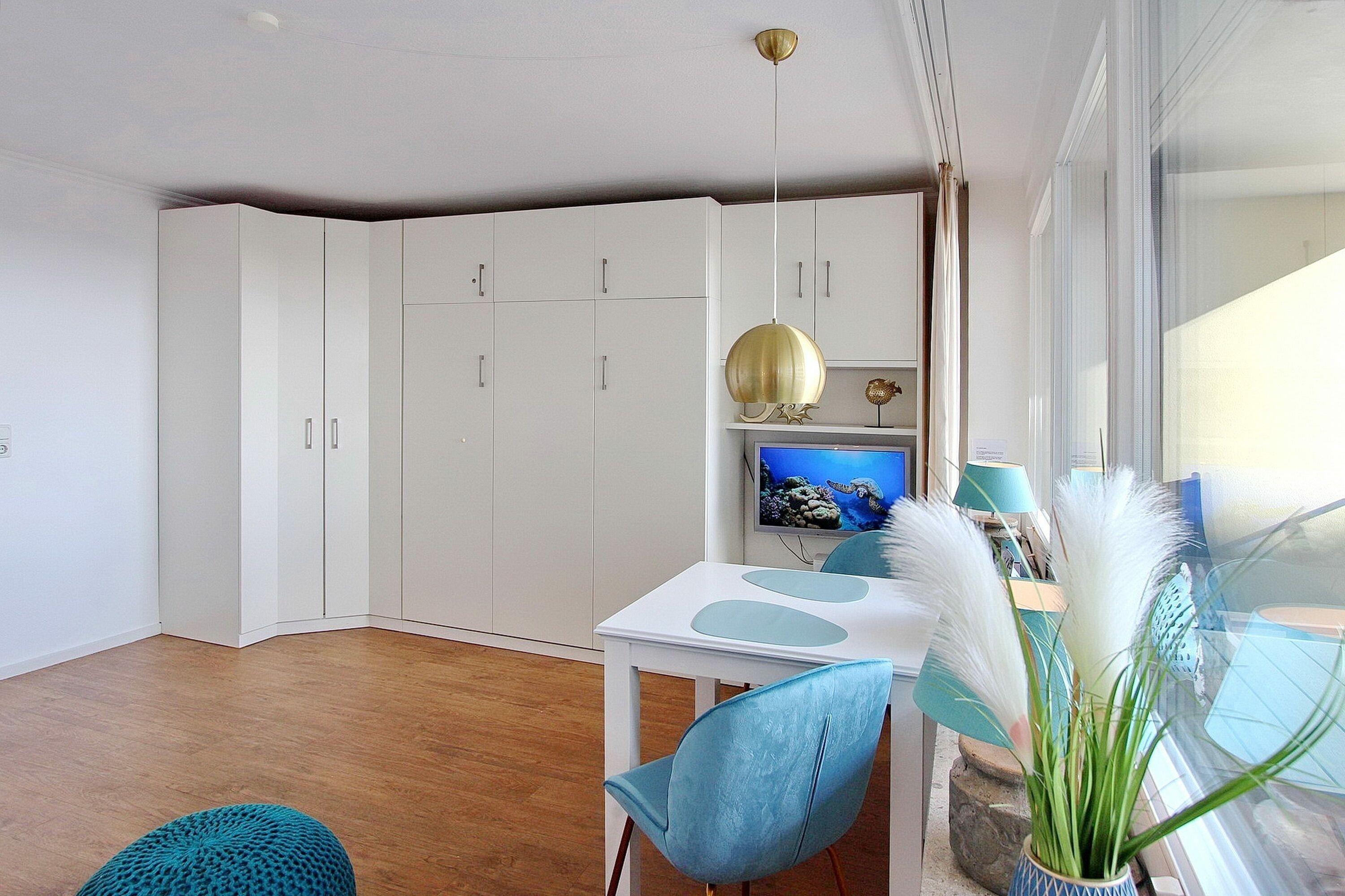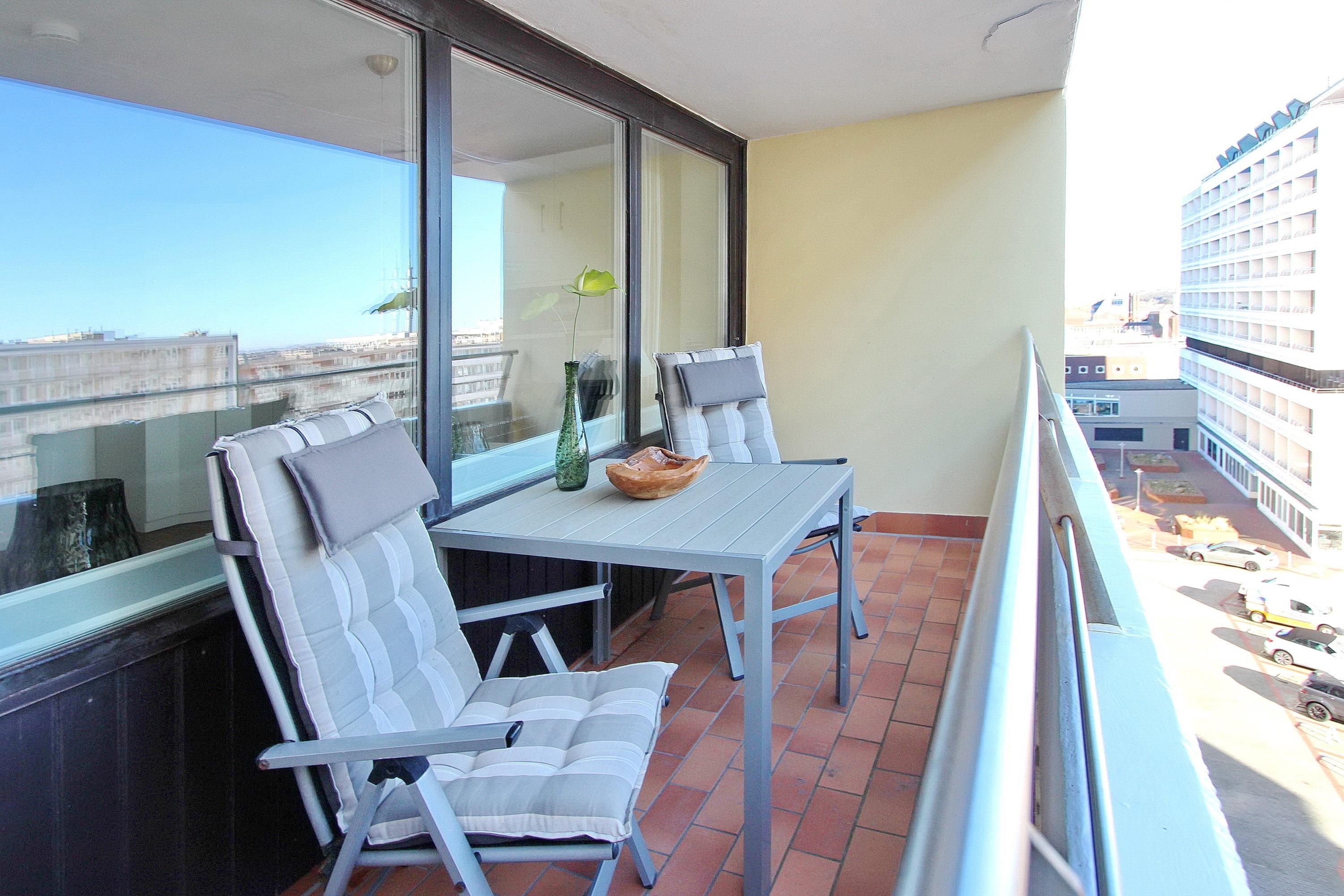 Hell und freundlich eingerichtetes Appartement in der 4. Etage im Haus Metropol für 2 Personen mit vorgelagertem, großen Ostbalkon (inkl. Balkonmöbeln und Auflagen). Der gemütliche Wohn-Schlafraum verfügt über ein Doppelschrankbett (mit 2 Matratzen), eine Couch und einen Fernsehsessel sowie einen Essplatz mit 2 Stühlen am Fenster. In der ganzen Wohnung wurde Designfußboden verlegt. Das Badezimmer mit Dusche, Kosmetikspiegel, Fön und Hocker verfügt über ausreichend Platz und viel Stauraum für Ihre persönlichen Dinge. In der modernen, separaten Küche finden sie alles vor um kleine Mahlzeiten zuzubereiten. Sie hat einen Backofen, ein Ceranfeld mit 4 Platten und eine zusätzliche Nespresso Maschine. Zur technischen Ausstattung der Wohnung gehört ein Flachbildfernseher und ein Bluetoothradio von Sony mit CD Player. Ein freies WLAN Netzwerk (WEG Haus Metropol - Passwortfrei - ohne Gewähr) steht ihnen ebenfalls kostenfrei zur Verfügung. Ein nicht funktionierender Internetanschluss stellt keinen Mietminderungsgrund dar. Diese Nichtraucherwohnung hat eine Größe von ca. 38 m².