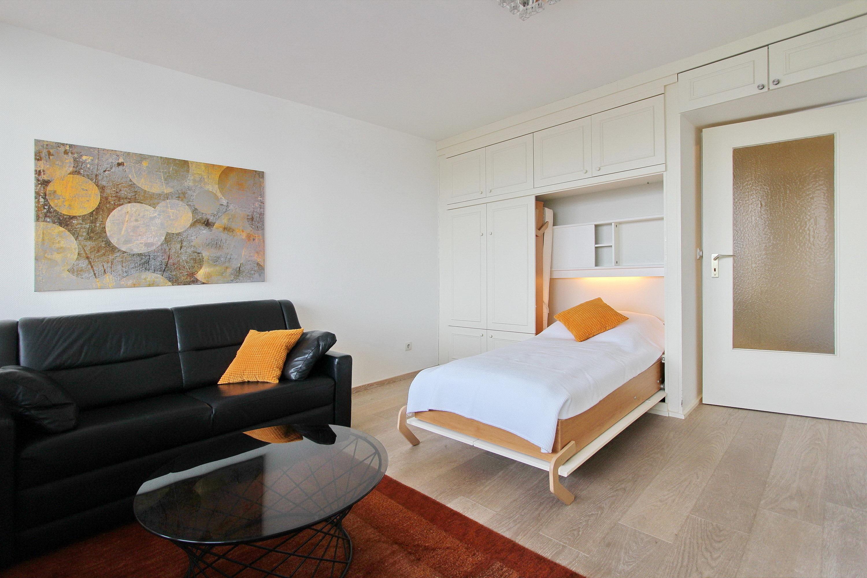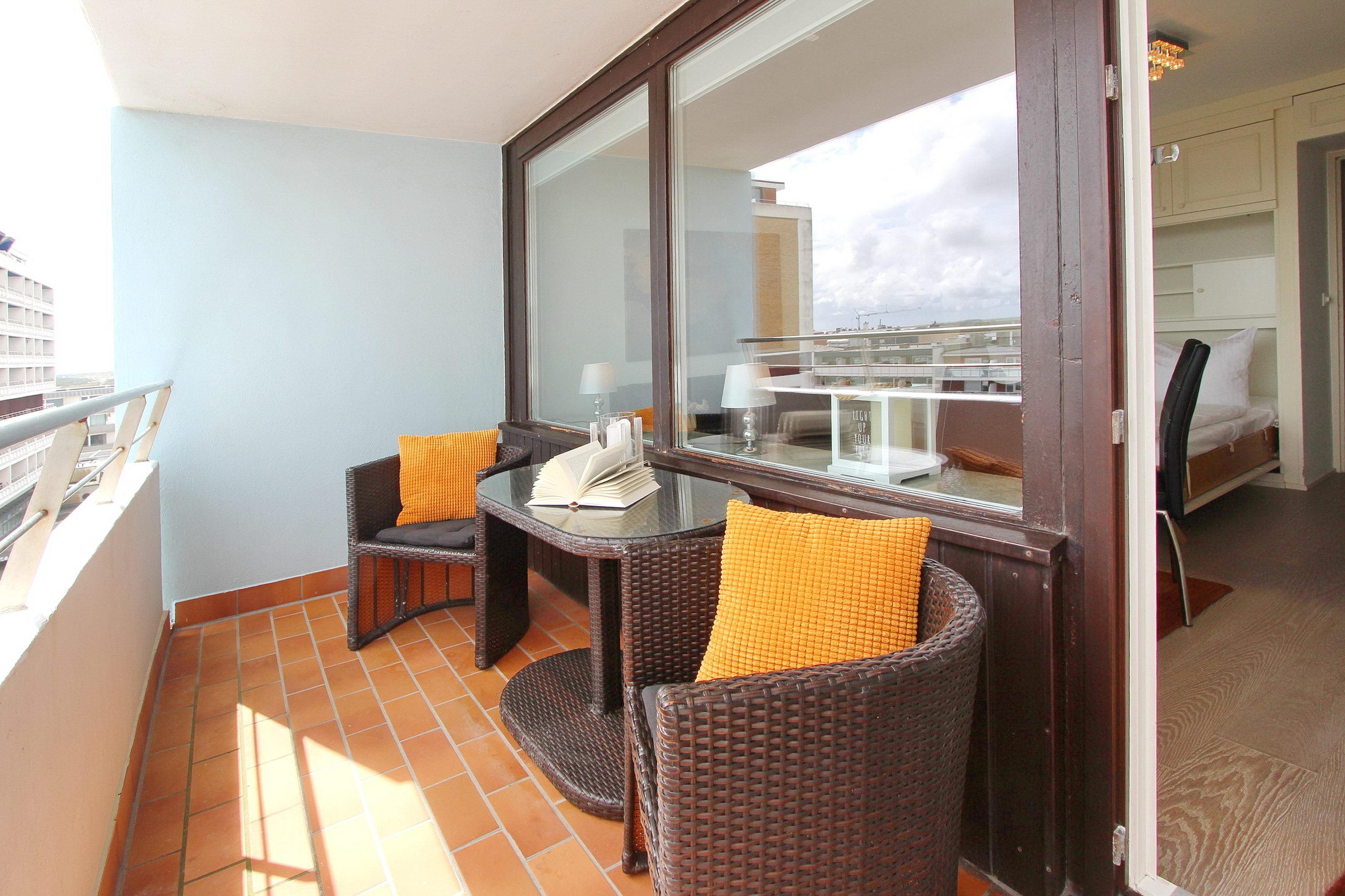 Diese hell und freundlich eingerichtete 1 Zimmer Wohnung befindet sich in der 4. Etage des Haus Metropol. Der kombinierte Wohn-/Schlafraum mit Laminatboden hat einen vorgelagerten großen Ostbalkon mit Lounge-Balkonmöbeln. Einzelschrankbetten und ausreichen Stauraum für ihre Habseligkeiten stehen ihnen zur Verfügung. In die Schrankwand integriert ist ein ausziehbarer Esstisch (der nur bei Bedarf ausgeklappt werden kann) mit 2 Stühlen. Eine bequeme Ledercouch steht direkt am Fenster. Das helle Badezimmer verfügt über eine Dusche. Im Flur befindet sich eine kleine Einbauküche mit Ceranfeld, Backofen und Geschirrspüler. Zur technischen Ausstattung dieser Nichtraucherwohnung gehört: ein Flachbildfernseher. Ein freies WLAN Netzwerk (WEG Haus Metropol - Passwortfrei - ohne Gewähr) steht ihnen kostenfrei zur Verfügung. Wohnungsgröße: 30 m².